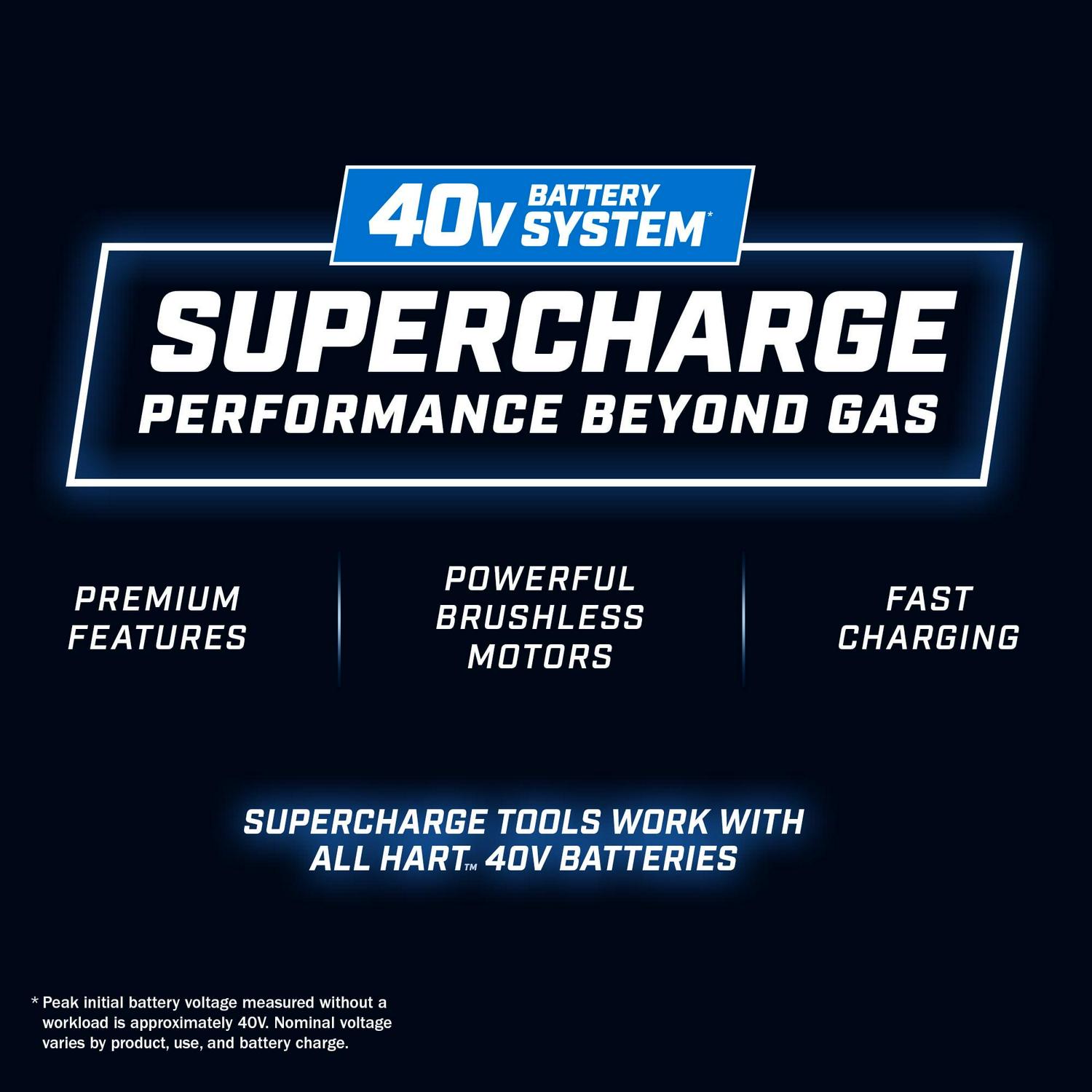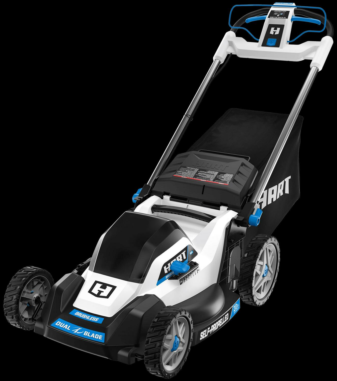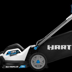 Looking for a sleek and powerful self-propelled mower Check out the HART 40V 20” Self-Propelled SUPERCHARGE Dual Blade Mower. This premium cordless mower comes with dual blades for a clean and precise cut, 4X faster charging, and over ½ acre of runtime. You can also choose between bagging, mulching, or side-discharge and take advantage of the on board battery storage for user convenience. Other features include single-point height adjustment with a cutting range from 1.5 to 4 , an improved handle design for quick and easy storage, and easy access bag removal. Plus, this is the first HART mower that comes with 8.0Ah battery, but it also works with all HART 40V batteries. Best of all, it comes with a 5 year tool warranty and 3 year battery warranty.