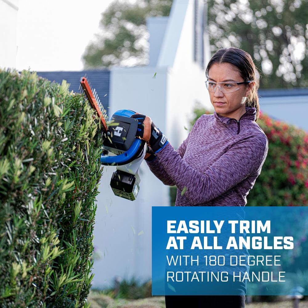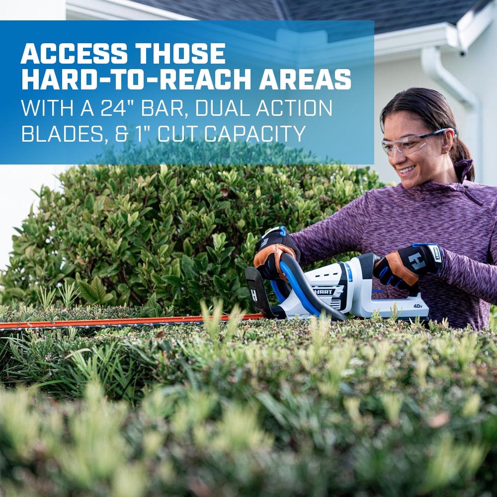 The HART 40V Cordless Hedge Trimmer gives you the best of both worlds with both power and convenience! At a cutting speed of 3,200 strokes per minute and an aggressive, there is no job too hard to handle. This 24-inch Hedge Trimmer comes equipped with Dual Action Blades for less vibration, which results in less user fatigue and allows you to get the job done faster. It also features a 180° rotating handle, giving you the ability to trim at all angles and make precise cuts. The HART 40V Cordless Hedge Trimmer is part of our 40V System where you get All power, no gas! Includes 24-inch Hedge Trimmer.