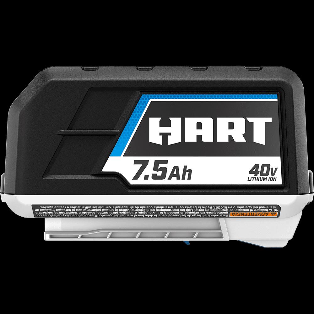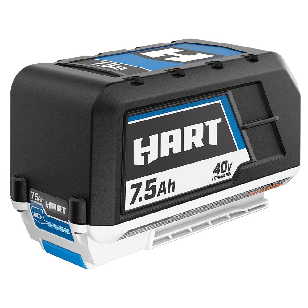 The runtime limits have been pushed even further. HART s 40-Volt 7.5Ah Battery gets 3X more runtime than the 40-Volt 2.5Ah battery, while delivering the same fade-free power and performance. So, you can power through any yard maintenance project you decide to take on. This makes it ideal for power tools with higher energy needs, such as 40-Volt cordless mowers, blowers, and more. And just like other HART 40-Volt Batteries, this 7.5Ah lithium-ion battery has a built-in, 4-bar fuel gauge to check the remaining battery charge. You ll always know when it d time to switch batteries. This battery is compatible with all HART 40-Volt cordless outdoor tools and 40-Volt chargers. With a limited 3-year warranty, you can see why there s never been a better time to go cordless. Get ALL POWER, NO GAS with the HART 40-Volt 7.5Ah Battery. (Product sold as a single battery and does not include tool or charger.)