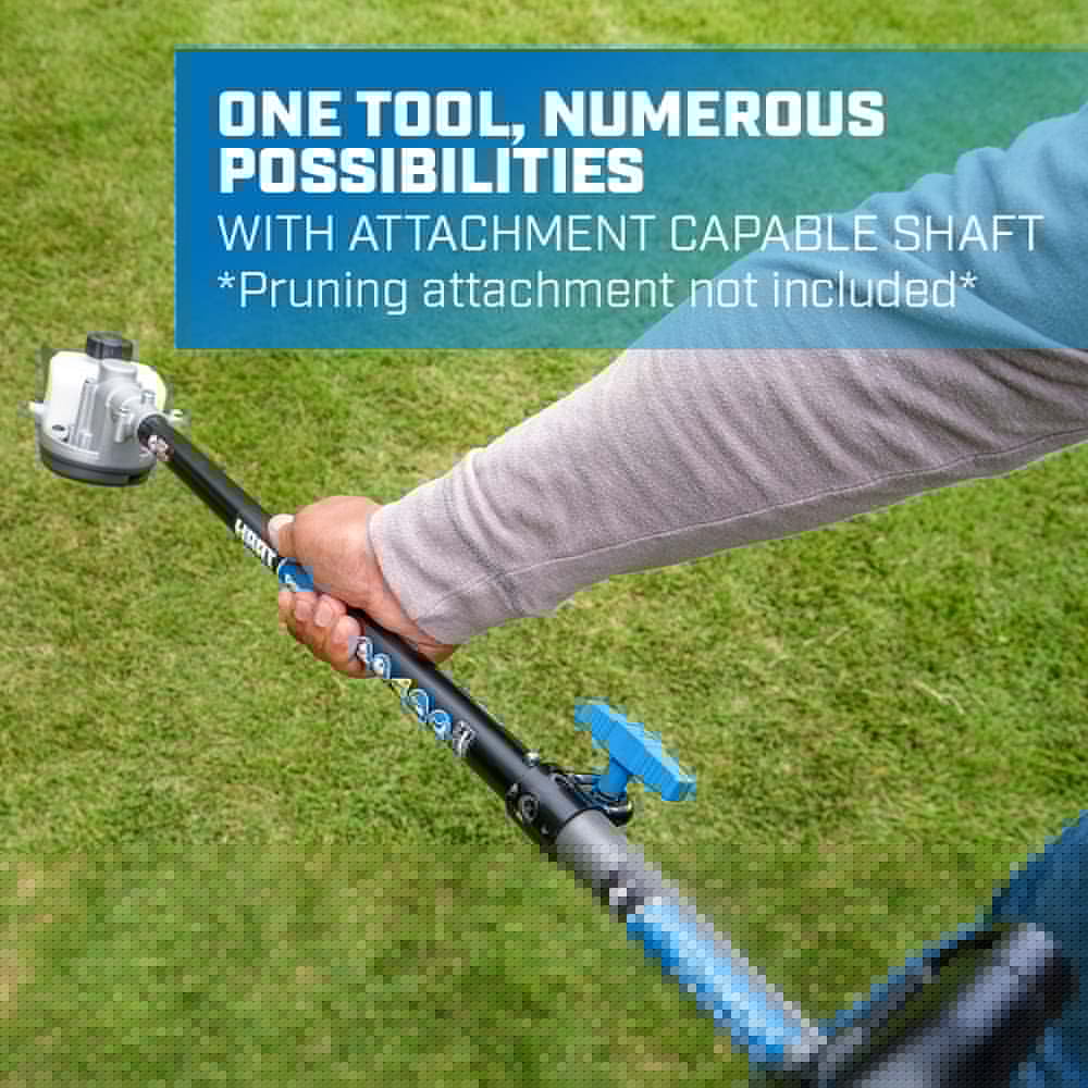 A string trimmer that replaces a gas unit with more versatility and convenience. This 15-inch string trimmer can easily be adjusted to a 13-inch cut swath for more runtime and is ideal for users with medium yards. Attachment Capability allows the user to use their 40V power head with up to 6 other attachments, including a cultivator, blower, edger, and more (all sold separately). Users have ultimate control and easy trimmer line replacements with variable speed trigger and easy loading bump feed head. The Brushless Motor Technology provides more power, longer runtime and longer motor life. All a part of the 40V System where you get ALL POWER, NO GAS. Includes 15-inch string trimmer, (1) 4.0Ah battery and charger.