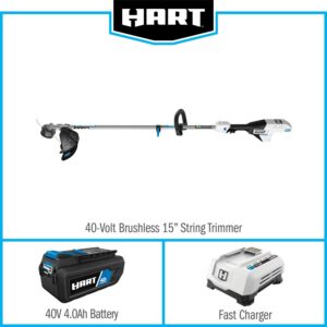 HART 40 Volt Cordless Brushless Attachment Capable 15-inch String Trimmer Kit, (1) 4.0Ah Lithium-Ion Battery