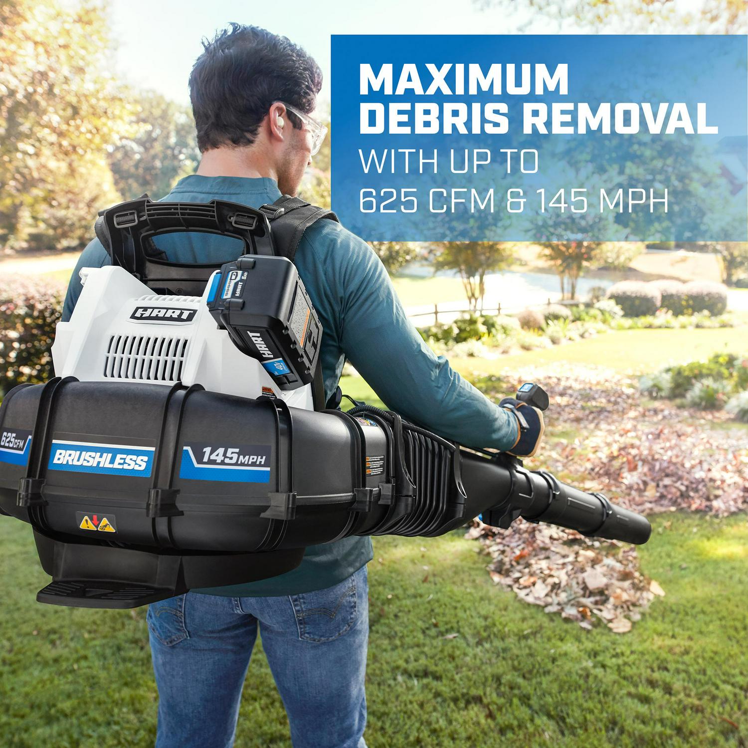 Rely on our Brushless Backpack blower to be used on larger yards with heavier debris. Quiet operation at 59dB makes this blower as quiet as a conversation. The brushless motor provides 625 CFM and 145 MPH of power. With a variable speed trigger and cruise control, the user gets ultimate power AND control. The additional battery port gives the user the option to use an additional 40V battery for maximum runtime. All a part of the 40V System where you get All Power, No Gas.