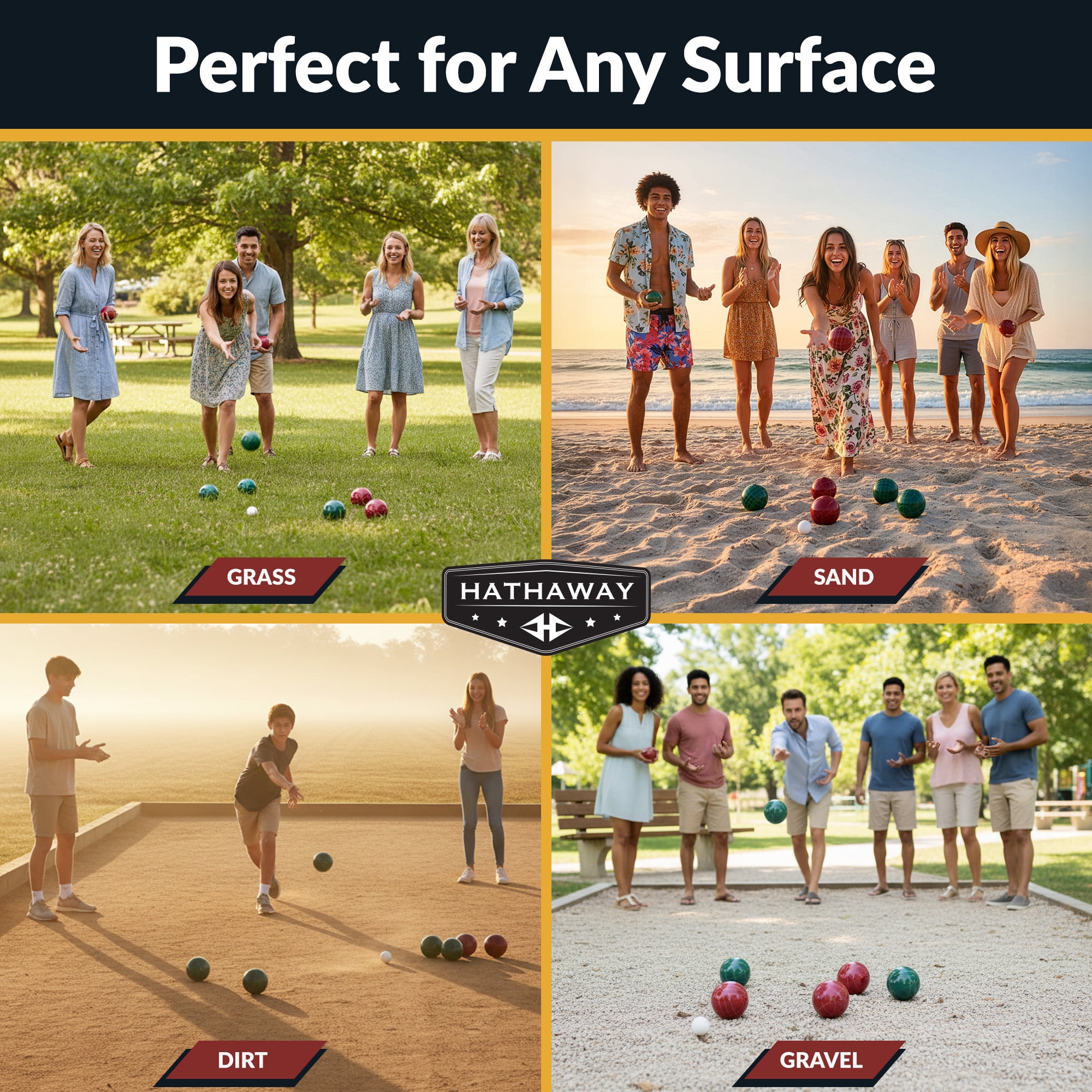 The Hathaway Bocce Ball game is a great way to enjoy the outdoors while having some exciting competitive fun. One of the oldest forms of lawn bowling, Bocce Ball is a fun easy game to play for all ages. The game originated in Italy and has now become a very popular game worldwide. This set includes 8 bocce balls, 4 for each team, and one white Pallino target ball. The entire set is enclosed within a durable nylon carrying case for easy transport and storage.