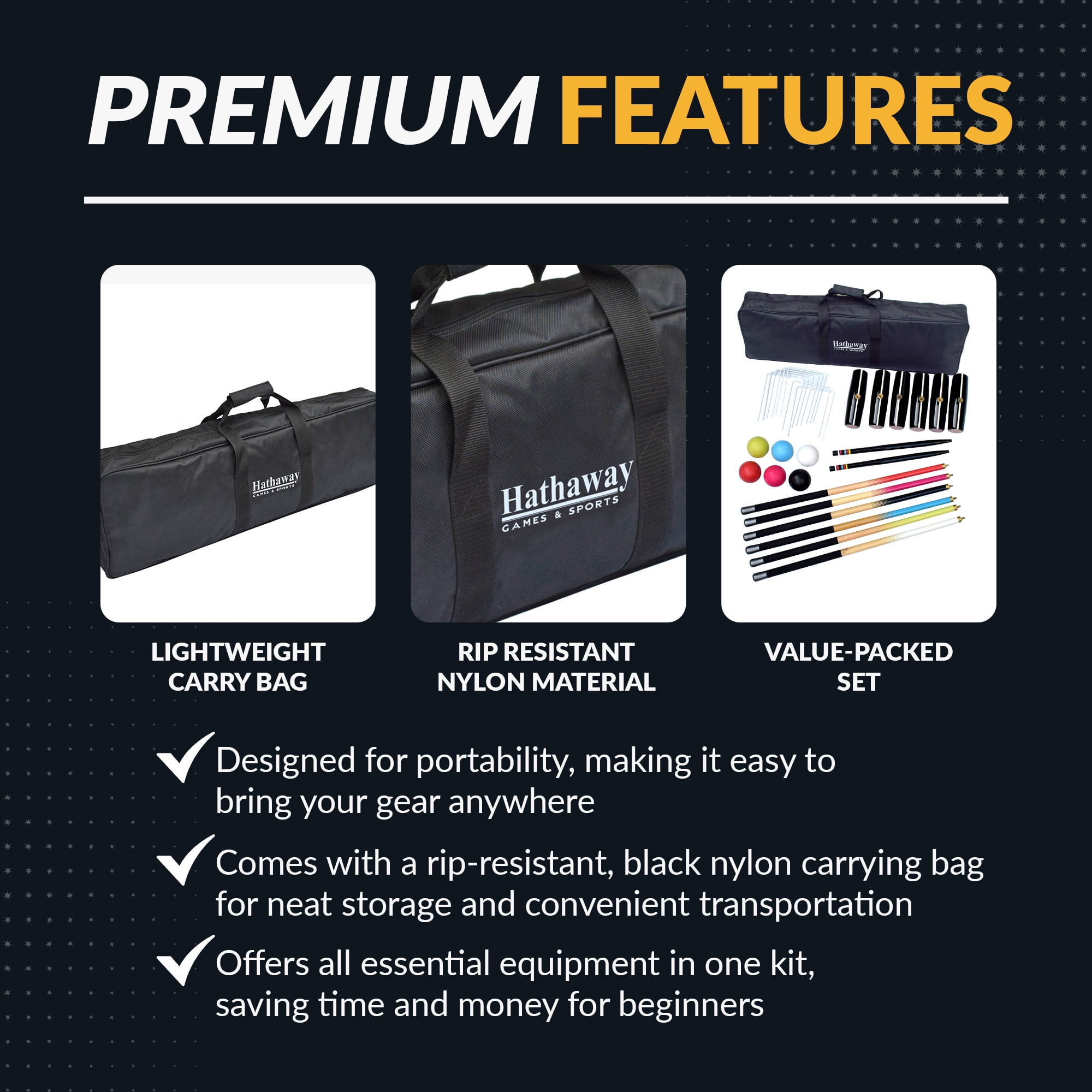 The portable Hathaway Deluxe 6-player Croquet Game Set is a top-quality, full-size croquet set for those looking to play the game of croquet at a high level. This beautifully-crafted set is extremely durable and constructed from the highest quality of materials. Includes everything you need to transform your yard into a competitive croquet court. The 6 high-density hardwood mallets with solid hardwood shafts are color coded with matching balls. The set features (6) 3-1/3-in polymer balls, 9 extra-heavy, powder-coated wickets, 2 goal stakes and a durable rip-resistant nylon carrying case for convenient transport and storage. Ideal for larger groups looking to experience a high level of croquet game play. Carry your set with you on all outings for croquet fun anytime!