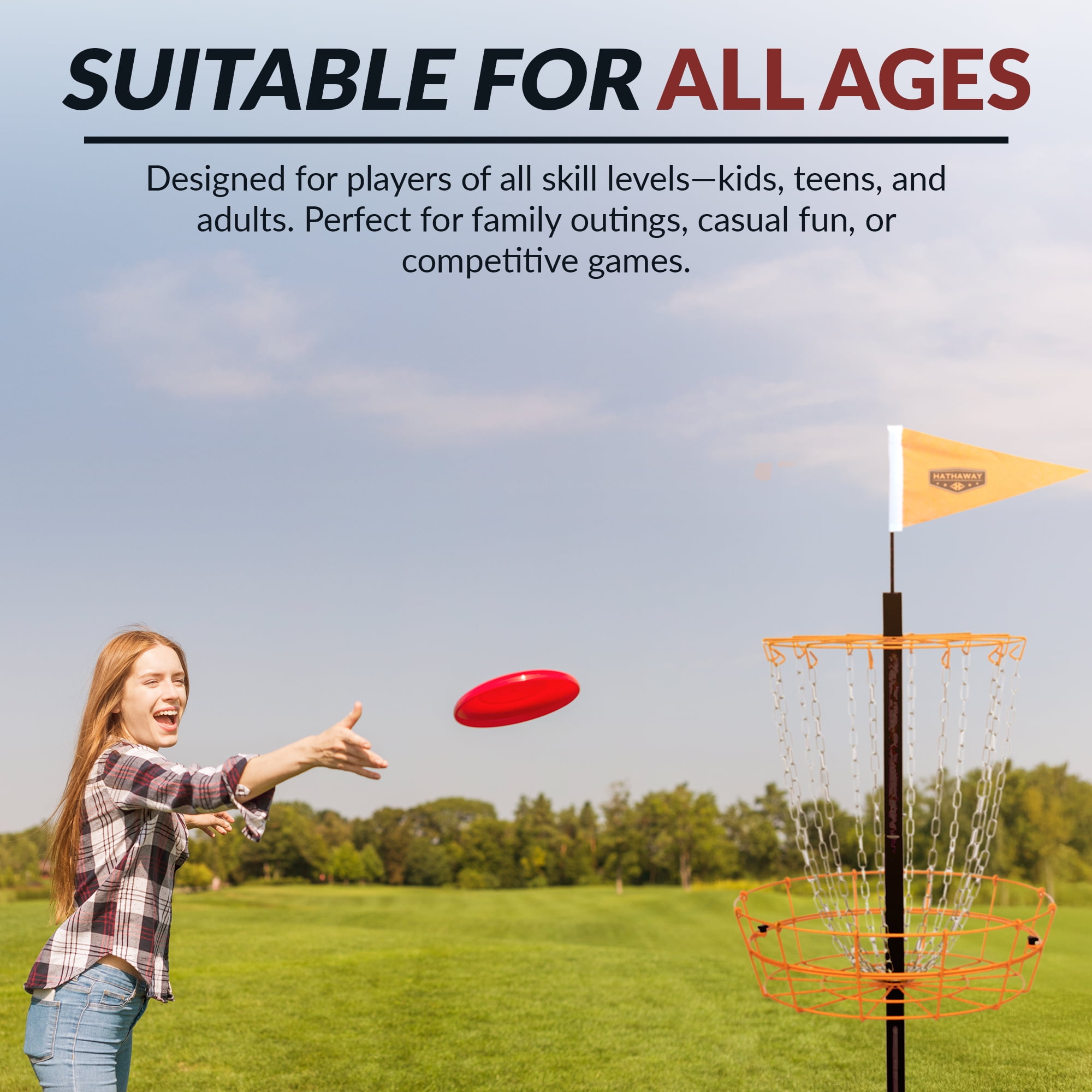 Enjoy hours of fun at backyard barbecues and family gatherings with the Hathaway Disc Golf Set. It is the perfect game for any outdoor event. This challenging game involves concentration and strategy, yet promises fun and engaging competition for players of all ages. This set comes complete with everything you need to play the game. The heavy-duty steel target consists of 12 deflecting chains and a 24-in scoring basket. The set comes with 6 discs featuring contoured edges that are weighted and balanced for ideal grip and accurate flight. Designed to handle any specific shot required – putt/approach mid-range and long-range shots. Extremely quick to set up or take down and fits nicely in the convenient rip-resistant nylon carry bag. The portable Disc Golf Set design is perfect for practice or competitive action!