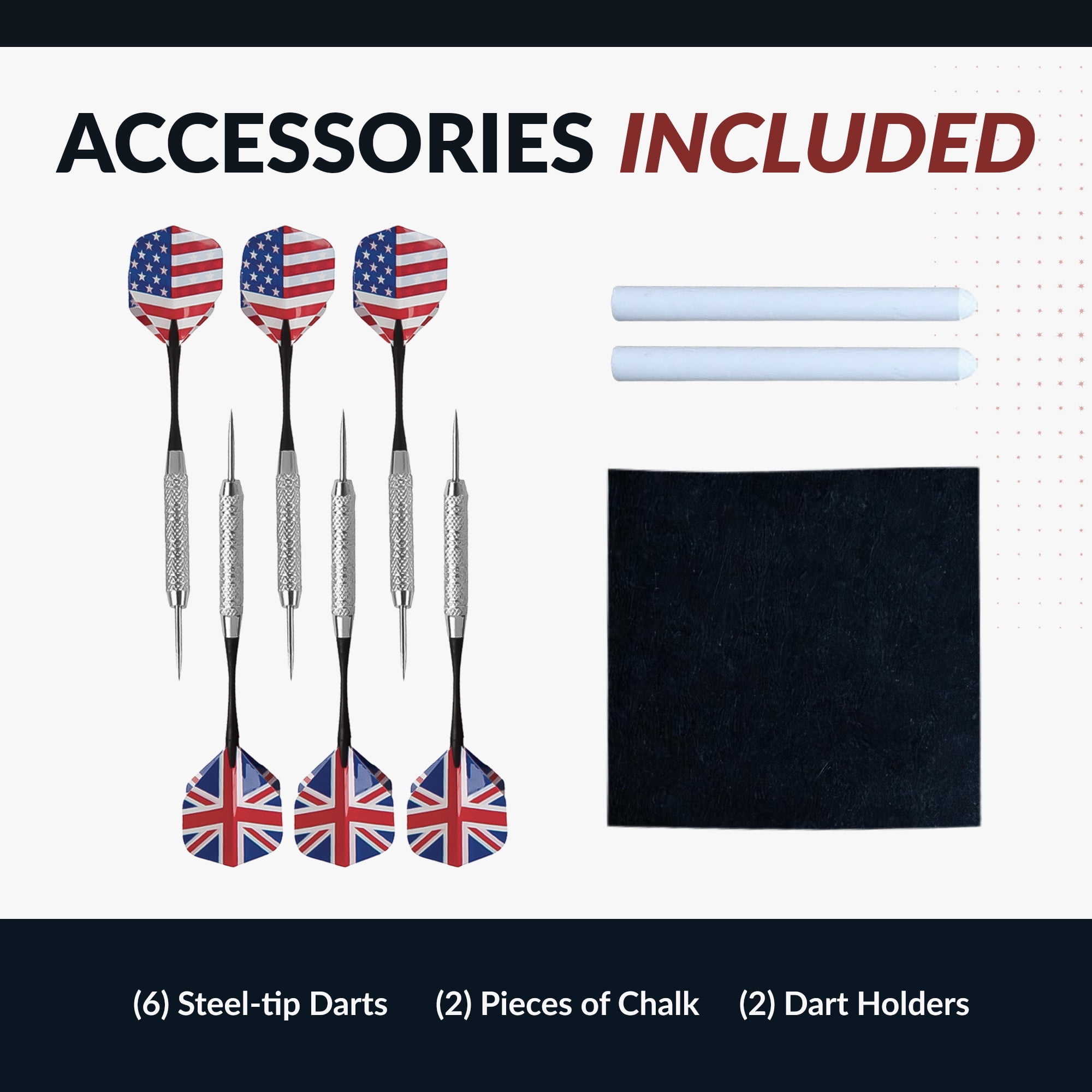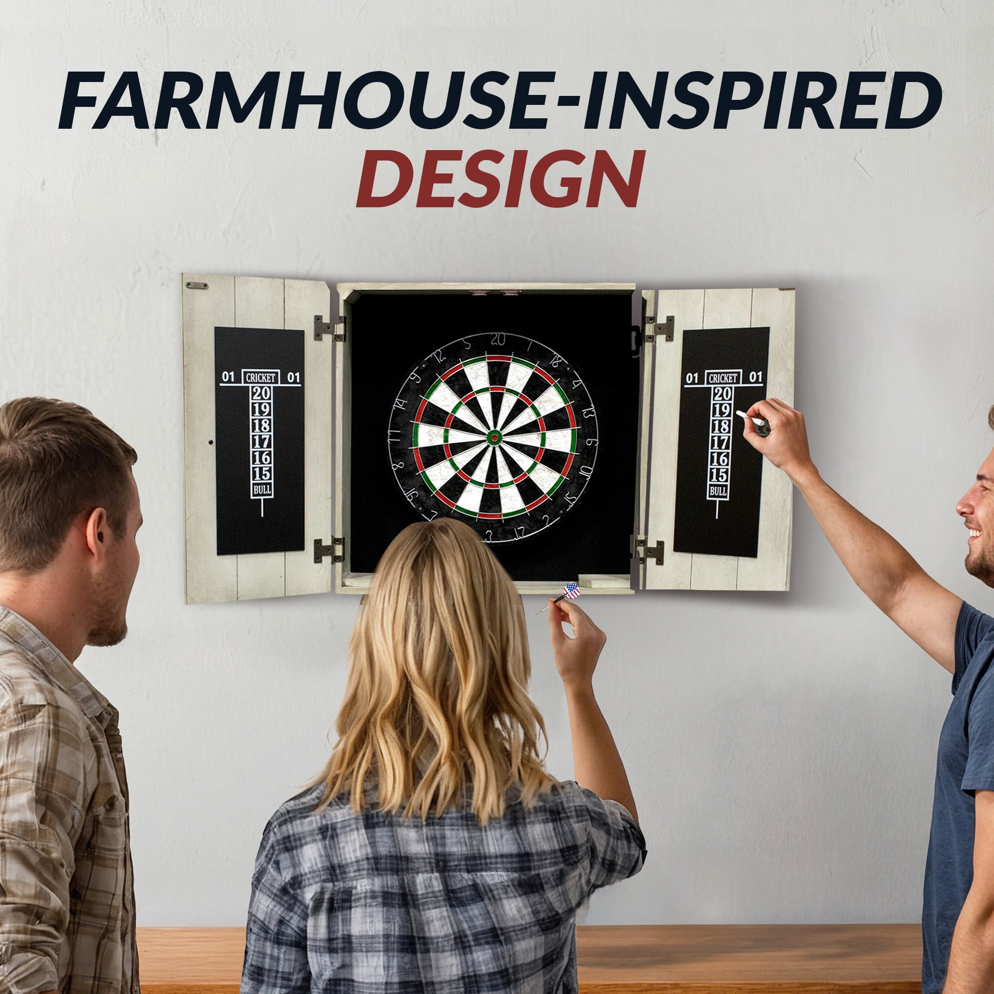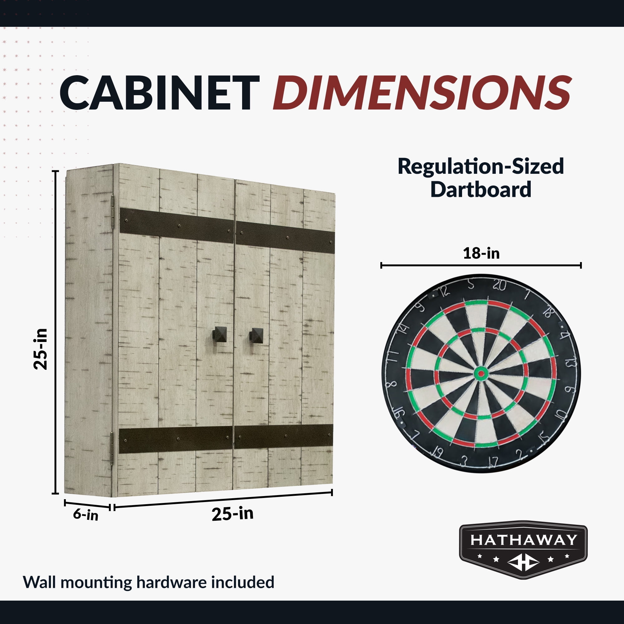 The Hathaway Drifter Solid Wood Dartboard & Cabinet Set is the perfect way to elevate your game room. Handcrafted from reclaimed, solid poplar wood and accented with aged iron hardware. It is handsomely finished in rustic timber wood. This high quality, furniture-grade cabinet offers dual protection. It conceals and protects your dartboard when not in use, while protecting your back wall during dart play. Includes everything you need to play a competitive game of darts.