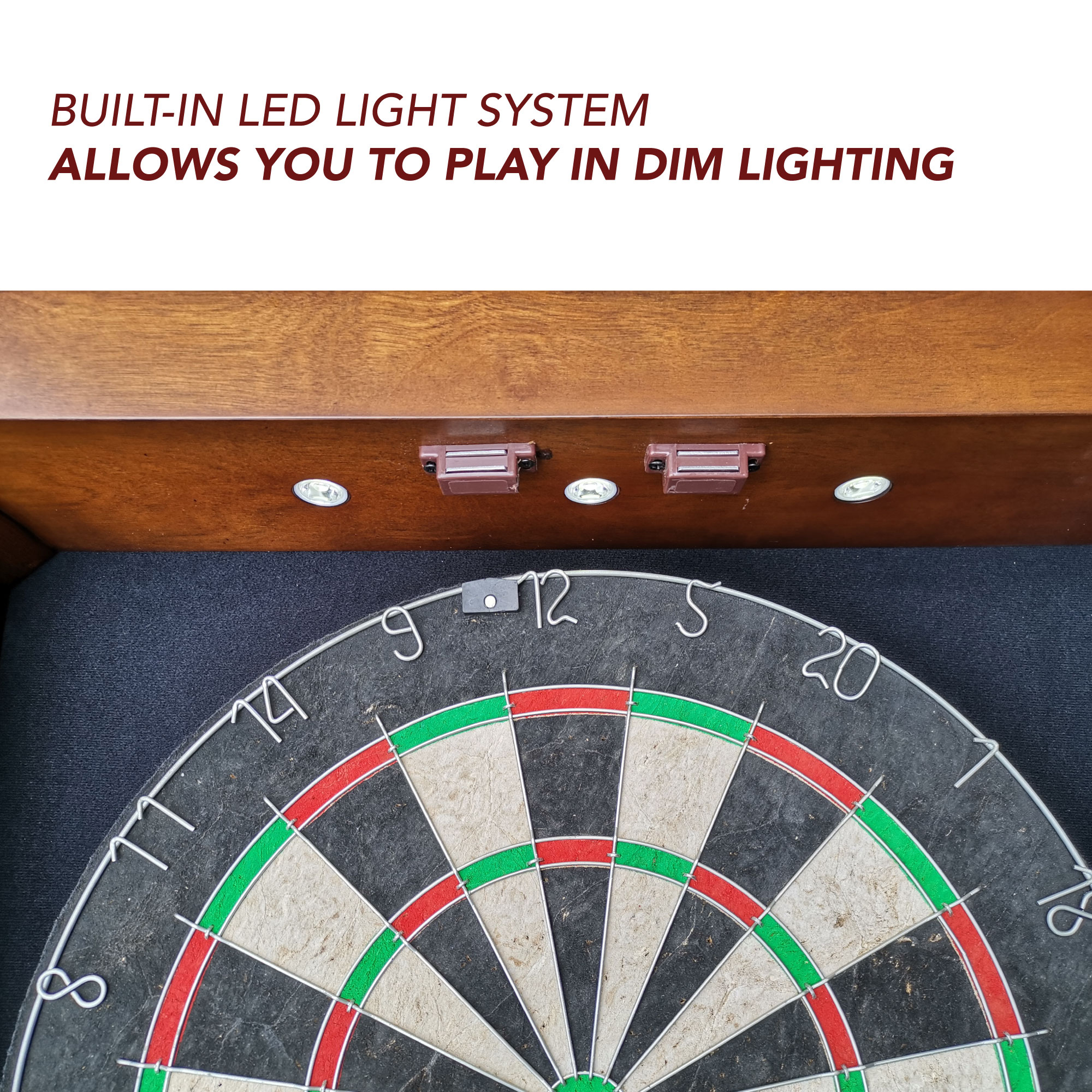 Add authentic pub style to your game room, rec room, or man cave with the Farmington Dart Cabinet Set. This handsome cabinet is handcrafted from solid, poplar wood, accented with matte-black hardware, and finished in a walnut stain. Farmhouse-inspired doors conceal your dartboard and accessories when not in use. The black, felt-lined backboard protects your wall during play. Allowing you to play in dim lighting, the Farmington’s unique lighting system is the finishing touch to your pub-inspired space. A regulation-sized and self-healing sisal dartboard is great for tournaments or casual competitions. Two, chalk scoreboards are conveniently mounted on each door. Includes everything required for a regulation darts game. 180-day limited warranty.
