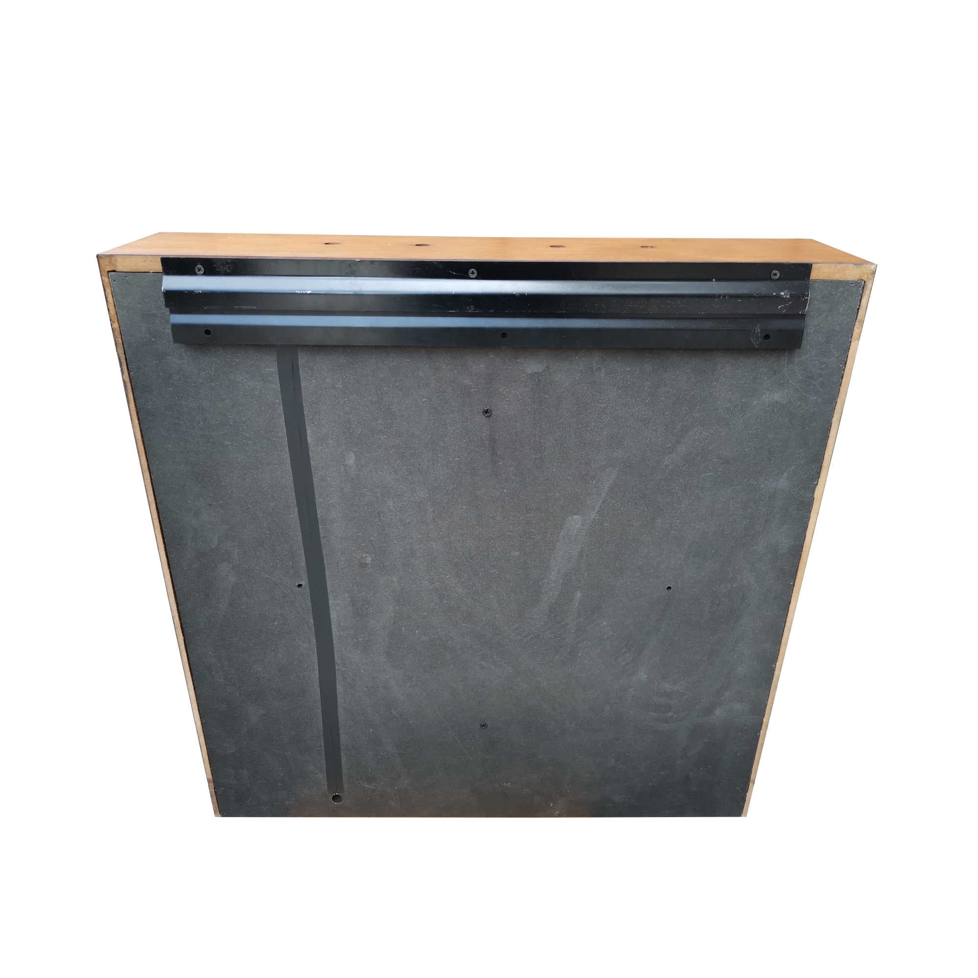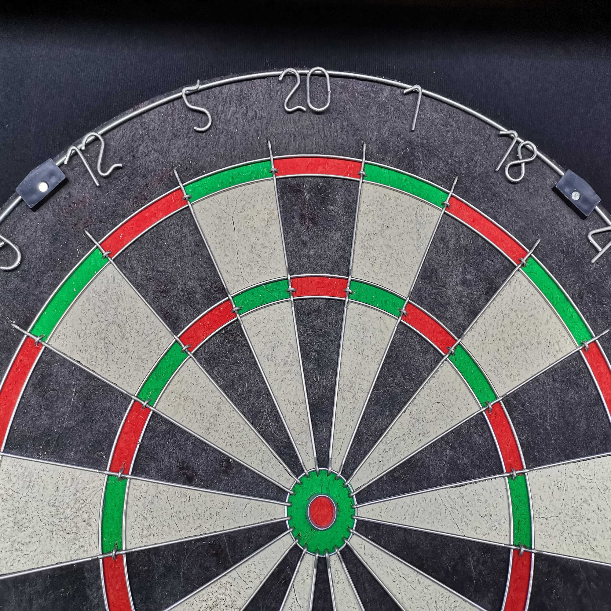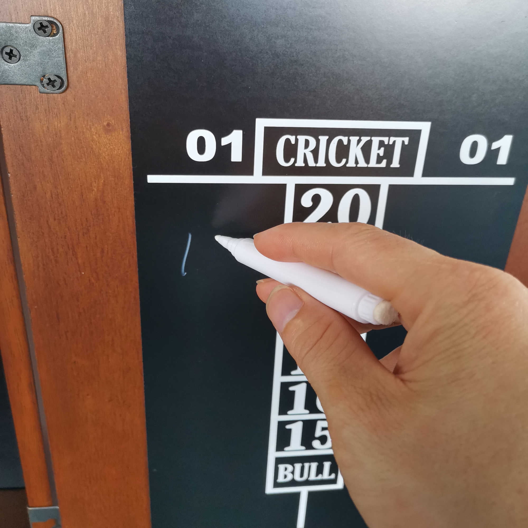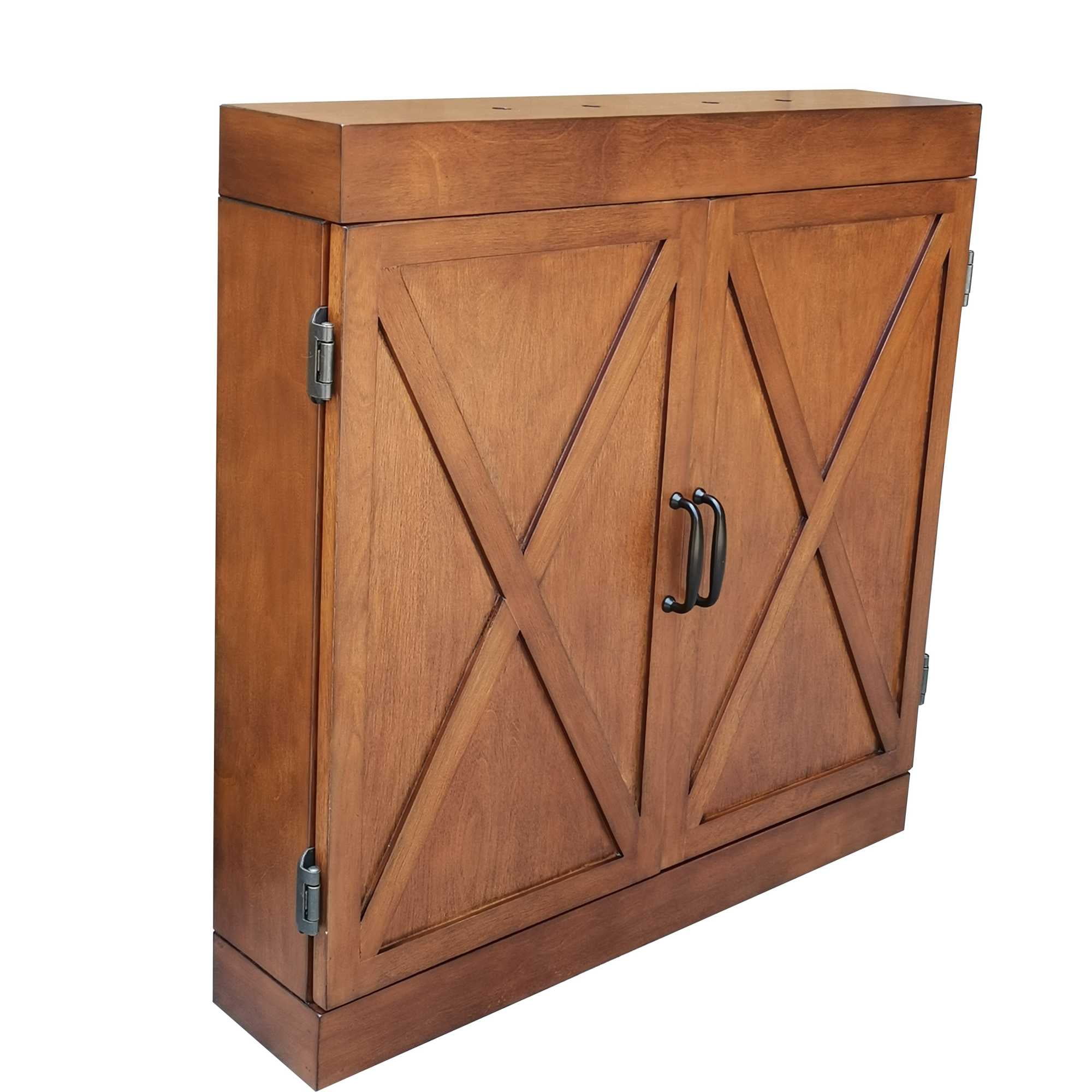 Farmhouse-inspired dart cabinet set Unique, LED light system is powered by (4) AA batteries (not included) Regulation, 18-in, sisal fiber bristle dartboard Constructed from solid, poplar wood with veneers Matte-black hardware Dual chalk scoreboards and built-in dart holders on each door Rotatable number ring for even board wear Wall mounting hardware included Cabinet dimensions: 24-in L x 23.75-in W x 5-in D 180-day limited warranty