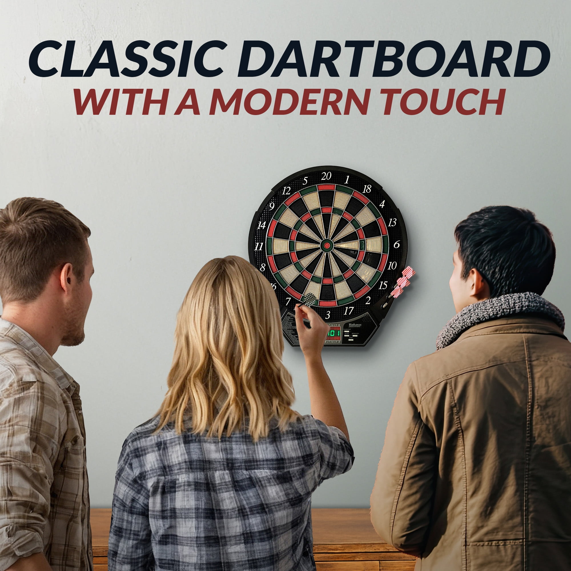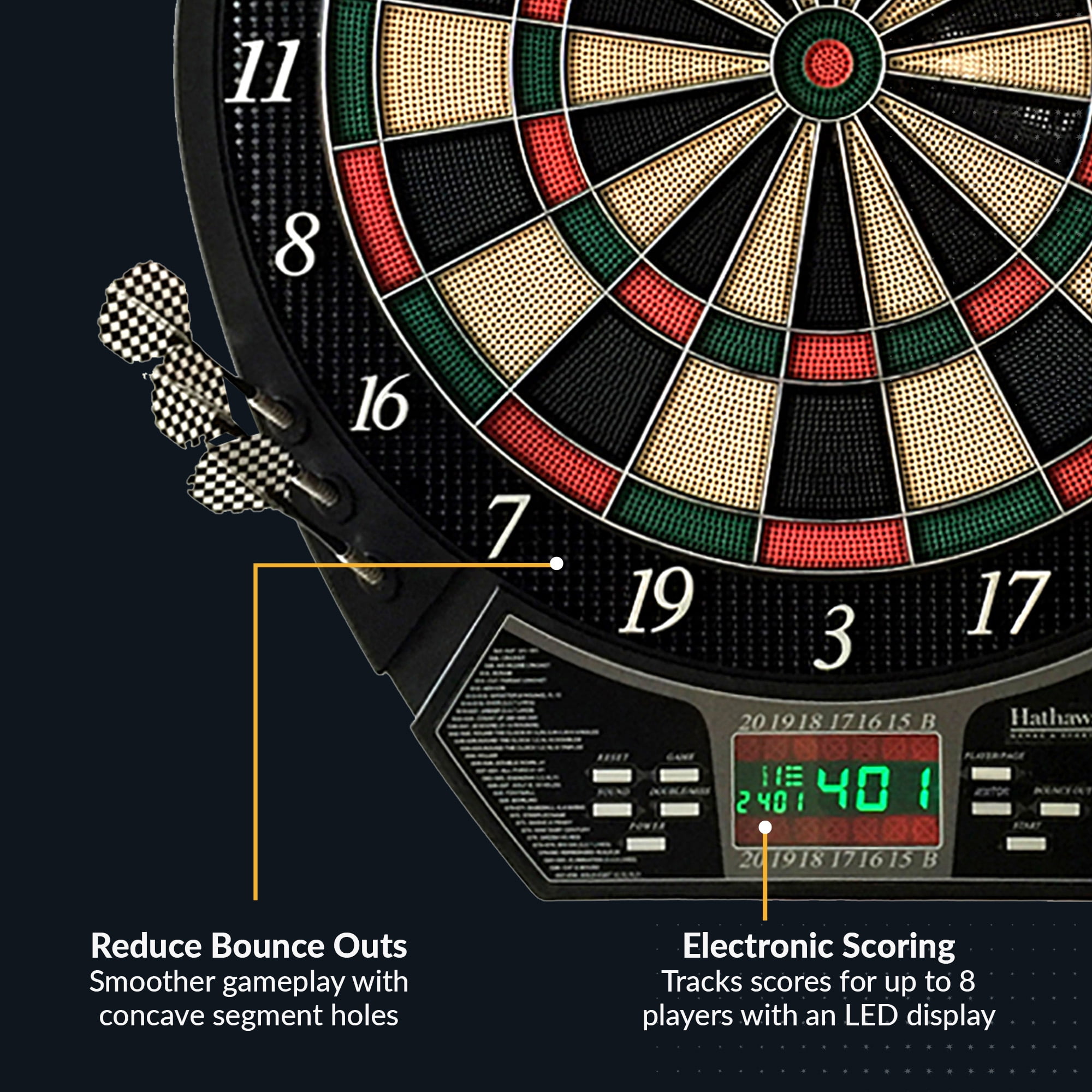 The Adult Hathaway Magnum Electronic Dartboard is a lightweight version of dart fun, weighing in at less than 7-lbs. This product is easy to carry from place to place and can be powered by either electricity or batteries. All you need is a spot to hang the board and your fun begins. With a host of game options, this electronic scoring dartboard will accommodate up to 8 players. Comes with 2 sets of soft tip darts.