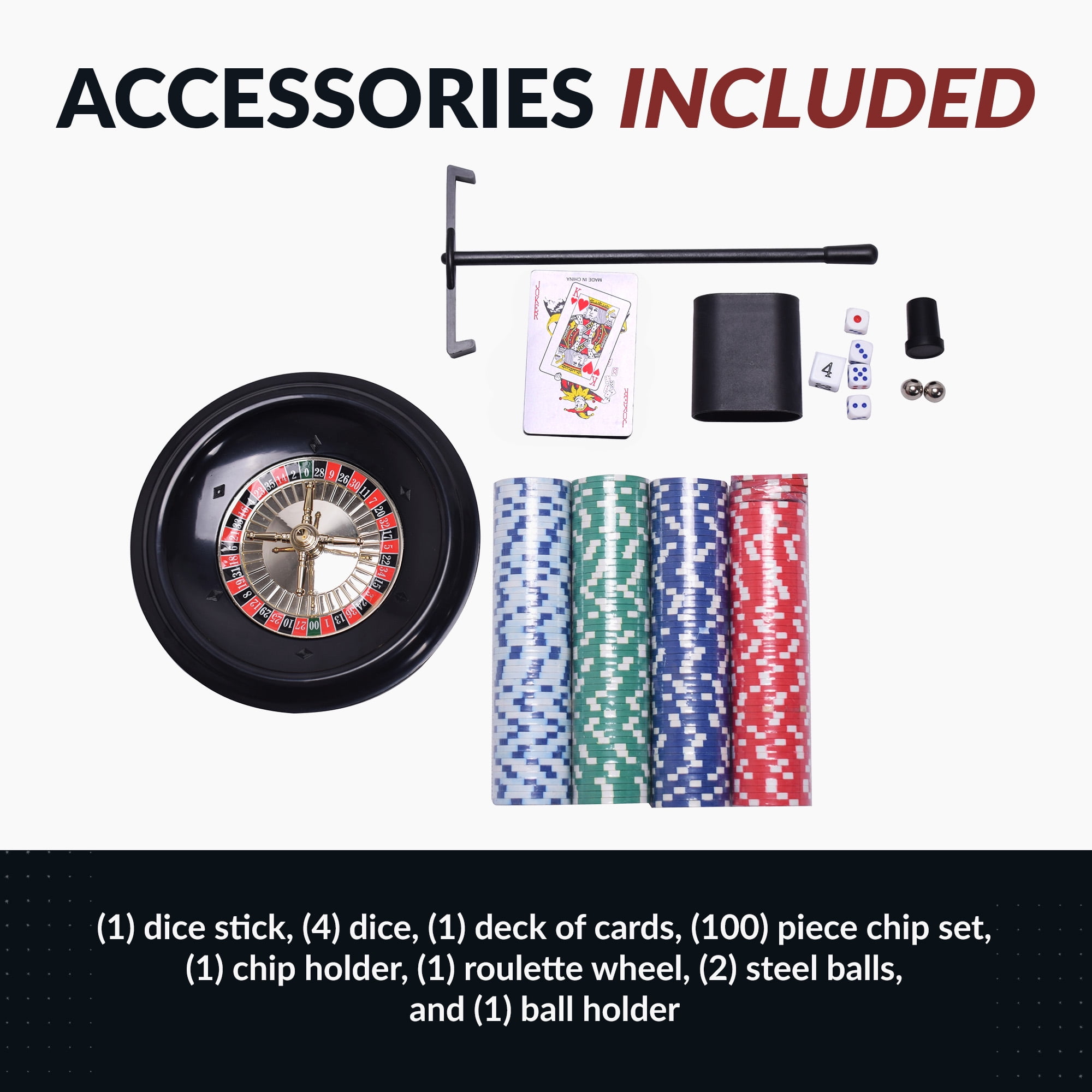 Playing surface: 40.625 L x 14 W inches Table dimensions: 47.75 inches L x 21 inches W x 36.625 inches H Durable black PVC melamine cabinetry fully supported by rigid pedestal style legs with Silver accent trim Scratch-resistant Formica top great surface for drinks or snacks 2-1/4-in stabilizing leg levelers make quick table leveling on any surface 12-in Roulette wheel with digitally printed green felt Roulette layout Digitally printed green felt with Blackjack layout includes dealer and 6 player positions Digitally printed green felt with Craps layout accurately displays betting possibilities