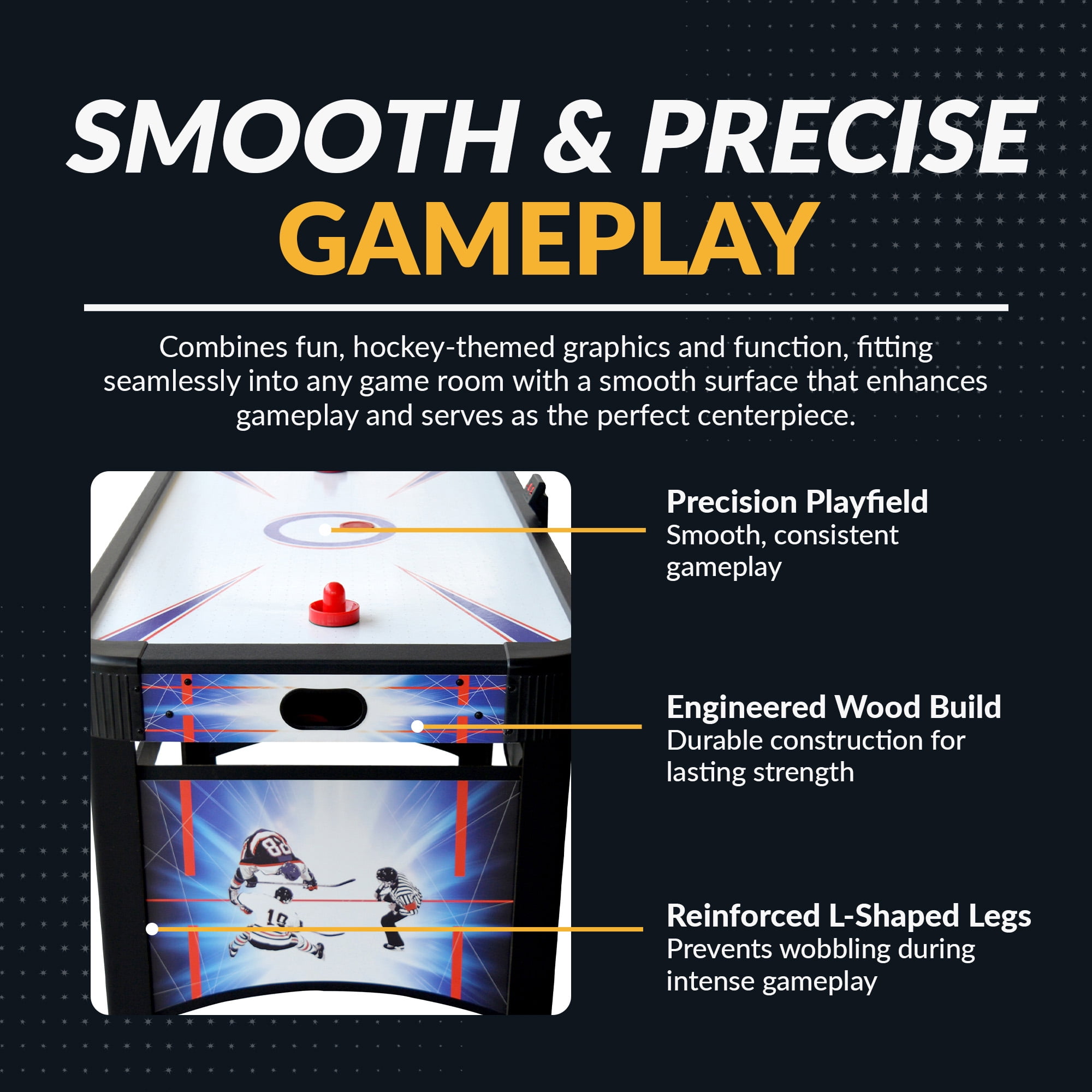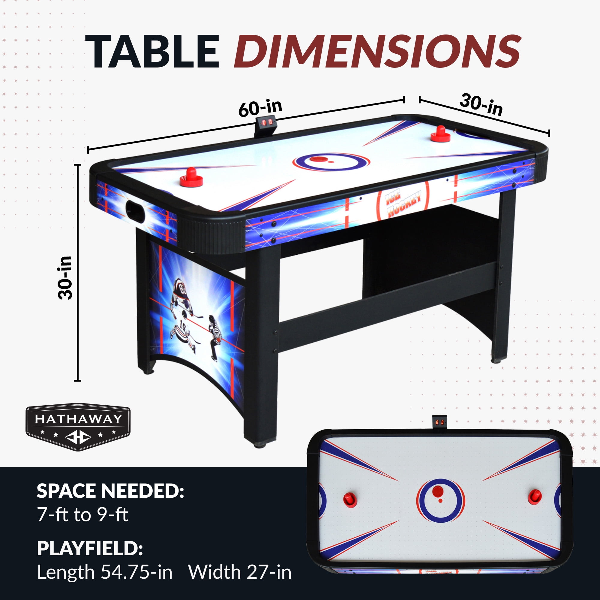 Playing surface: 60-in L x 30-in W; Table dimensions: 60-in L x 26-in W x 31-in H Constructed of 1/8-in CARB certified MDF material with laminate coating Reinforced sturdy L-shaped legs with large independent levelers for stable game play Dual goal boxes with built-in automatic puck return system 110V UL-approved high-output electric blower Automatic, electronic scoring system; (2) AAA batteries required (not included) Quick and easy to assemble INCLUDES: Includes 2 red strikers and 2 pucks; batteries not included