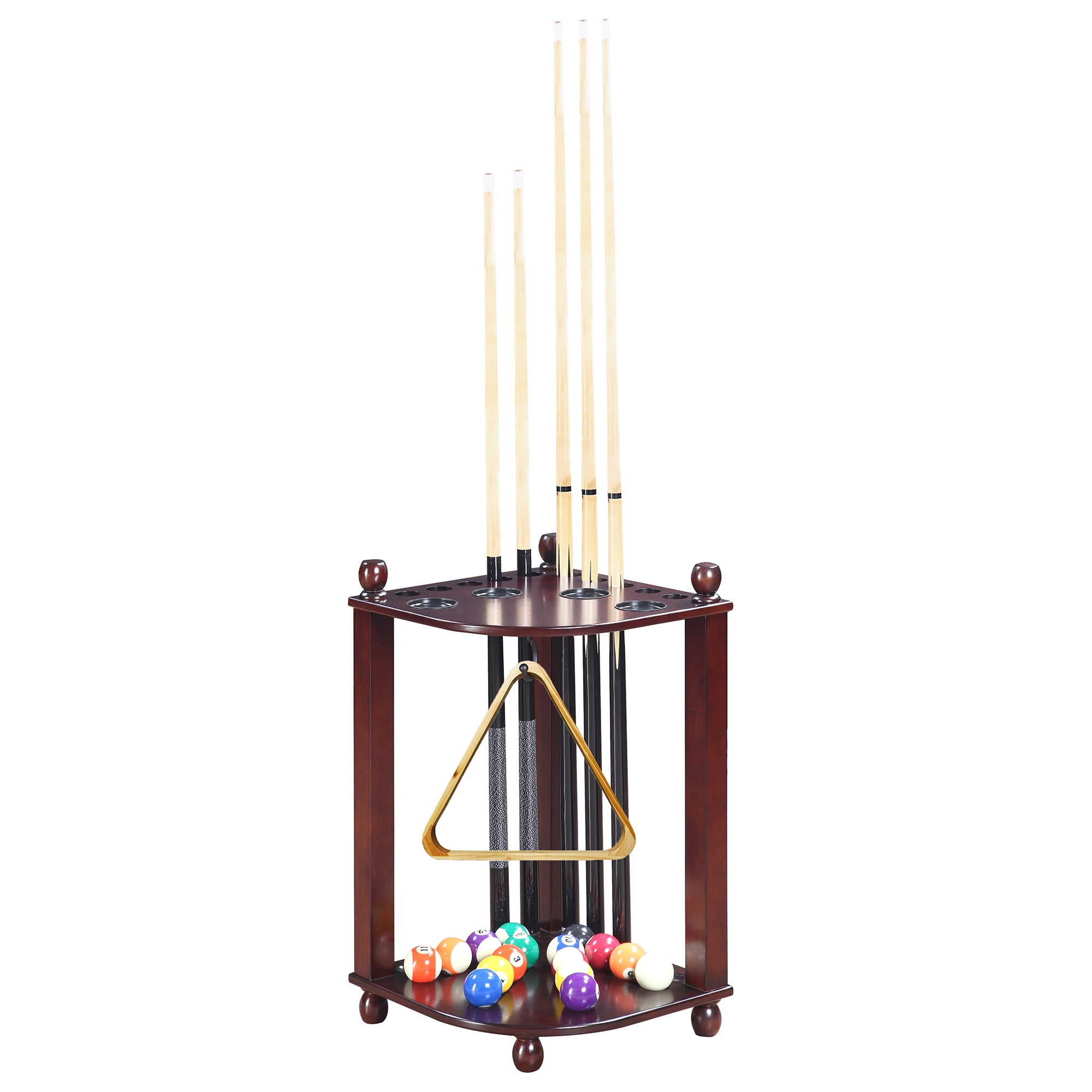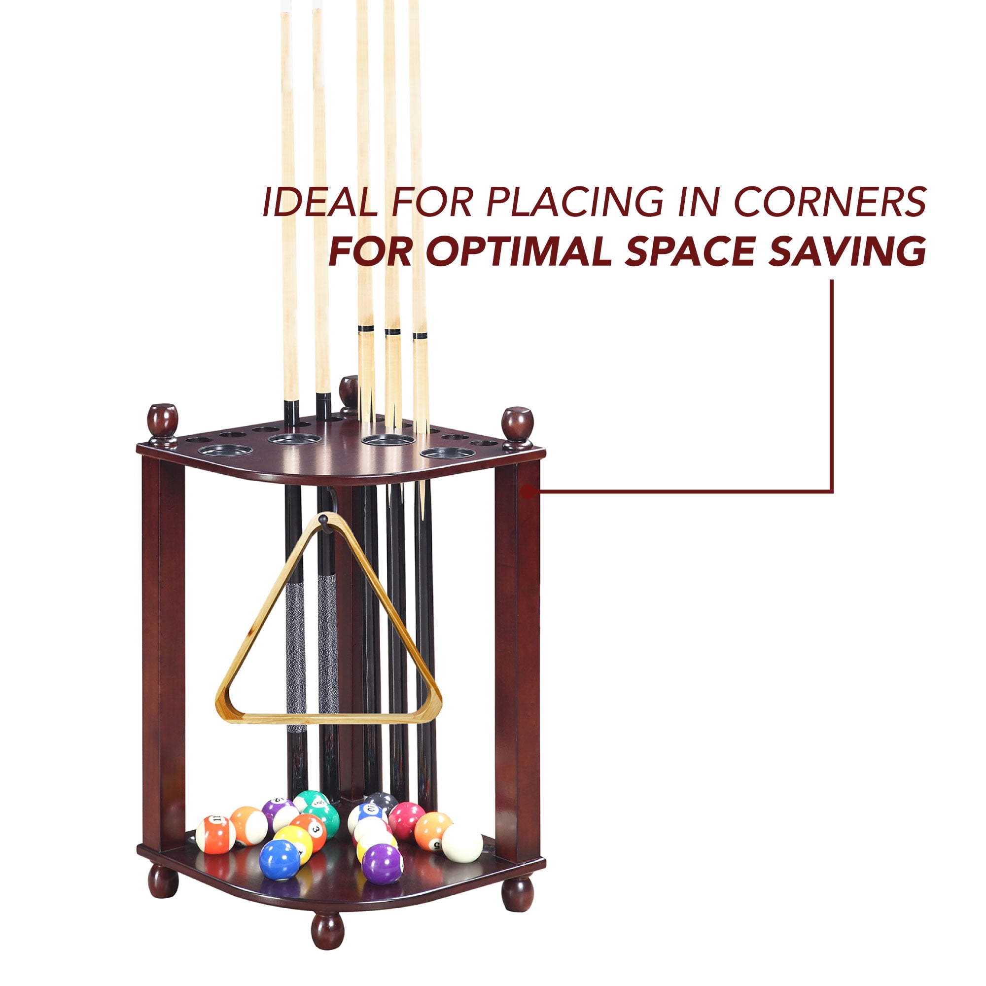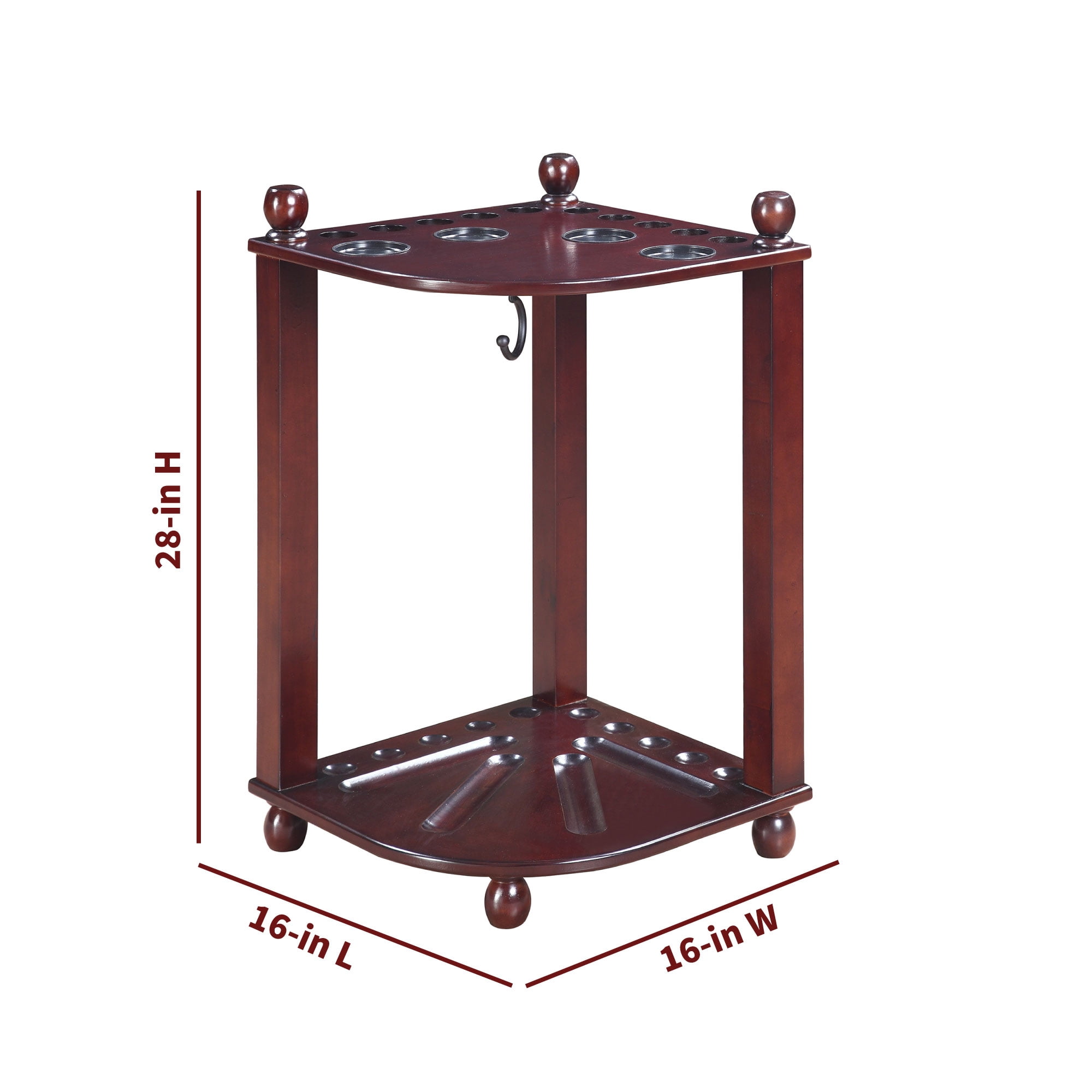 Dimensions: 16-in W x 16-in D x 28-in H Stylish design crafted from solid hardwood and hardwood veneers Holds 10 cues, 1 set of pool balls, 1 ball rack, and plenty of additional room for other accessory items 4 built-in drink coasters provides a convenient place for your drinks during play Includes 1 brass hook for ball racking triangle storage Quick easy assembly Available in 3 beautiful furniture finishes – Antique Walnut, Rich Mahogany or Black