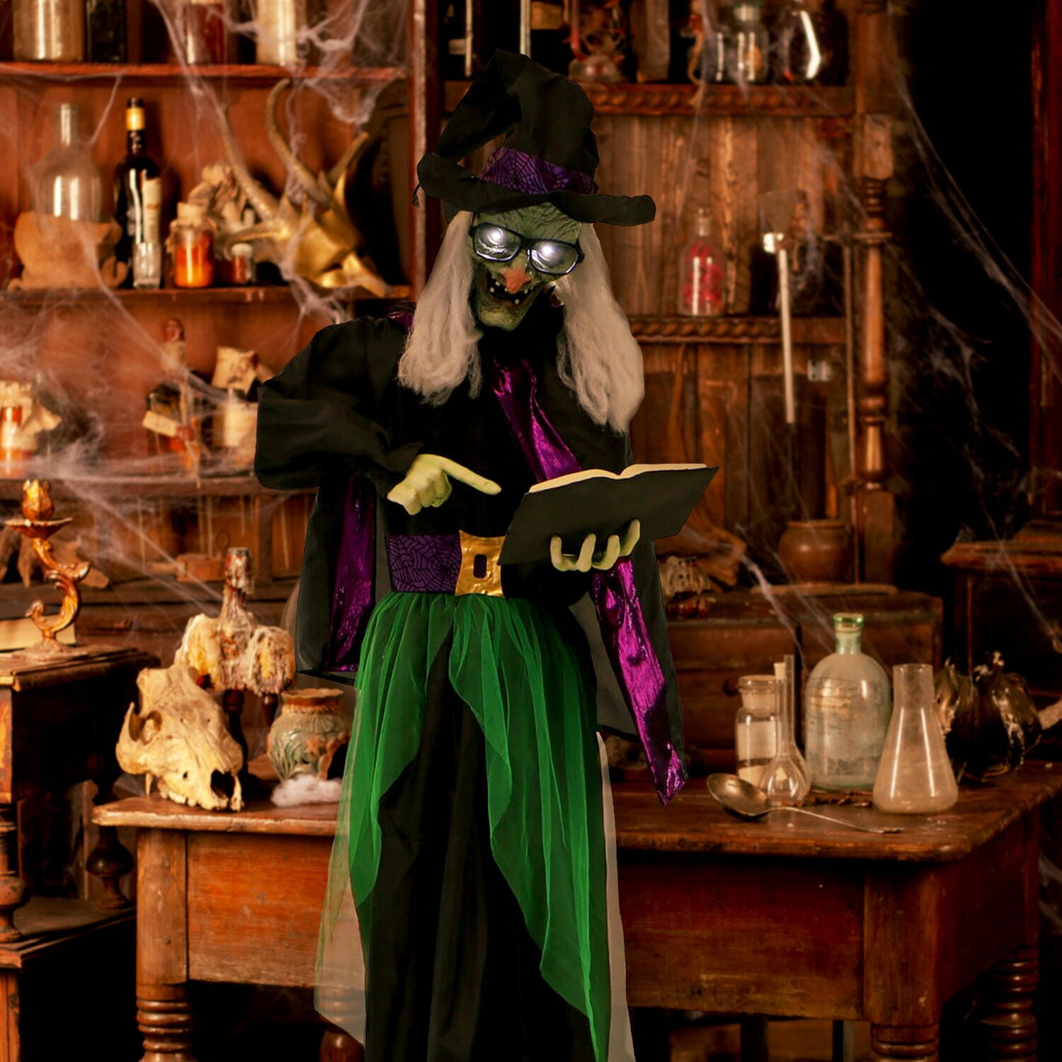 These blood curdling halloween witch props are sure to terrify any trick-or-treaters, co-workers, or customers. Greet visitors in a frighteningly festive way this Halloween. The horrifying hag’s eyes light up a wicked white while she moves her head with evil glee. Magda clutches a spell book tightly in her grip; bend her arms into a variety of positions for scares that last the entire season. Dressed in a typical black witch hat and gown and sporting an open-mouthed smile, green skin, long ratty hair, and a glasses, Magda will bewitch your guests with her terrifying looks alone. Invite her to your home this Halloween for the most startling, spirited holiday yet!