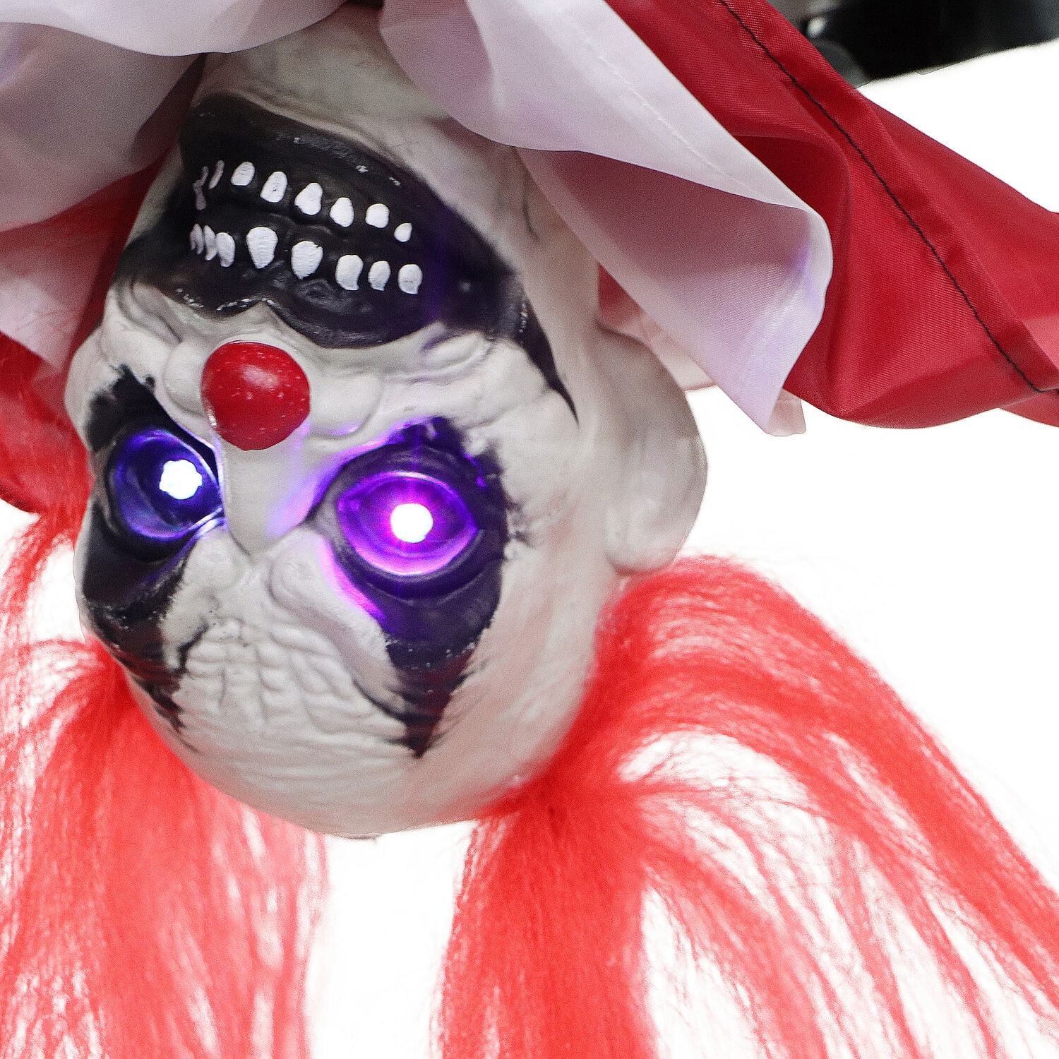 Hanging Animatronic: Be afraid. Be very afraid of our Scary Circus Clowns Collection. Flip, the upside-down talking clown, anxiously awaits the arrival of any trick-or-treater who dares knock on your door. Touch Activated: This touch-activated animatronic is eager to greet your visitors with a jump scare. Place this dreadful clown near your front door or on your covered porch to frighten all your family, friends and neighbors. Fully-assembled one-piece fright prop for easy setup – use the connection string to hang Flip on his trapeze from a tree, porch, overhang, or ceiling Battery Operated: For convenient display with no messy wires to trip over, this creepy fright prop operates on 3 AA alkaline batteries (not included). Indoor or covered outdoor display is recommended for longer prop life. Battery-operated animatronic for convenient display – no wires to trip over (3 AA batteries not included) Fully Assembled: One-piece fright prop arrives fully assembled for easy setup. Use the connection string to hang Flip on his trapeze from a tree, porch, overhang, or ceiling (mounting accessories not included). Multi-Function Prop: Flip the Clown speaks 4 spooky phrases, he turns his head from side to side, and he has color-changing LED eyes. Creepy circus music plays in the background to set the mood for your Halloween display (volume is not adjustable). Make a scene this Halloween with the Scary Circus Clowns Collection by Haunted Hill Farm Weighs 1.5 lbs.