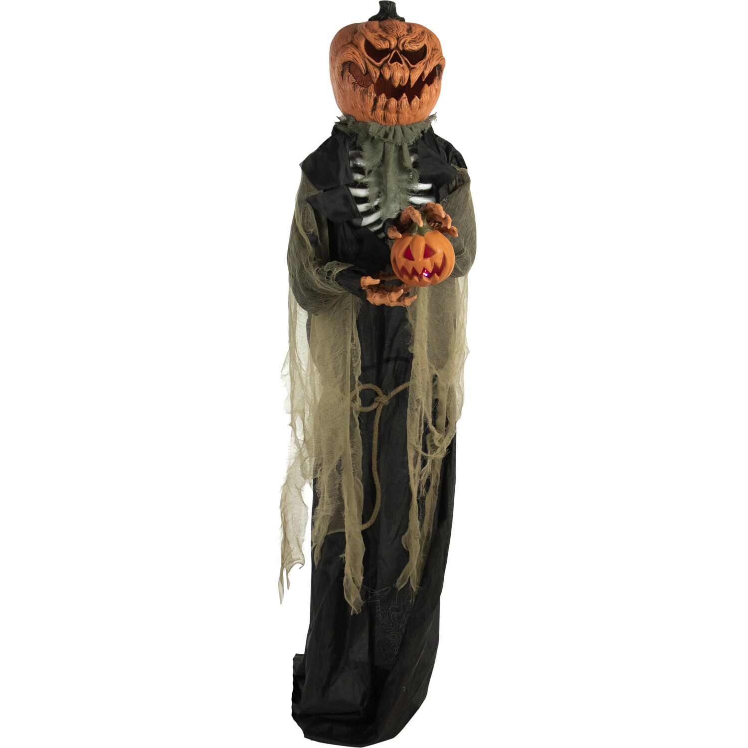 Be afraid. Be very afraid of Haunted Hill’s Haunted Cornfield Collection. Cursed many years ago, Jacko lives for eternity in half man, half pumpkin, form. Determined to scare any who stumble upon him, he greets visitors with creepy phrases and alarming shouts. “Surprise,” Jacko says. “It’s party time.” Life-Size Animatronic: Poseable Halloween Pumpkin man is perfect for your indoor or (covered) outdoor decor. Display your animated decoration in a variety of different scary and evil ways at your next party. Multi-Function: Creepy and spooky! This animated jack-o-lantern talks, lights up, moans, and has motion. He will turn your home into a haunted house in no time. Prop on the stand or hang in your garden/yard for a spooky cornfield or graveyard look. Touch Activated: Place your zombie-like scarecrow at your front door or along your walkway to delight and frighten trick or treaters. Activates by touch or from loud noise/motion like wind or the screams of scared people passing by! Features: Little pumpkin has multi-colored lights. Big Pumpkin head lights up red. “surprise its party time.” “Ooooo. it’s time for some fun now.” “OOOO. scared yah didn’t I.” “Yahhhhh. Didn’t see that coming.” 7 ft. animatronic pumpkin man for indoor and covered outdoor display Jacko is touch activated- Pumpkin head lights up red, smaller pumpkin flashes multi-colors, talks and shouts Upbeat voice greets visitors with four frightening phrases Phrase 1: “Surprise! It’s party time.” Phrase 2: “Ooooo. It’s time for some fun now.” Phrase 3: “OOOO! Scared yah, didn’t I?” Phrase 4: “Yahhhhh! Didn’t see that coming.” Torn black cloak exposes white bony rib cage Even skeleton fingers are a shade of pumpkin-orange Life-size figure can stand or hang to fit eerily into your Halloween decor