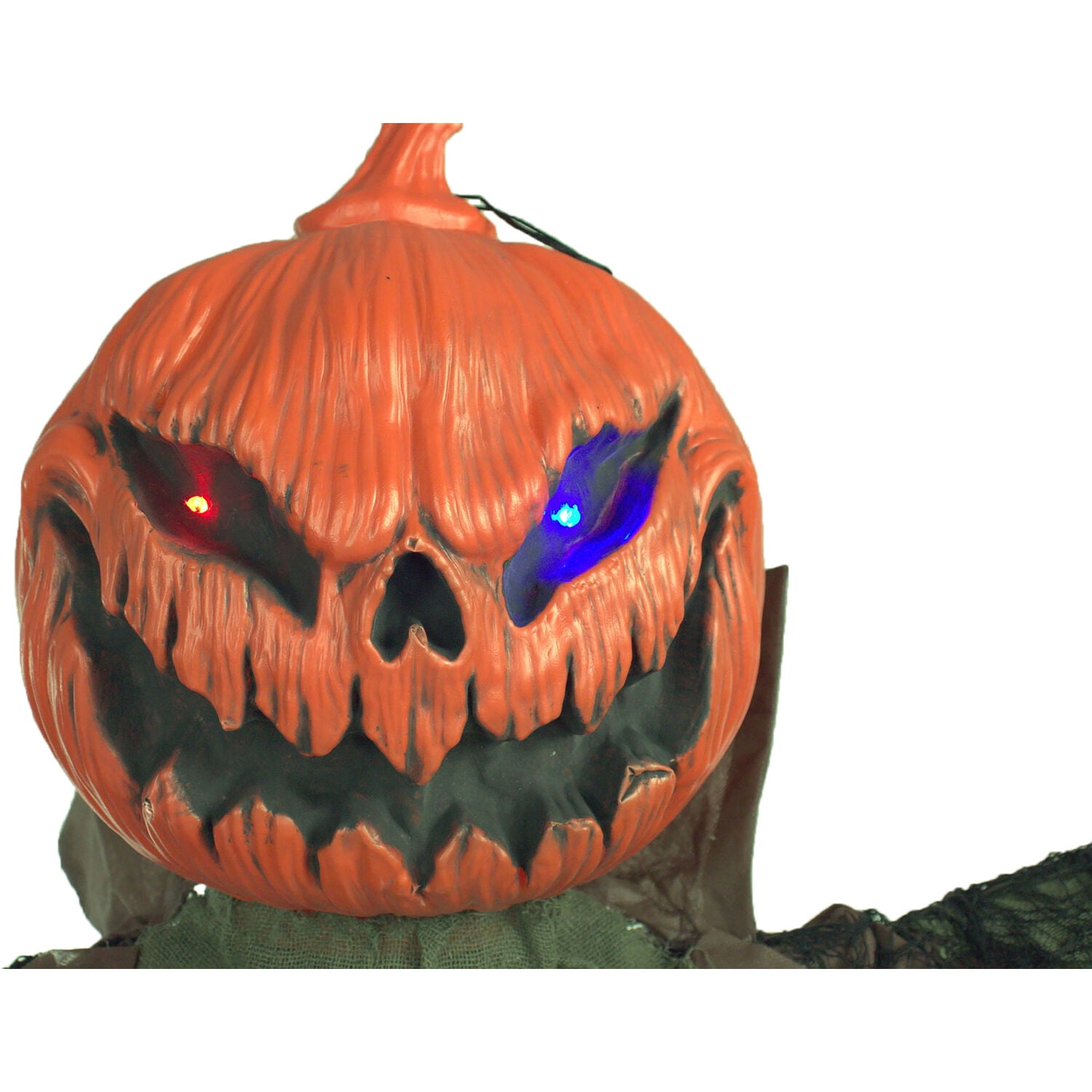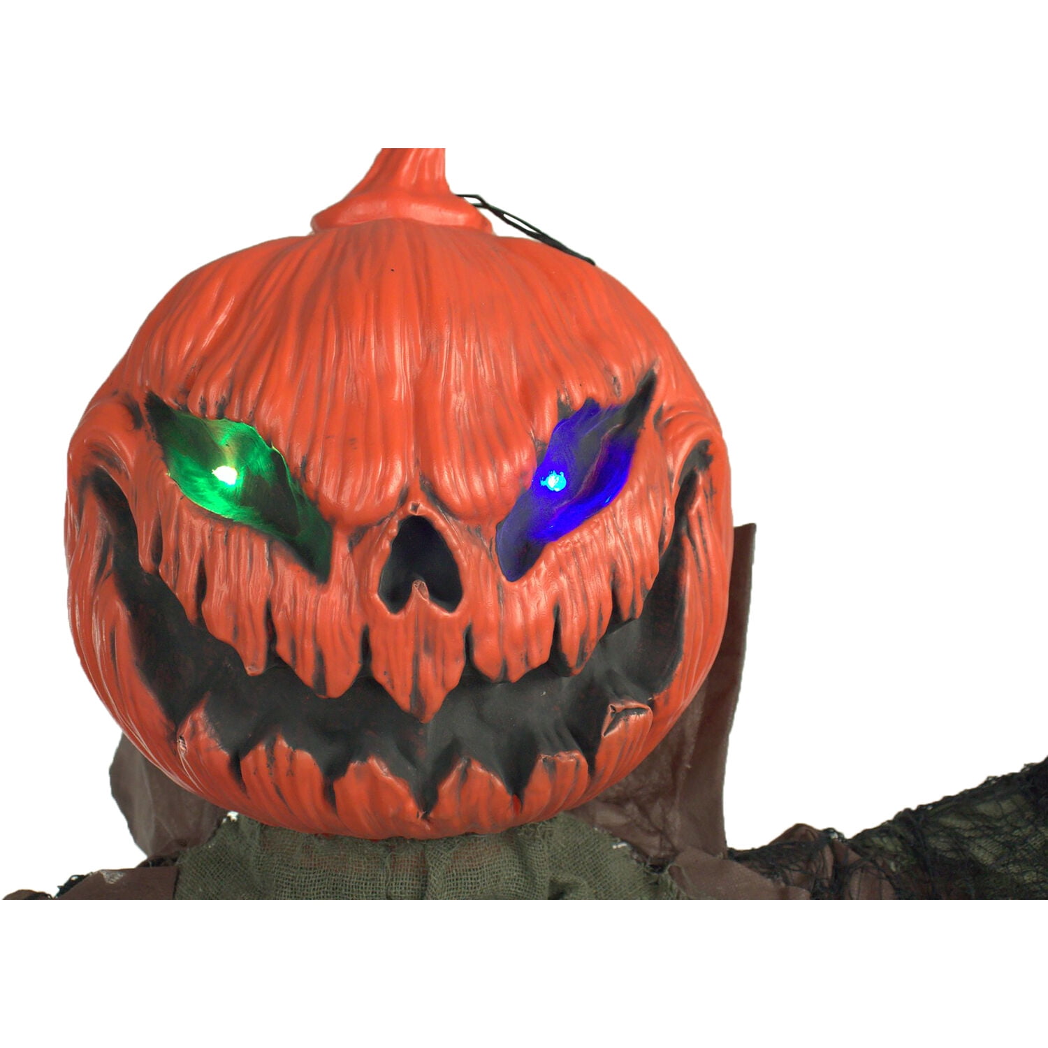 Edward is a beast like no other. Cursed many years ago, he now lives for eternity in half man, half pumpkin, form. Determined to petrify any who stumble his way, he greets visitors with menacing moans, haunting screams, and ominous bubbling sounds. Edward’s head is a large pumpkin. His jack-o-lantern eyes light up an alarming array of multi-colors as he flashes his permanent grin of doom. His torn burlap shirt exposes his white bony rib cage, one of the only signs of Edward’s humanity. Where his hands once were, there is now nothing but straw stubs. Reach them towards victims or extend them at his sides by repositioning Edward’s bendable arms. The creepy creature can be suspended from his hanging loop or propped on his stand to tower over victims anywhere. Invite Edward over this Halloween, but beware. He’ll scare more than just the crows.