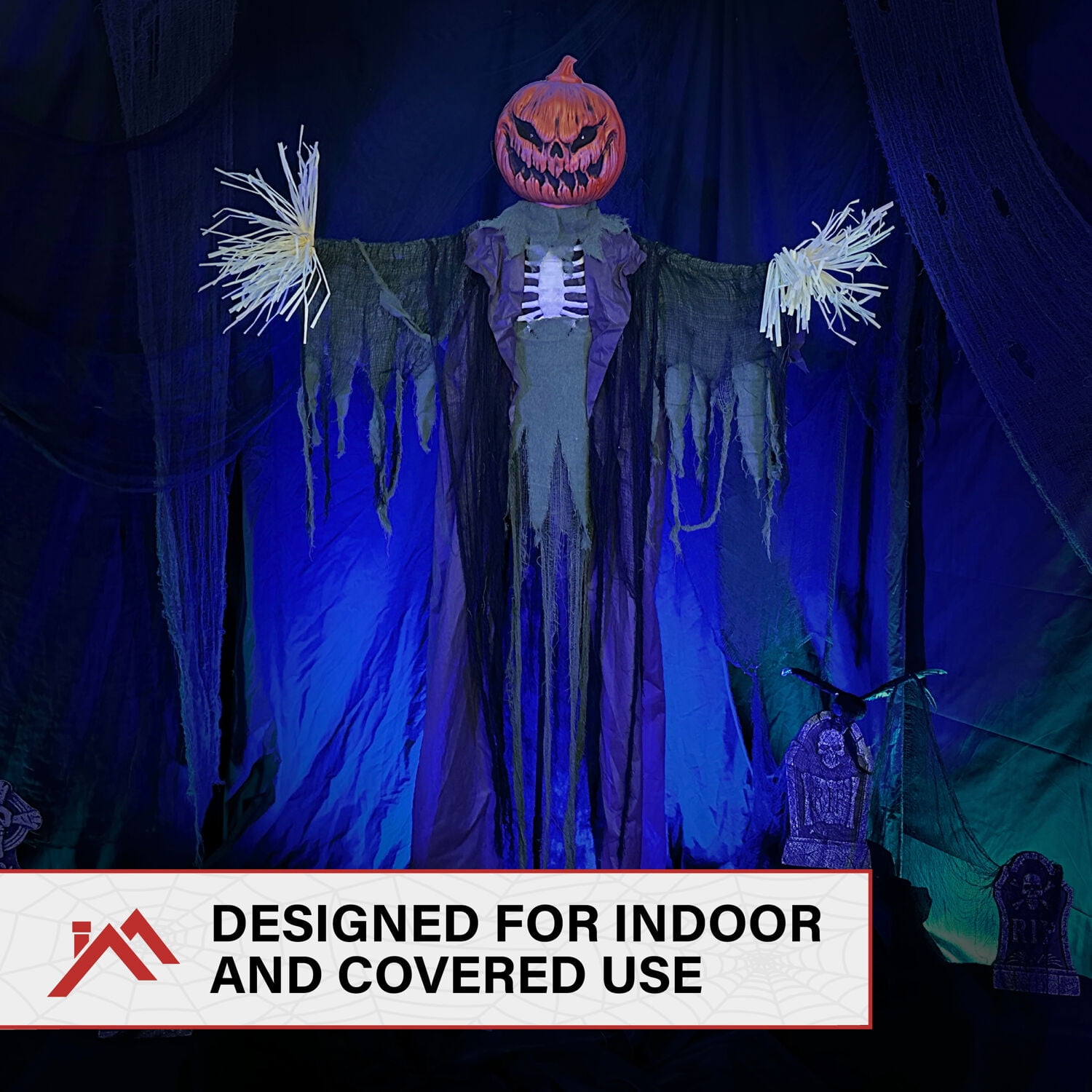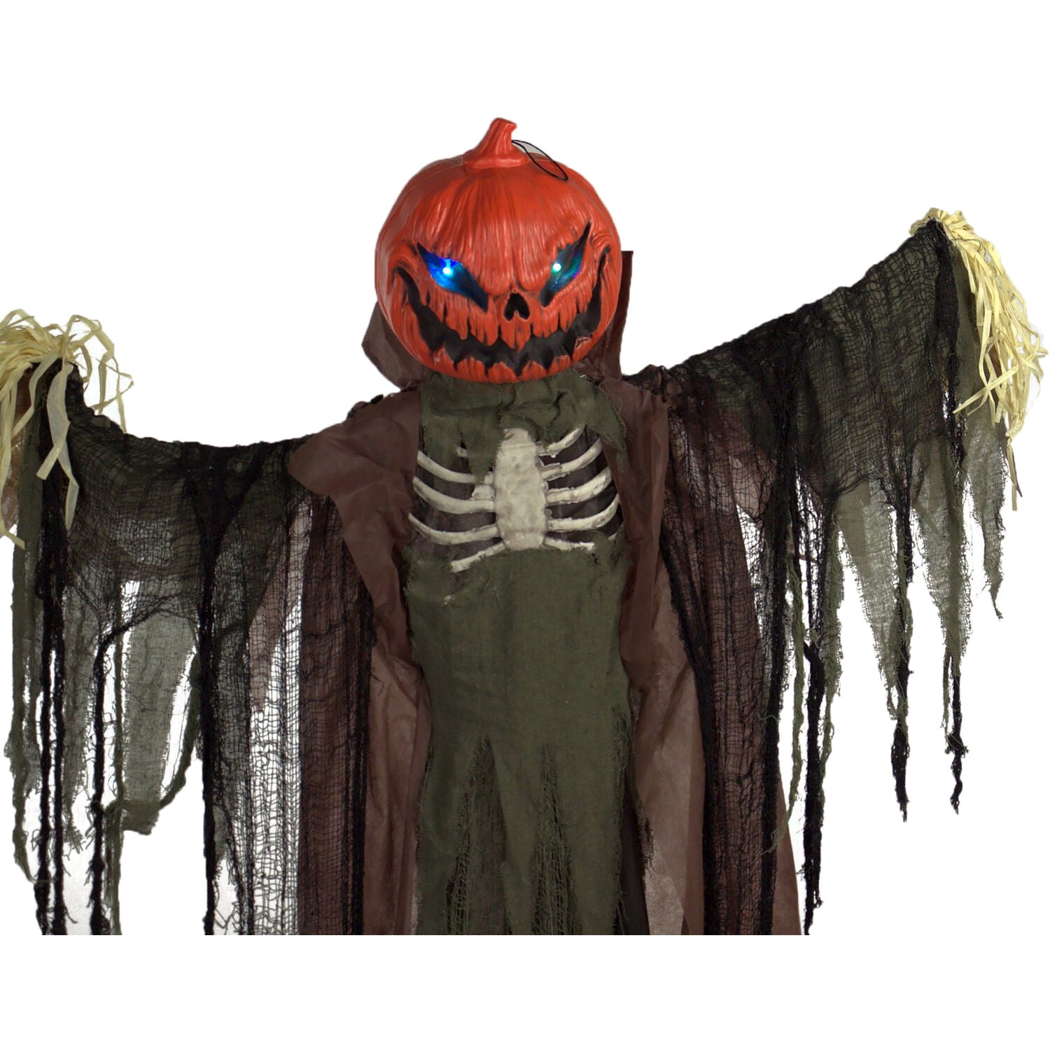 Be afraid. Be very afraid of Haunted Hill’s Haunted Cornfield collection. Cursed many years ago, he now lives forever as half man/half pumpkin. Determined to petrify any who stumble his way, he greets visitors with menacing moans, haunting screams, and ominous bubbling sounds. Invite Edward over, but beware. He’ll scare more than just the crows. Life-Size Animatronic: Poseable Halloween Pumpkin man is perfect for your indoor or (covered) outdoor decor. Display your animated decoration in a variety of different scary and evil ways at your next party. Multi-Function: Creepy and spooky! This animated jack-o-lantern lights up, moans, and has motion. He will turn your home into a haunted house in no time. Prop on the stand or hang in your garden/yard for a spooky cornfield or graveyard look. Touch Activated: Place your zombie-like scarecrow at your front door or along your walkway to delight and frighten trick or treaters. Activates by touch or from loud noise/motion like wind or the screams of scared people passing by! Features: multi-colored lights changing eyes, moaning, screaming, bubbling sounds 80 in. animatronic scarecrow for indoor and covered outdoor display Edward is touch activated- eyes flash multi-colors, moans, haunting screams, ominous bubbling sounds Large pumpkin head with jack o-lantern features Wide grin of doom Torn shirt exposes white bony rib cage Stubby straw hands Tattered earth-toned cloak and clothing Poseable arms bend into a variety of scary positions Life-size figure can stand or hang to fit eerily into your Halloween decor Battery-operated for convenient placement (3 AAA batteries not included)