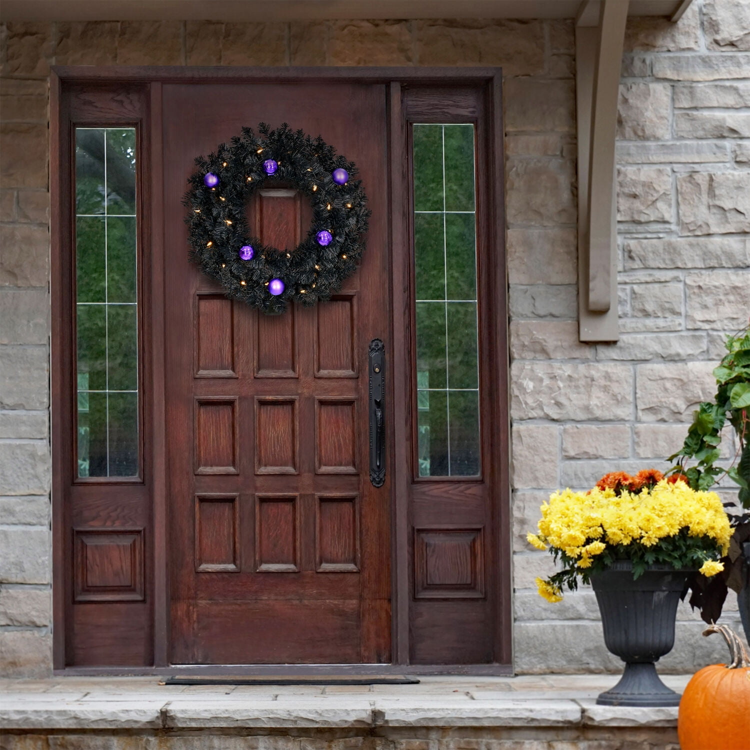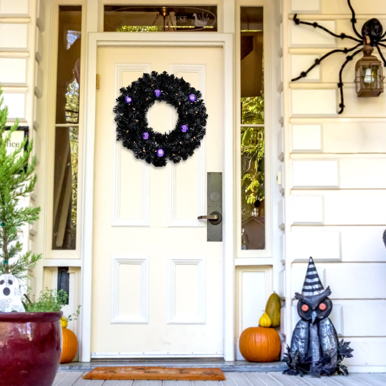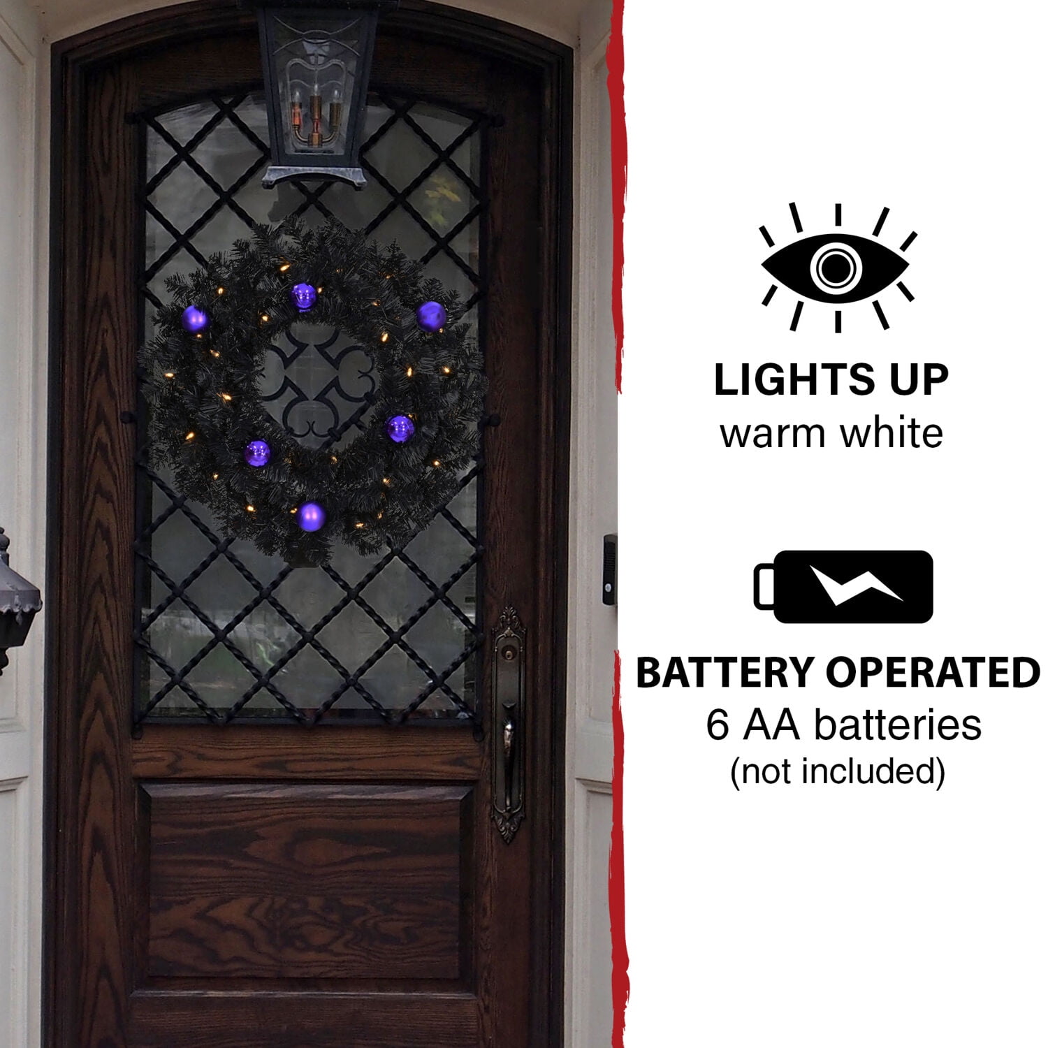Haunted Hill Farm PRELIT WITH WARM WHITE MODERN LED LIGHTS: Premium handcrafted wreath trimmed with shatterproof metal ornaments. Battery operated lights allow for easy display with no fussy cords. TRICK OR TREAT: Measuring 24 inches in diameter, this spooky Halloween decor is the perfect size for your doors, windows, walls, or any place you want to add some seasonal whimsy. FRIGHTFULLY FUN DECOR: This festive alternative to live greenery arrives fully assembled. With some light fluffing, this fun whimsical prop is ready to display. Suitable for inside or covered outside use. HIGH-QUALITY MATERIALS: Designed using high-quality materials, this unique wreath is crafted to last season after season – no maintenance required! 24-in black tinsel wreath from Haunted Hill Farm for indoor and outdoor display Sturdy metal branches dressed in shimmering black tinsel Metal hinged branch construction distributes branches evenly Pre-strung with 30 warm white lights Black tinsel reflects off of lights Perfect statement piece for any room Purple ornaments placed evenly throughout wreath Quick and easy assembly Battery operated for easy placement of wreath (6 AA batteries not included) Pairs perfectly with matching garland: HH072TINGL-5BL