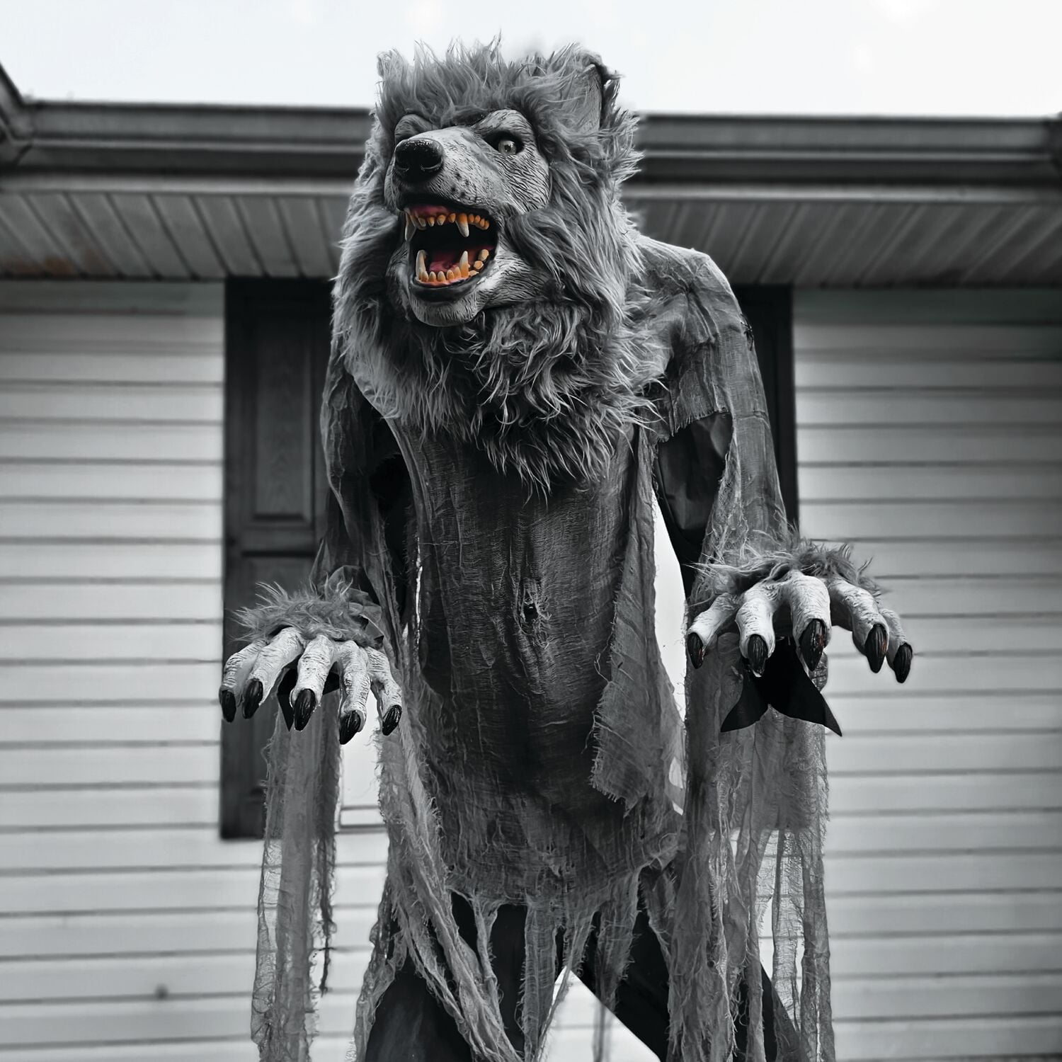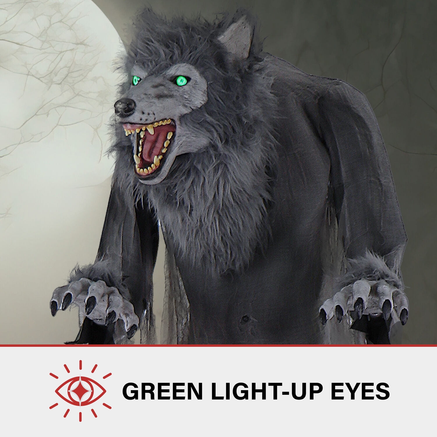 These motion-activated, full-bodied creatures focus on high-quality details and realism for the perfect addition to your creepy haunted house decor. Farkas, the Towering Werewolf, found his way to our world through a prehistoric time portal. This dire wolf travels freely between his world and ours morphing into a werewolf to search for tasty morsels to eat. Be careful, or you might be his next meal. Farkas will terrify your trick-or-treaters with his looming presence, amazing sound effects, and glowing green eyes. Spine-tingling animation includes moving his head and torso from side to side and opening his jaws to reveal his ferocious teeth. Choose Farkas as a unique greeter near the front door, on your porch, or inside your home to scare your family, friends, and neighbors.