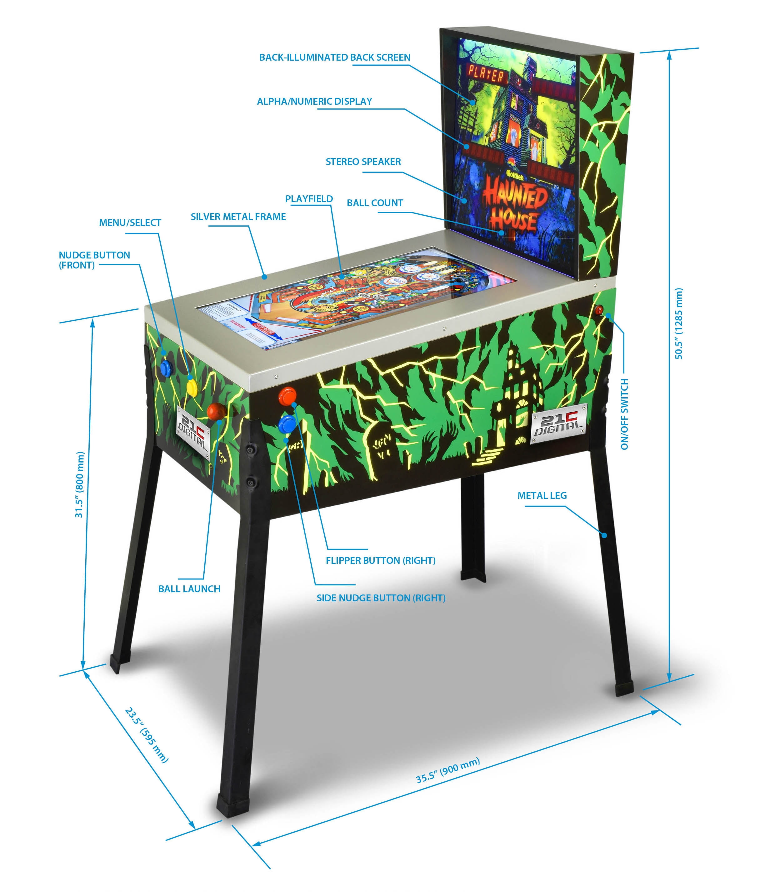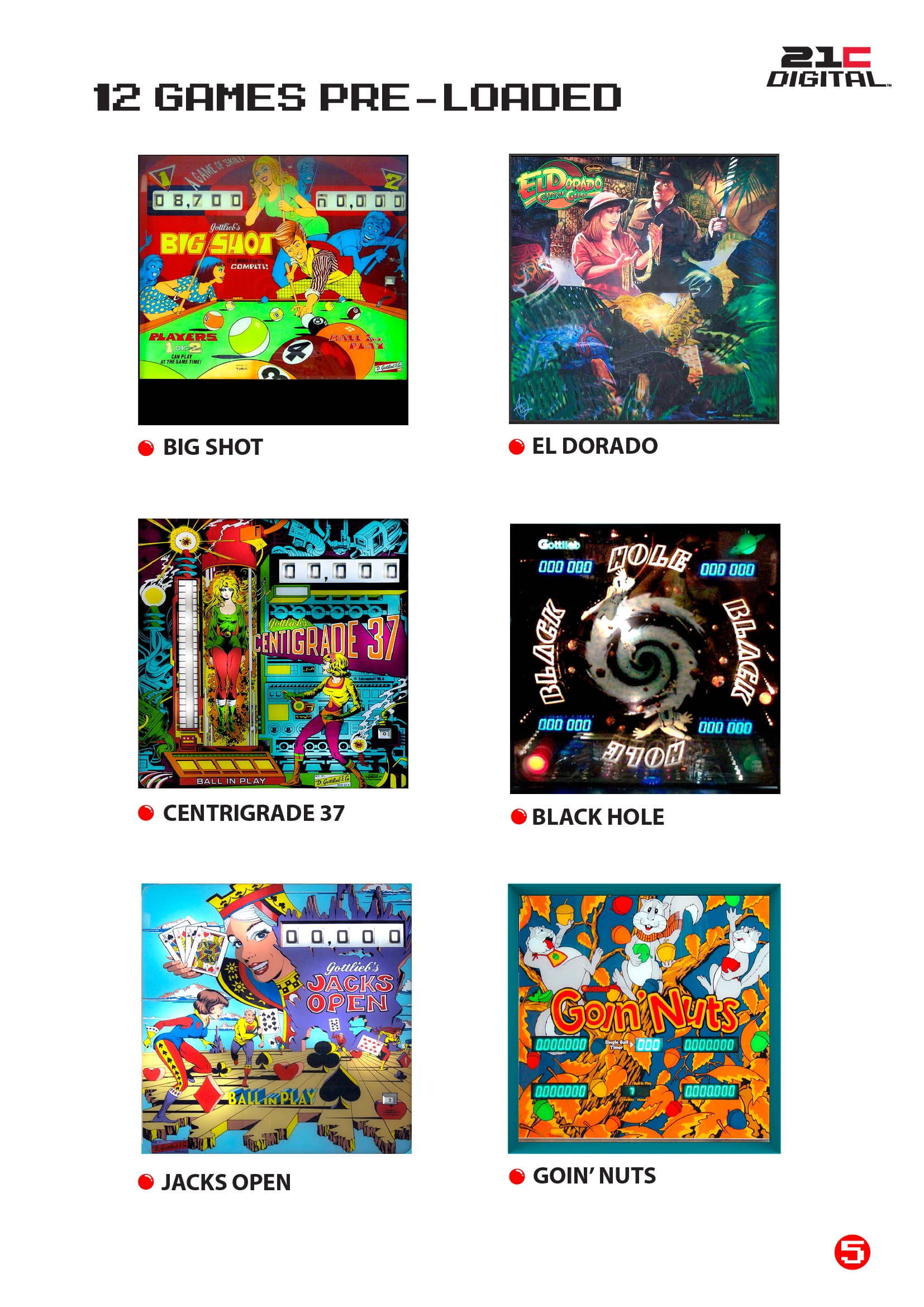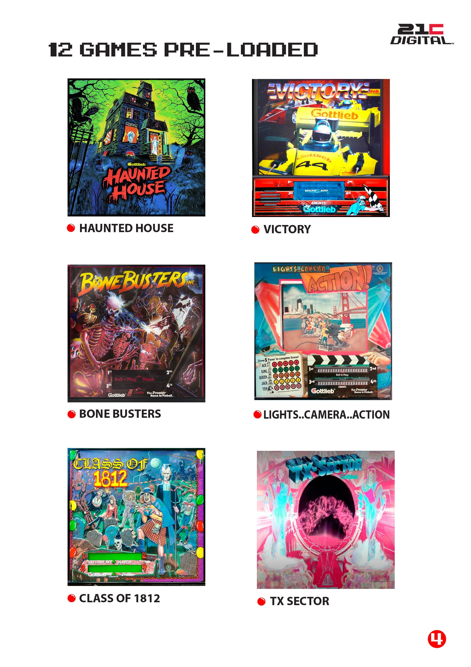 Included games: Haunted House, Black Hole, El Dorado City of Gold, Big Shot, Class of 1812, Bone Busters, Lights..Camera..Action, Victory, TX Sector, Centigrade 37, Jacks Open, Goin’ Nuts All 3D technology – 12 Classic Gottlieb games recreated in stunning 3D detail Emulates actual mechanical Pinball games Individual Game Instructions on screen help player master each game Four Alpha/Numeric Displays OR DMD/LCD screen for Player – Ball Count – Score – Game Options High Scores recorded and saved for every game Nudge the ball in three directions – but be careful not to Tilt or you’ll lose your ball Flipper Buttons and Mechanical Plunger for a real life pinball feel Pause the action at any time All games licensed Proportional Size and realistic arcade look (Approx 70% of full size pinball machine) Perfect home-use size Extremely solid and stable 24 inch Playfield Display Stereo Speakers Volume Control Back Lit Back Box Display Offers the broadest variety of games available in the market today Easy Assembly (15 – 20 minutes) Legs Solid metal / 2 Bolt-Screws per leg, wrench included Back Display Plug-to-Plug connection Power Cord ? Plug & Play