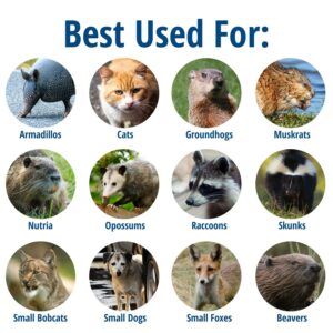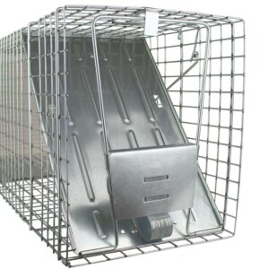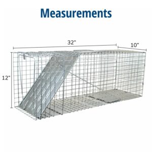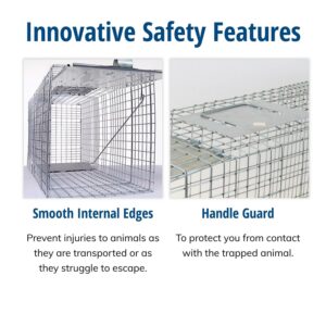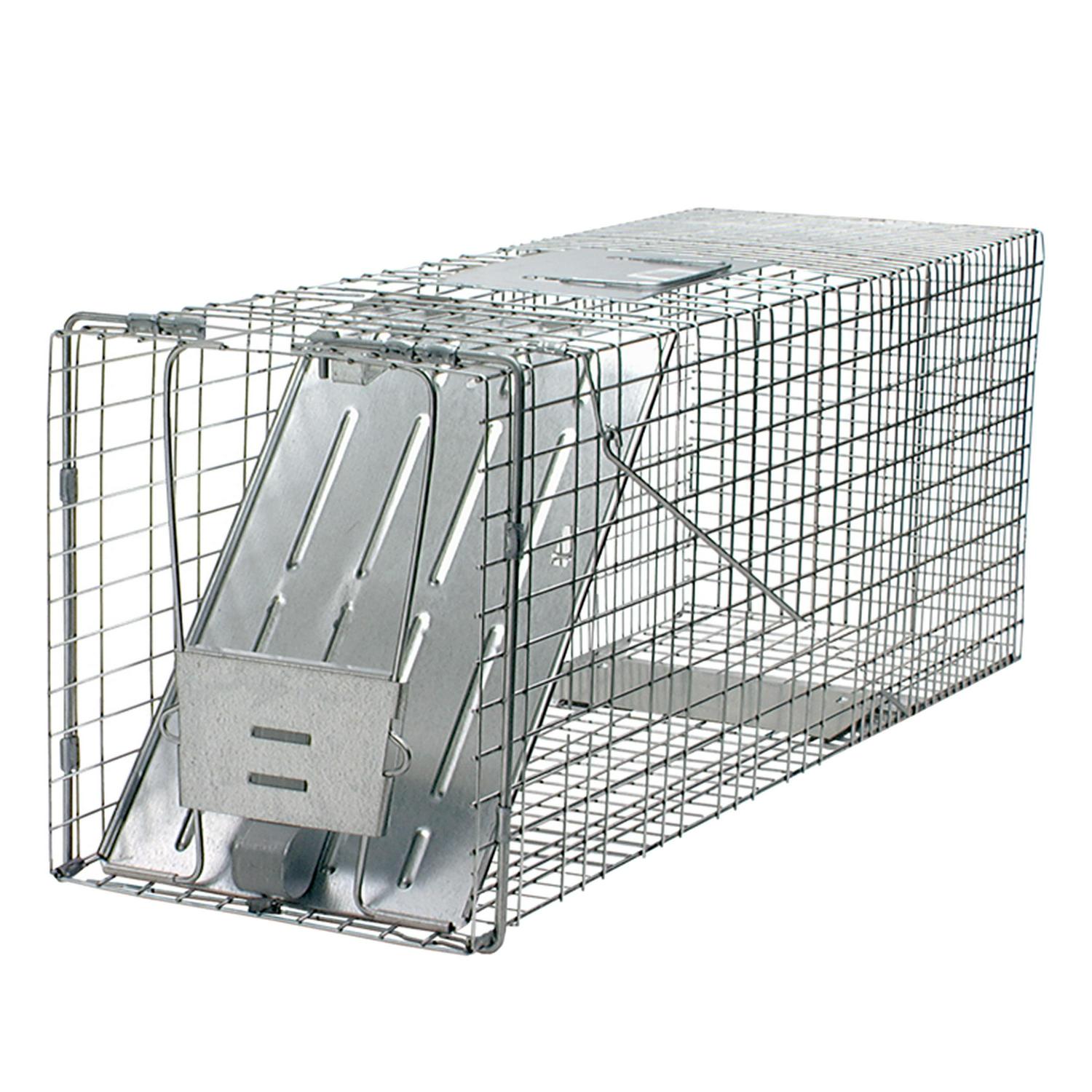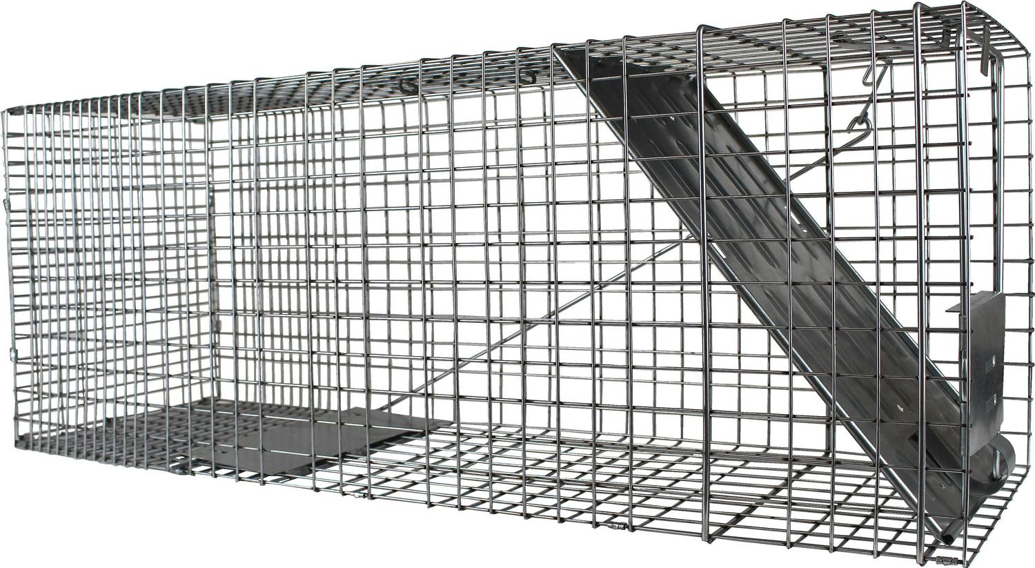 The Havahart Large 1-Door Animal Trap is an all-metal, live cage trap designed by professional trappers. It features a spring-loaded door for safe, secure catches. Animal control officers also trust and use these live animal traps — so can you! Use it to trap bobcats, small foxes, beavers, small dogs, raccoons, opossums, skunks, armadillos, groundhogs and other similar-sized pest animals. Havahart one-door animal cage traps are constructed of sturdy, rust-resistant wire mesh with steel reinforcements and measure approximately 32 inches long. Each trap is built to last and galvanized for maximum resistance to rust and corrosion, making it an ideal solution for your long-term trapping goals. This trap includes mesh openings that are smaller than competing traps of comparable size, which prevent escapes and stolen bait. A solid, locking door and sensitive trigger ensures quick, secure capture that targets a specific animal size while eliminating undesired catches. Solid handle guards also protect the user while transporting an animal. At the same time, smoothed internal edges protect and prevent the animal from injuring itself.