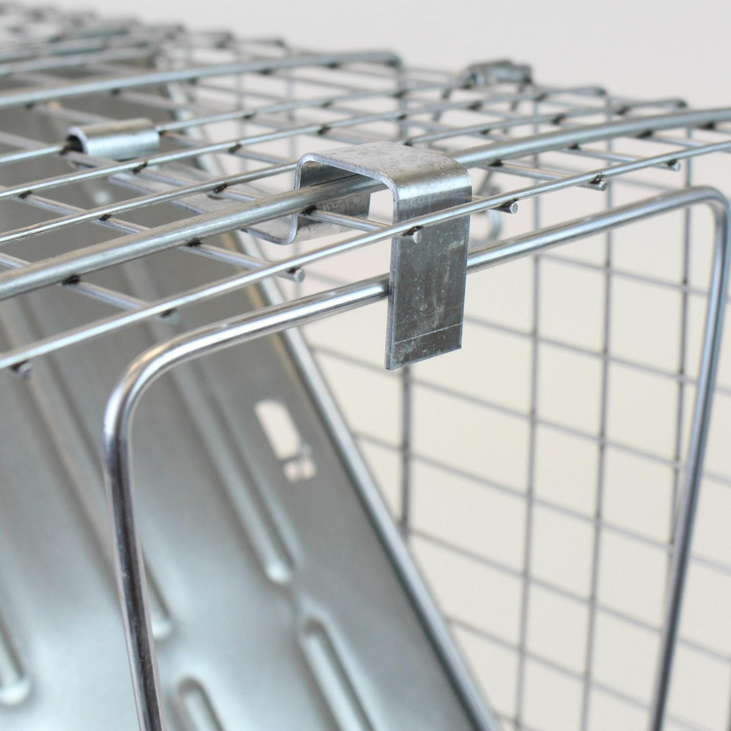 - Spring-loaded solid metal door securely holds animals and prevents escapes