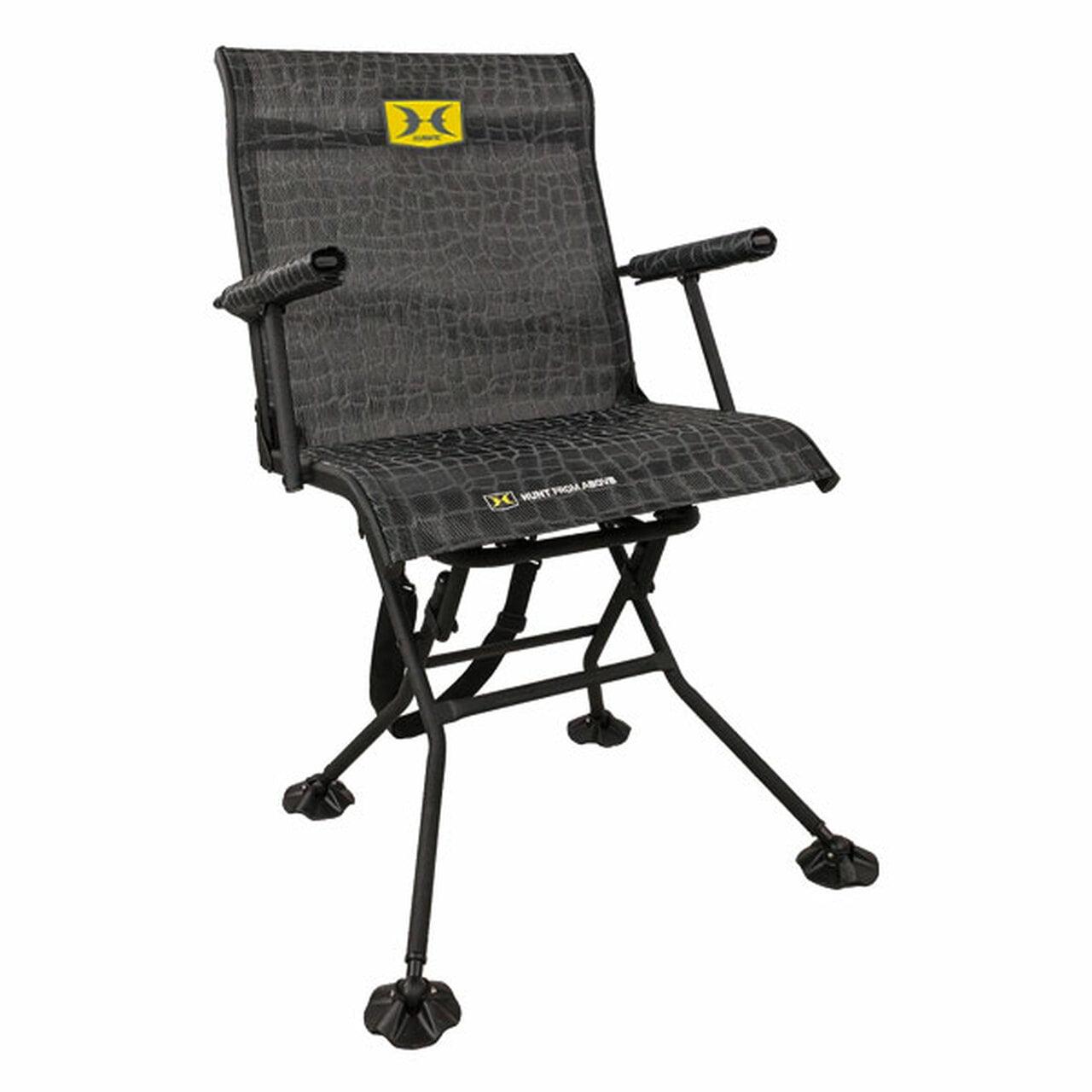 HE ULTIMATE BLIND CHAIR Bone Collector trusted, the Stealth Spin lets you be stealthily in perfect position when it’s time to take a shot. Spinning a full 360-degrees, you can effortlessly turn to shoot out any side of your blind. Contoured MeshComfort backrest provides all-day support and cool breathability. Padded armrests for even more ‘lounging’ comfort while sitting. Quad legs and oversized, pivoting feet provide added stability and keep the chair from sinking into soft ground. Heavy-duty steel tubing & powder coating keeps it stable and ensures long lasting use. Quickly folds down for easy transport with included sling.