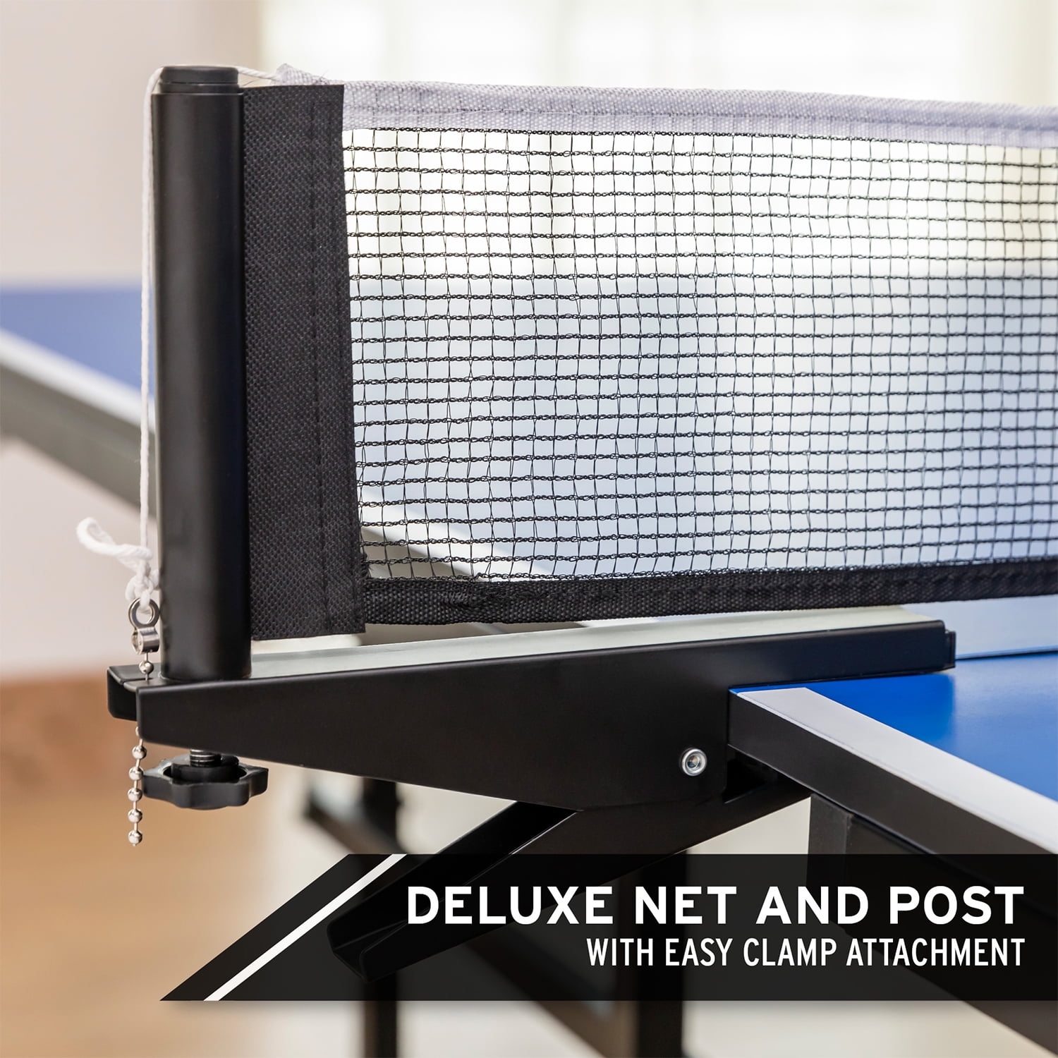 Enjoy endless competition and fun with Match Point ping pong table Two-piece seamless 12-millimeter surface folds in half for easy storage Rust-resistant powder-coated steel frame provides the utmost durability and long-lasting use Roll the table from place to place easily with the included caster wheels that will also lockdown in place Clamp-on table tennis net is easy to set up for immediate gameplay Paddles and ping-pong balls not included Color: Blue Dimensions (L x W x H): 108 x 60 x 30 inches Weight: 130