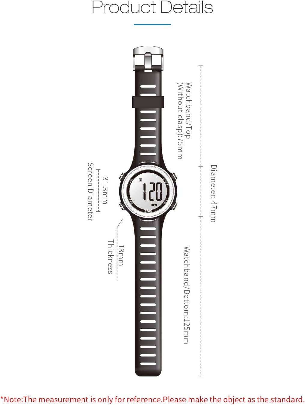 EZON T007 Professional Heart Rate Monitor Digital Watch is designed specially for fitness enthusiast, track team, running amateur and any other indoor/outdoor sports enthusiast. Introduction The Product has the function of heart rate monitor, it can help to ensure you receive the maximum benefits from your exercise program. You can increase the effectiveness of your exercise program by monitoring and quantifying your results every step of the way. MHR (Maximum Heart Rate) MHR is expressed the maxium beats of the heart per minute. It is important that you know your maximum heart rate training zone, upper heart rate limit and lower heart rate limit before you begin. They help you achieve the maximum health benefits out of your workout. Key Features 1. Heart Rate Monitor 2. Stopwatch 3. Calender 4. Chronograph 5. Hourly Chime 6. 5ATM Waterproof 7. Alarm 8. EL Backlight Specification 9. CR2032 Battery: 12 Months Life 10. Easy battery replacement mode Package List 1. Heart Rate Monitor Digital Watch x 1 2. Transmitter Strap x 1 3. Warranty card x 1 4. Instruction Manual (English) x 1 Attention 1. This is a multi-functional sports watch with many useful features. Please read the instructions and settings carefully. It will be very useful. 2. Please DONOT press any buttons underwater and keep it away from steam and hot water in case of damaging waterproof ring.