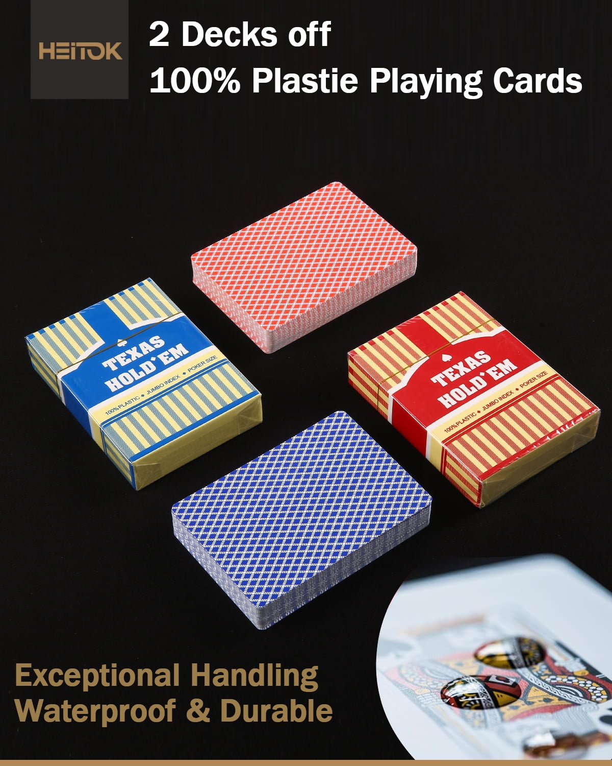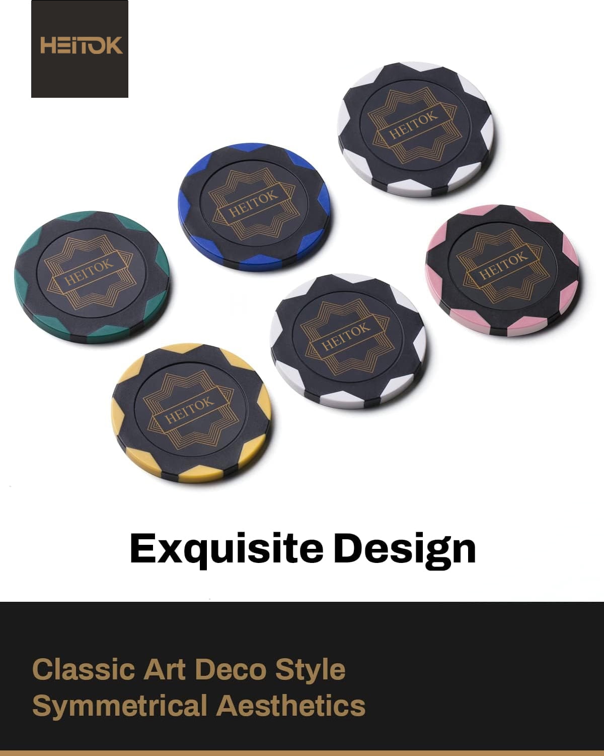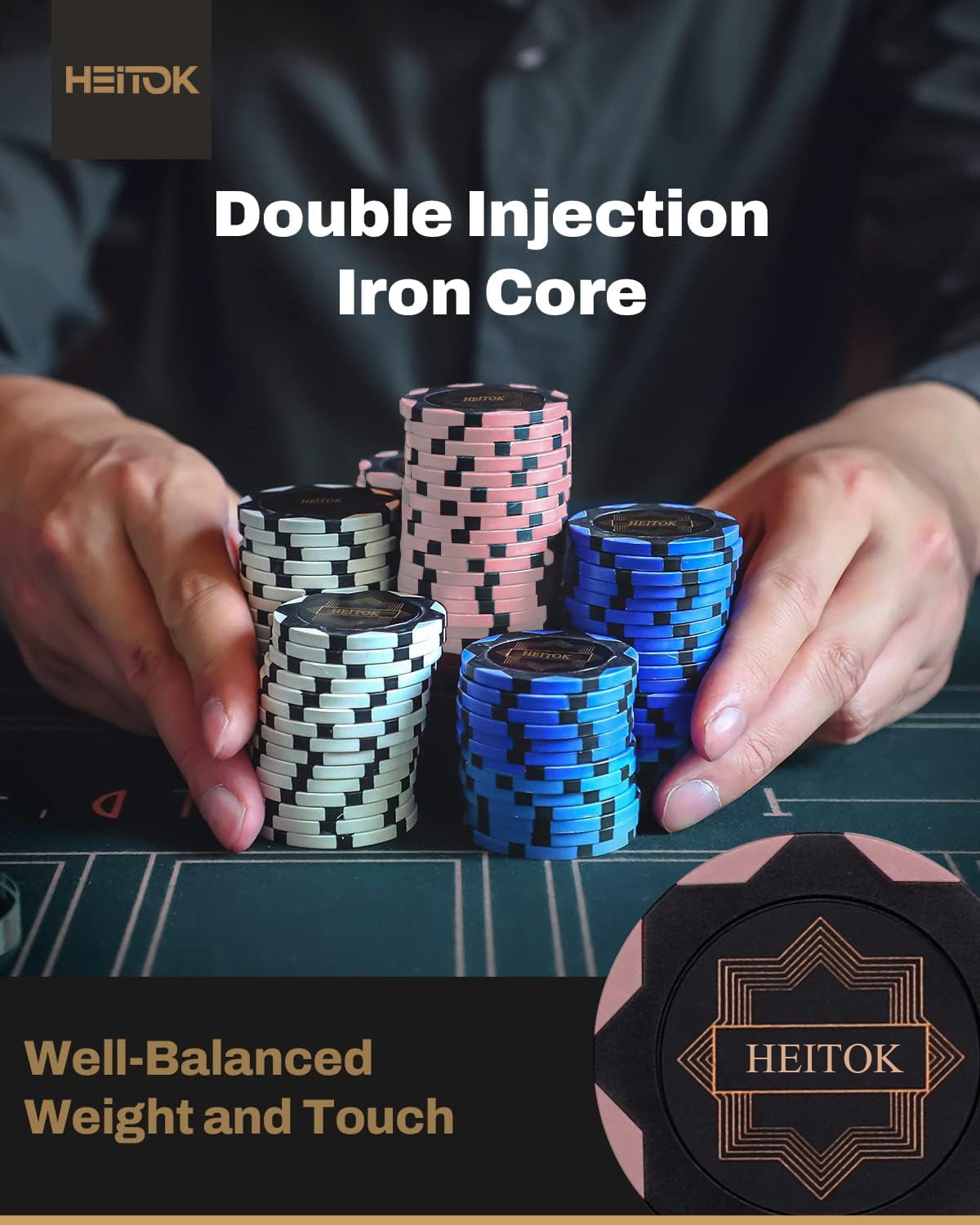 Why choose HEITOK Poker Chips? [Premium Clay Poker Chips] 14-gram casino quality clay poker chips are exquisitely double injection molding and iron core. 500 PCS CHIP SET: 150 White, 150 Gold, 100 Pink, 50 Blue, and 50 Green. The diameter for each chip is 1.57 inches. All poker sets include 2 decks of plastic playing cards and 1 dealer. (We do not provide small blind and big blind buttons.) Edges are finely polished, giving a feel of true casino-level clay poker chips. [Luxury Aluminum Case] Our thickened aluminum suitcase shows status and class. Size: 15in * 11in * 2.6in. Thickened edge wrapping technology, protect the case from deformation when hit. It includes a zinc alloy lock and a large handle. The hand-made chips feature inner support and PU leather packaging materials. Super portable with full-body black material. [Waterproof Poker Cards] 2 x decks of playing cards using high-quality paper stock are a match to the entire quality of the chips set. Use this poker chip set for poker nights with friends and everyone loves it. [Amazing Professional Poker Set] Classic Poker Sets are perfect for 8 to 10 players for Texas Hold ’em, Blackjack, tournaments, card clubs, and more. It is the perfect choice for birthdays, Christmas, and other holidays for people of all ages. [Texas Hold’em Poker Chip Set] A poker set gives you everything you need to play Texas Hold’em. Specifications: Brand: HEITOK Theme: Fashion Number of Players: 10 Material: Clay Age Range (Description): Adult Product Weight: 18.96 pounds Product Dimensions: 15 x 11 x 2.6 inches Manufacturer recommended age: 17 years and up