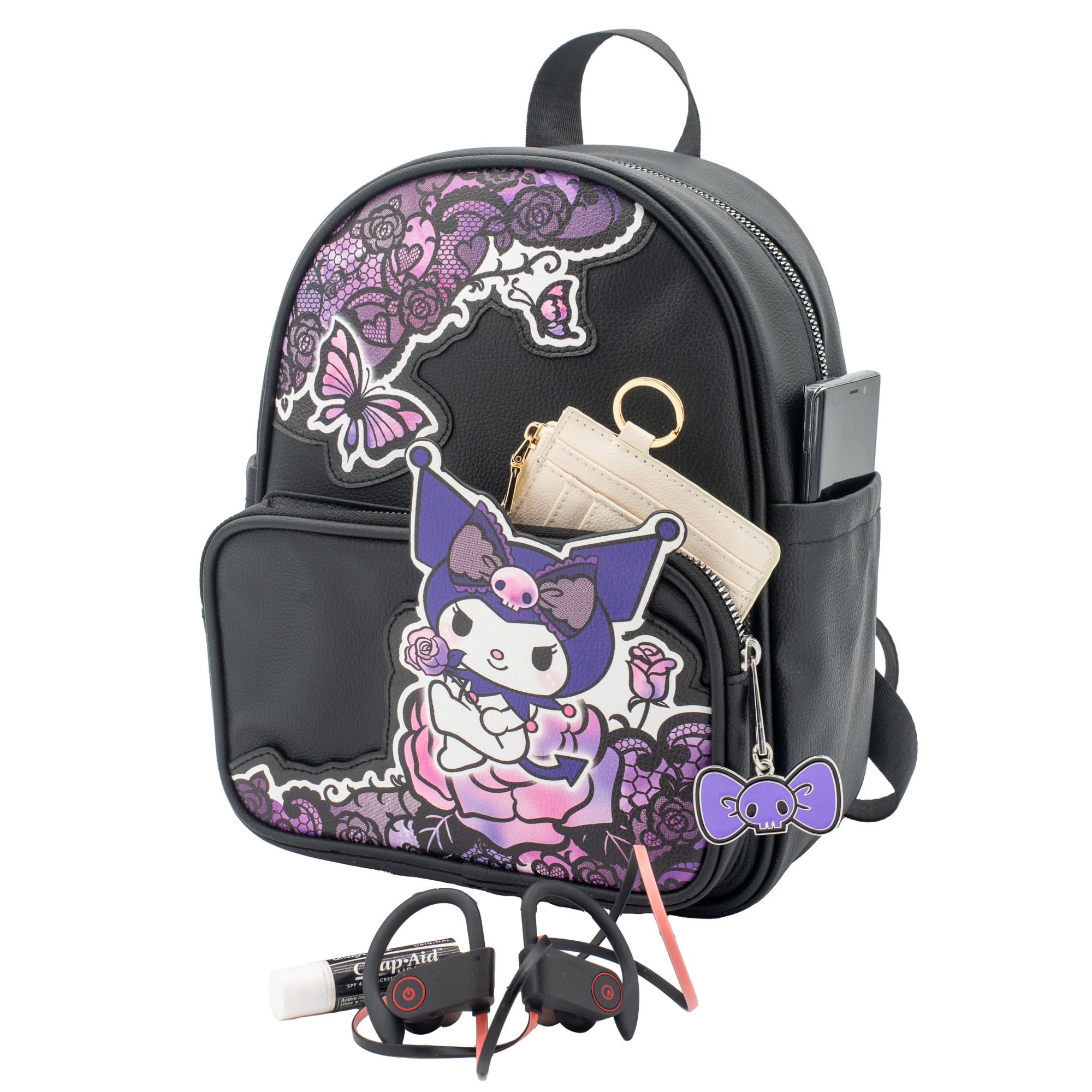 Junior Women’s Mini Backpack Design: This mini backpack purse features a 3D Kuromi character applique along with lace, rose, and butterfly appliques. It has a main zipper compartment and a front zip pocket with a metal epoxy-filled charm zipper pull of Kuromi’s iconic skull bow Durable And Made To Last: Made of high-quality PU vegan leather with a padded back panel and padded adjustable PU straps offer extra comfort and support. The vegan leather material makes it water-resistant and easy to wipe clean Measurements: The mini backpack measures 10.5 IN H x 8.5 IN W x 4.5 IN D . It has a main compartment zip closure with an additional front zip pocket, 2 side slit pockets, and an inside zip pocket for extra storage. Just the right size for storing a wallet, phone, cosmetics, and all your other necessities Great Gift: This fun backpack purse is a must-have accessory to showcase Hello Kitty & Friends fandom. The compact size is a perfect carry-all for festivals, travel, or everyday use Officially Licensed: The Sanrio Kuromi “Lovely Lace” mini backpack is officially licensed and 100% authentic