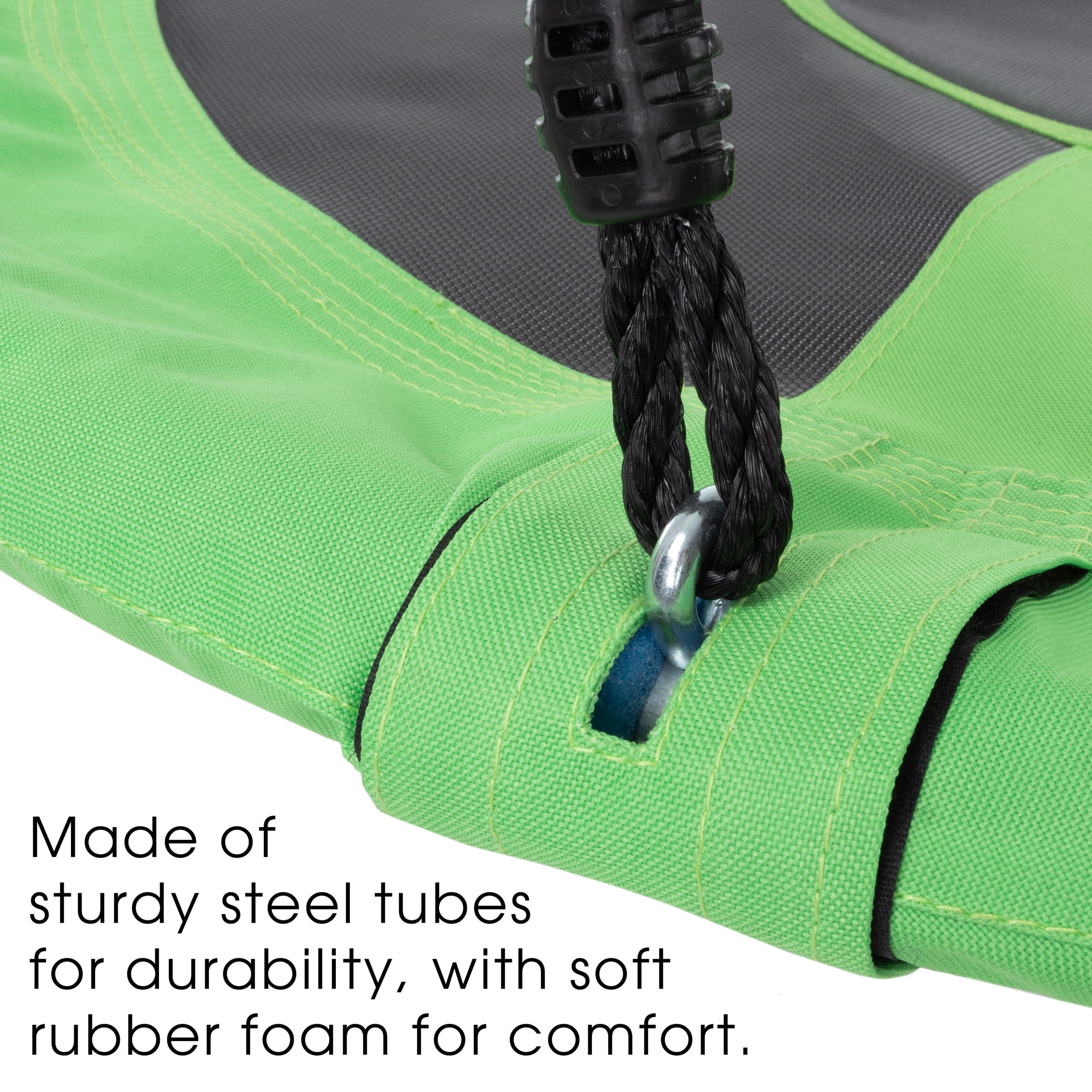 PLAYSET ADD-ON- Not only can this disc swing be secured to a tree branch, it can also be attached to an existing backyard playset. The saucer swing is a great piece of playground equipment that will be hours of fun for little boys and girls. VERSATILE- There are so many ways to enjoy this versatile saucer swing. The large seat allows kids to lay, stand, or sit with their legs up on the swing or hanging over the side. Your kids will love coming up with ways to enjoy this outdoor accessory. FUN GIFT FOR KIDS- This engaging outside play equipment makes a fantastic gift for holidays, birthdays, or any occasion! Your children are sure to enjoy hours of fun with this big disc swing! PRODUCT DETAILS- Materials: Steel, Rubber Foam, 600D Polyester Oxford. Dimensions: 40” Diameter. Maximum Rope Length: 63”. Maximum Weight Limit: 220 lbs. Colors: Green and Black. Hanging Hardware NOT INCLUDED.