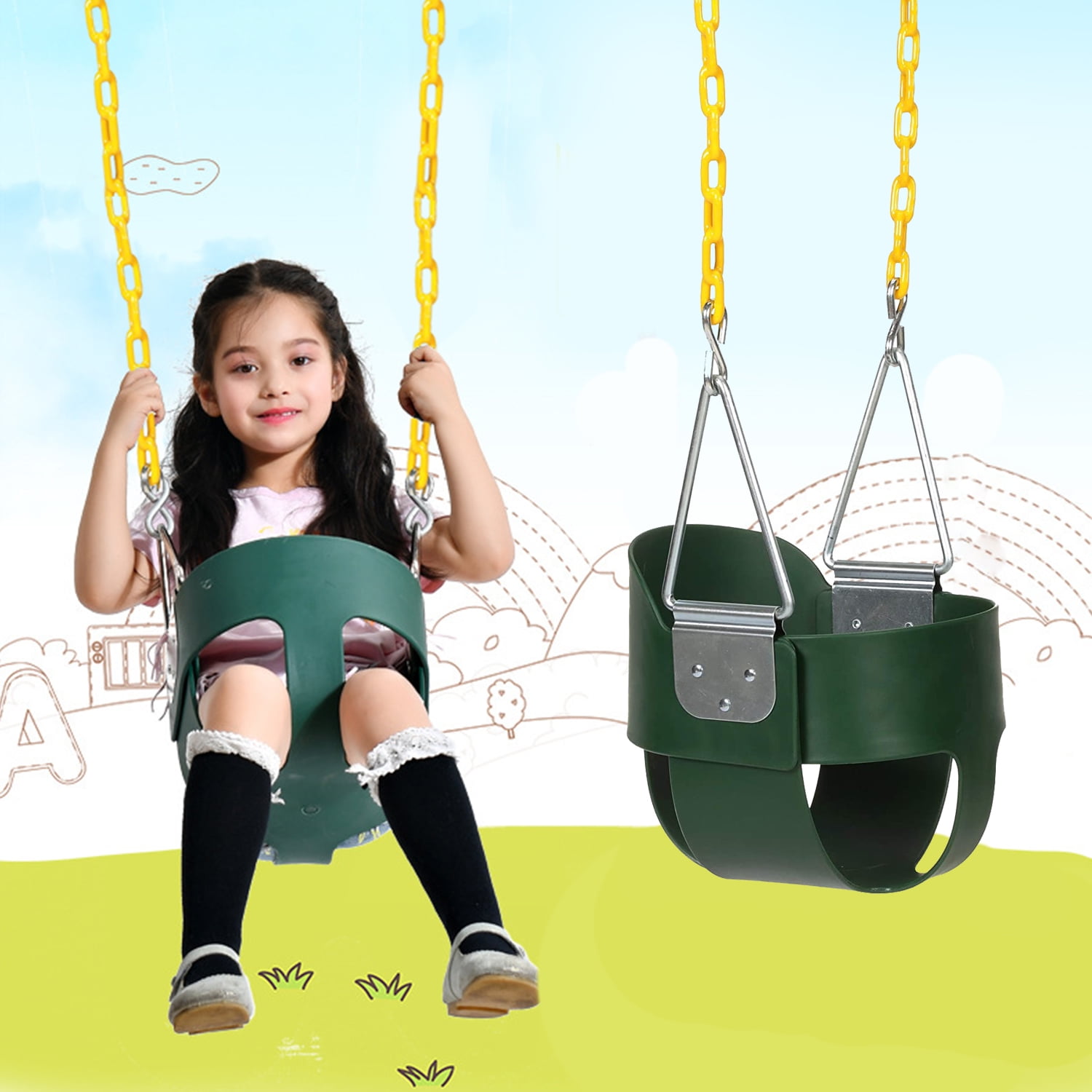 High Back Toddler Bucket Swing Seat with Coated Chains, Heavy Duty Kids Swing Seat Fully Assembled, Green