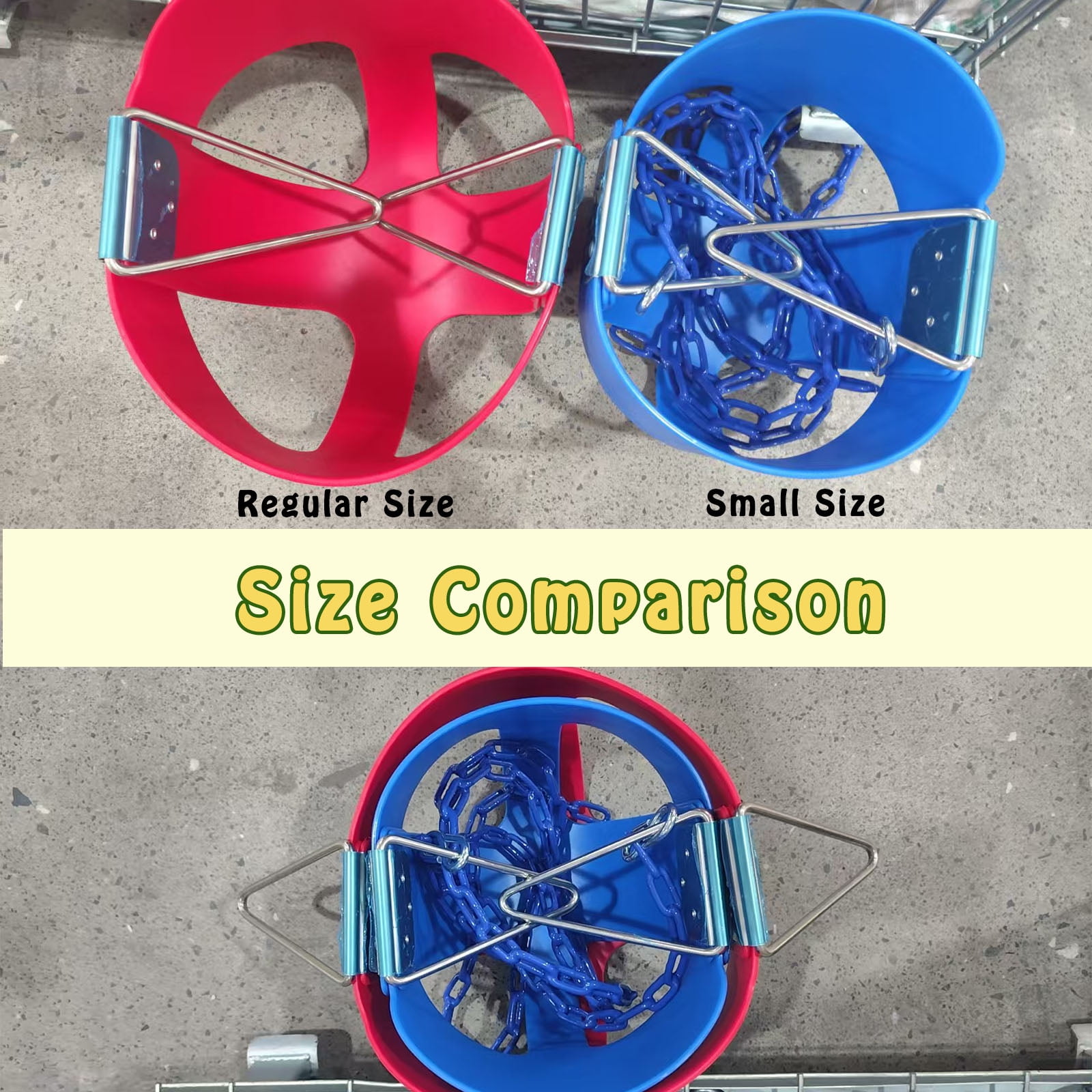 PACKING, High back full bucket swing seats with 66″ long chains 30″ yellow plastisol coating design to avoid pinched fingers. EASY TO INSTALL,Our toddler swings come fully assembled and easy to install. The seat size( Front to Back) is 10 inch. SAFE DESIGN,The bucket swing is made of durable and high quality materials with a highly durable plastic seat. Also features zinc-plated hardware for years of use.Aditional safety is provided by our safety belt and the anti tip design. This keeps your child safely on the seat and prevents them from falling off. In addition, the correct position of the swing is maintained and prevents the swing from twisting or tipping over WEIGHT CAPACITY, he bucket swing is made of high quality, durable plastic and is for residential use only, built to hold up to 330 LBS., for Kids 8 month to 4 year age. HEIGHT AND WEIGHT,12.2(L)*14.2(W)*11.4(H) ,weight, 4.6lbs