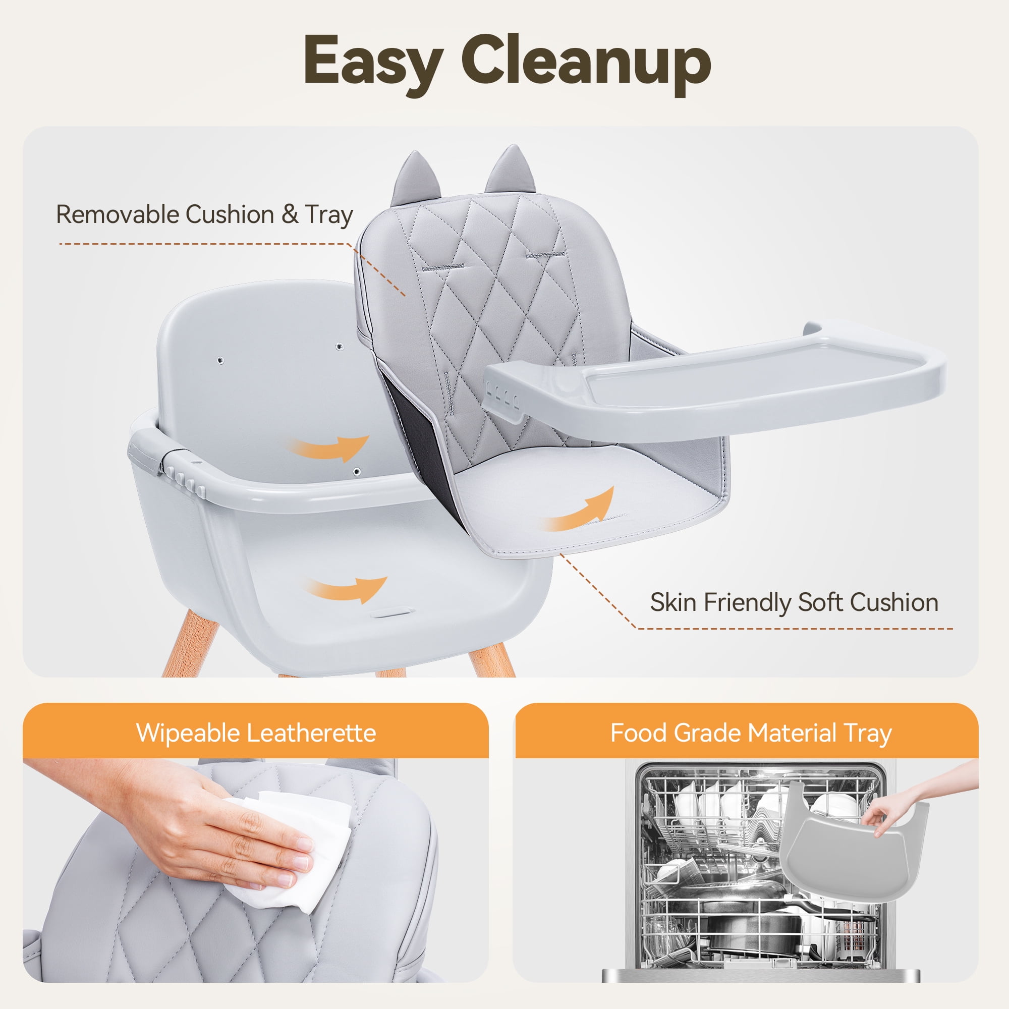 Why Choose Us? Product Specifications: [Materials]: PE+PP+PU+Beechwood+Iron [Three-in-One Functionality]: Baby high chair – Infant seat – Toddler stool. Combining modern design with practical functionality, it serves not only as a high chair but also as a stylish and upscale piece of furniture. [Pyramid Structure]: The pyramid structure ensures maximum stability. Its classic and exquisite appearance will undoubtedly enhance the beauty of your home. The simple and modern style can blend seamlessly with any decor in your living room, dining room, or bedroom. [Three-Position Adjustable Tray]: Our baby highchair made of food-grade PP material, the tray can be adjusted to three positions to suit your baby’s needs. [Five-Point Safety Harness]: Provides maximum safety for your child. [Versatile and Adaptable]: As your baby grows, it can be used as a feeding chair, play chair, and toddler chair, meeting the needs of children at different stages. [Easy to Clean]: The tray is dishwasher-safe, the seat cushion is wipeable, and the safety harness is removable for easy cleaning. [Maximum Weight Capacity]: Suitable for babies aged 6 months to 24 months, with a maximum weight of 20 kg. [Maximum Dimensions]: 33in * 22in * 22in [Suitable for Various Settings]: Home: living room, dining room, bedroom Educational or Commercial Institutions: kindergarten, daycare centers Public Places: restaurants, cafes, outdoor dining areas