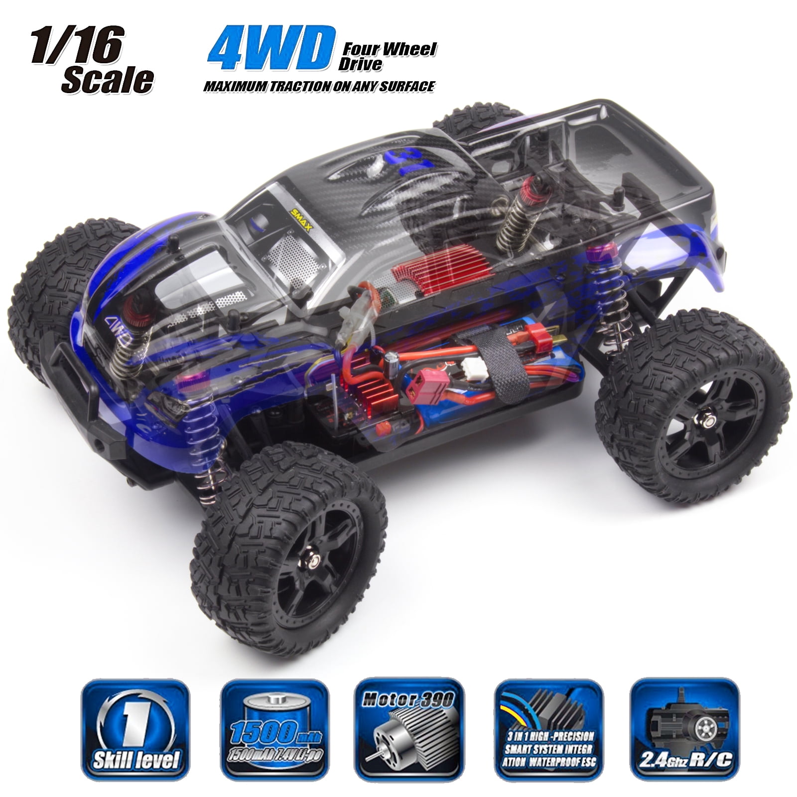 The whole car made of high-performance composite nylon plastic materials Model dedicated high-speed rolling bearings Model dedicated 390 high-speed magnetic motor Waterproof, fast response, high-power model electronic governor with brush (using lithium battery) Advanced high capacity large ratio discharge, the model dedicated 7.4V 1500mAh lithium battery Model dedicated 2.4G remote control with waterproof receiver High torque server Specifications: Brand: REMO Item NO.: 1631 Scale: 1/16 Color: Red, Blue Max Speed: About 50km/h Frequency: 2.4GHz Operating Mode: AFHDS Modulation: GFSK Battery For Transmitter: (NOT INCLUDED) 4pcs AA batteries (NOT INCLUDED) Motor: 390 Brushed Motor ESC/Receiver: Waterproof (Rating: IP68); 3CH; 27.2 x 17.6 x 11.4m Servo: 5-wire Servo Battery For Car: (INCLUDED) 7.4V/1500MAH Li-ion Battery (2 cells;T-plug) Remote control time: 25 minutes Charging time: 120 minutes Remote distance: 80 meters Speed: 40KM/h Function: forward, backward, turn left, rear turn, high speed car, waterproof; Forward and backward ratio adjustable, anti-stuck protection Remote control: left and right hand switch Package includes: 1 x RC Truck 1 x Transmitter 1 x English Manual 1 x Charger 1 x 7.4V Battery
