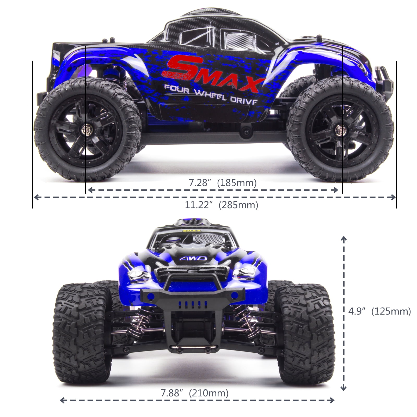 Product size: 12.99 * 7.87 * 4.72in / 33 * 20 * 12 CM.Function: forward, backward, turn left, rear turn, high speed car, waterproof; Forward and backward ratio adjustable, anti-stuck protectionRemote control time: 25 minutes,charging time: 120 minutes.Remote distance: 80 meters,Max Speed: About 50km/h