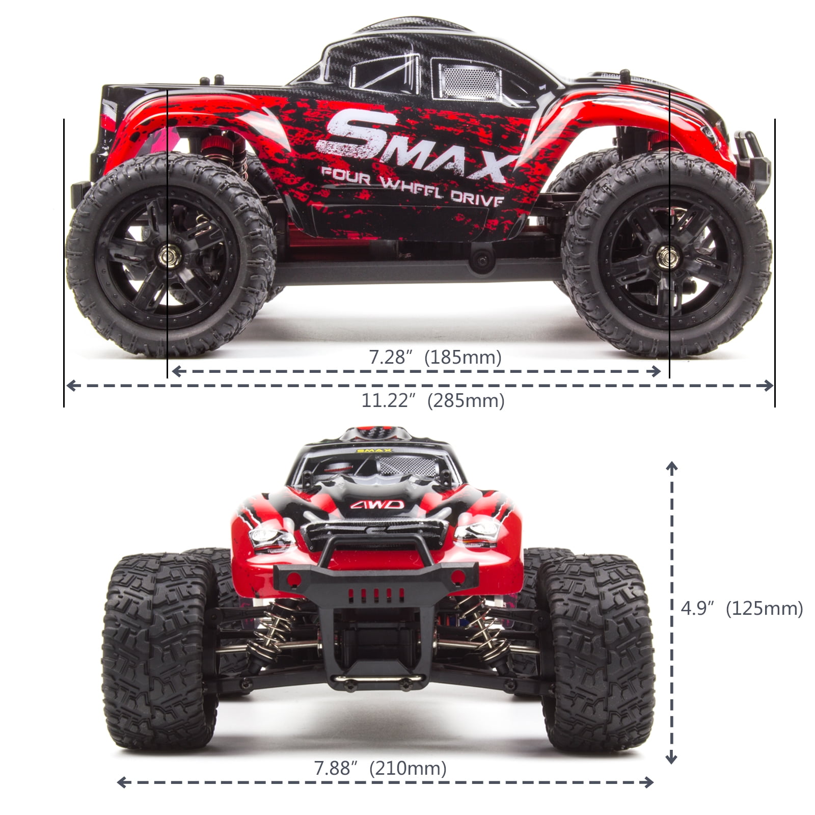 Product size: 12.99 * 7.87 * 4.72in / 33 * 20 * 12 CM.Function: forward, backward, turn left, rear turn, high speed car, waterproof; Forward and backward ratio adjustable, anti-stuck protectionRemote control time: 25 minutes,charging time: 120 minutes.Remote distance: 80 meters,Max Speed: About 50km/h