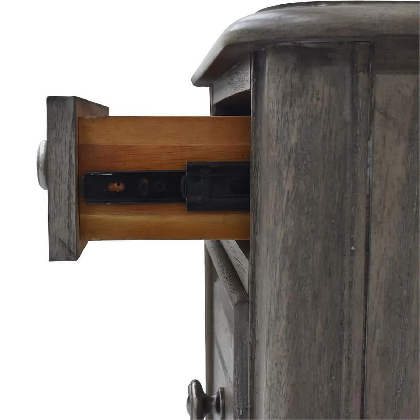 Highland Park features vintage styling in a classical bedroom collection. Sturdy construction using hardwood solids and veneers in a multi-step waxed driftwood finish with the perfect amount of distressing. The nightstand offers three drawers with side mounted roller bearing drawer glides for smooth open and closing and a convenient USB and electrical port on the back. Gorgeous shaped moldings and framed drawer fronts accented by soft pewter drawer knobs, create an elegant farmhouse style.