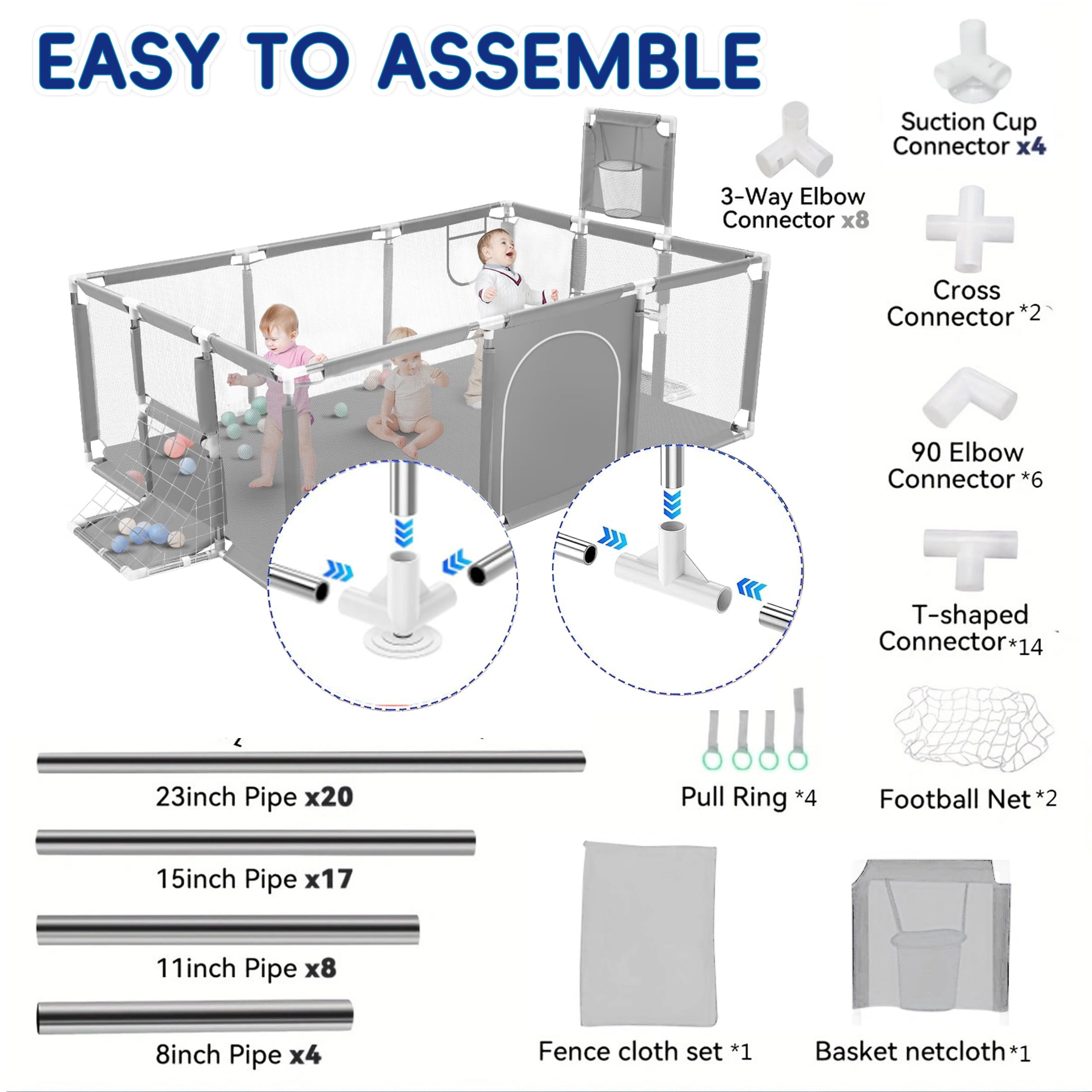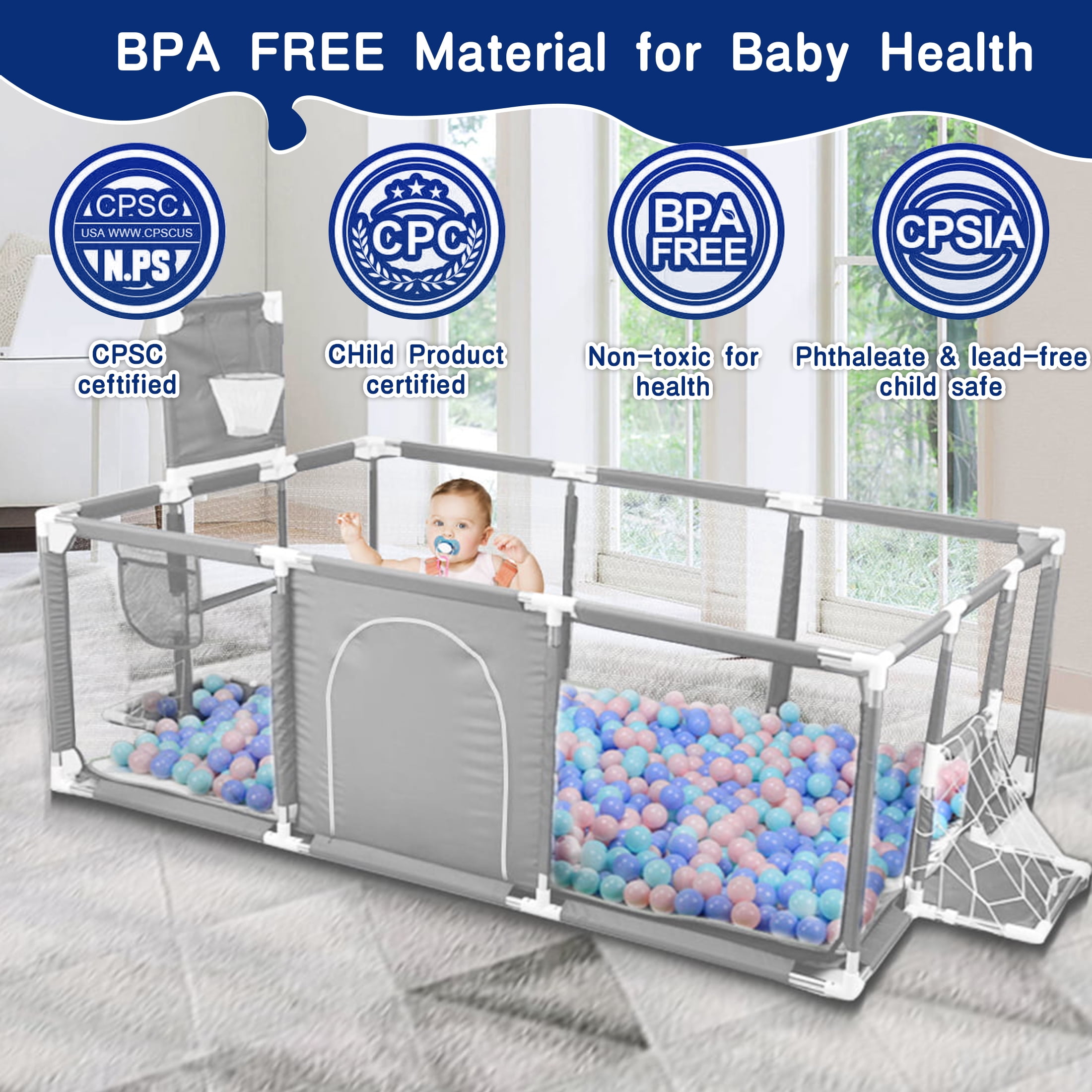 【Safety First Playpen】HioHa large baby playpen is made of high quality stainless steel tubing and sturdy fabric, the base is equipped with upgraded strong non-slip suction cups for a stable structure that won’t wobble due to your baby’s movement. The oxford fabric resists abrasion, and with the sturdy tubes and non-sharp joints, your baby is protected at all times 【Multi-Mesh Design】The baby play yard has a breathable, visual multi-mesh design that allows you to easily watch your baby’s every move and prevent dangerous positions. At the same time, your baby can see you while playing, making your baby feel more secure 【Throw or Kick Ball】With the basketball hoop and net, your baby will have fun playing on the baby playground. Whether it’s playing basketball or football, your child will have fun 【Free Your Hands】The playpen creates a safe space for your baby to play and crawl inside the child safety enclosure. Parents can look after their babies directly outside the fence and do their chores or chat or gossip without worrying about their babies’ safety! Baby’s play centre! Release stress for parents! 【Easy to Assemble and Carry】The baby playard is very easy to install and carry, no tools required, easy to assemble in just 10 minutes according to the instructions. You can use it in parks, beaches, lawns and many other places indoors and outdoors. When not in use, our playpen can also be stored in a space-saving bag 【Easy to Clean】The portable baby playpen is made of waterproof, double-stitched oxford fabric, easy to clean, milk or urine stains on it can be wiped with a cloth 【Fun in the Sun】The baby play area can also be the ultimate travelling playpen! You can easily set it up as a baby outdoor playpen for your child to enjoy the beautiful summer days Specification: Type: Baby playpen Colour: Gray Material: mesh + stainless steel tube + cloth Size: about 71*48*25inch Package Includes: 1 × drop-in baby enclosure, 4 × auxiliary pull tabs, 1 × storage bag (Marine ball, toys, play mat and other accessories are not included) Gender: Unisex Product Weight: 8.8 lb