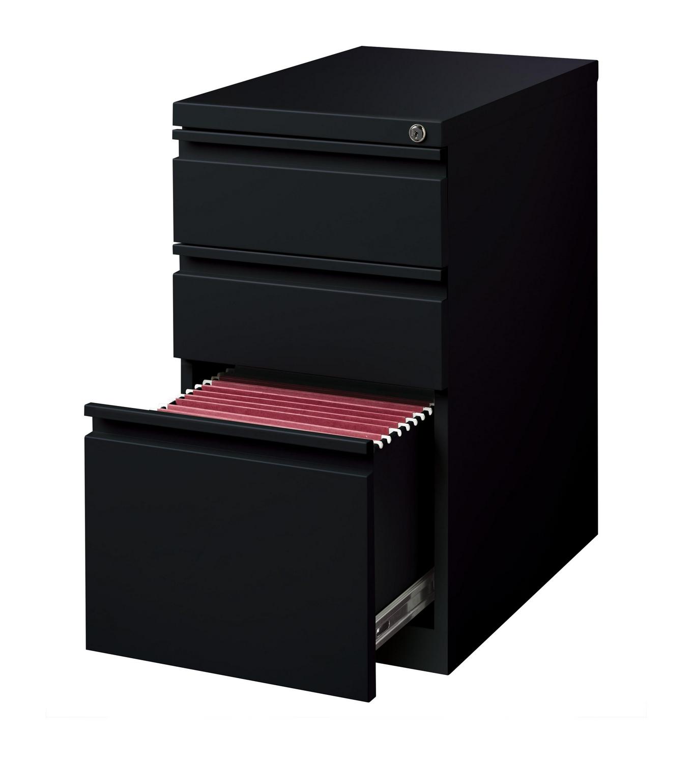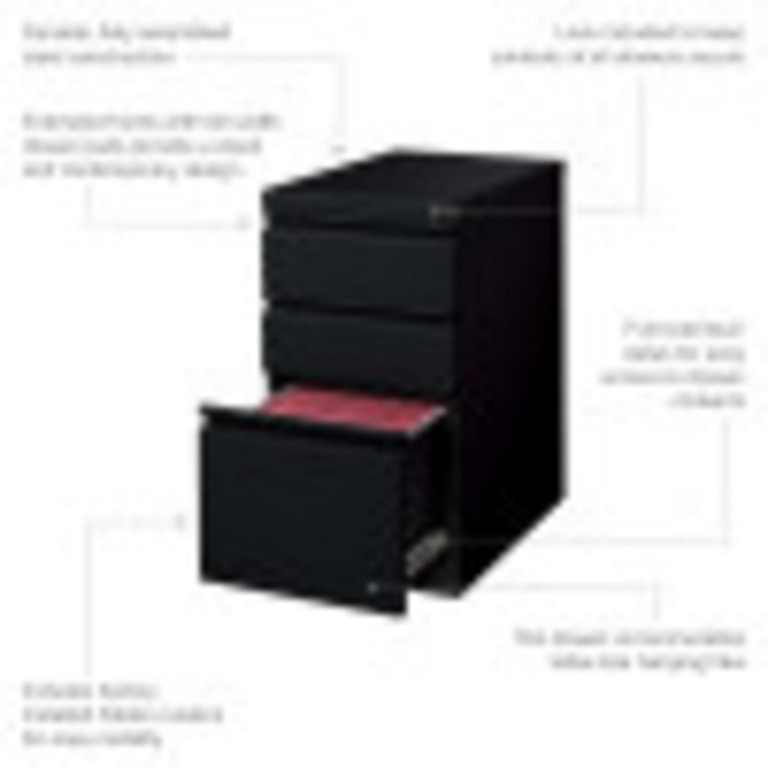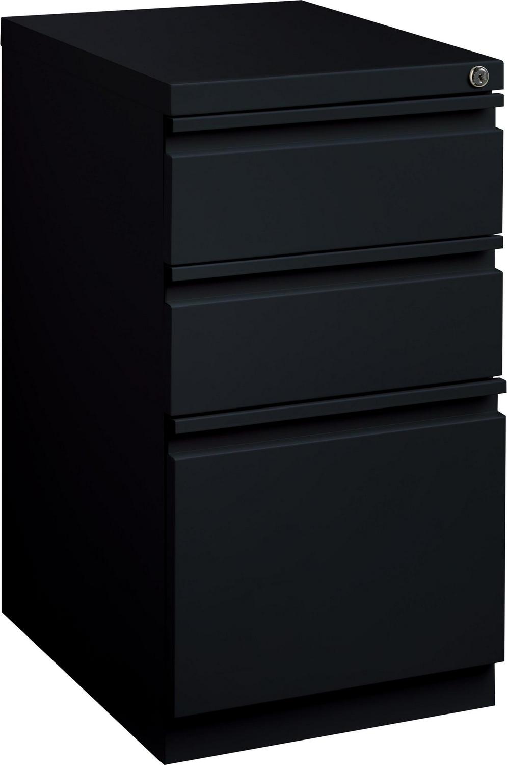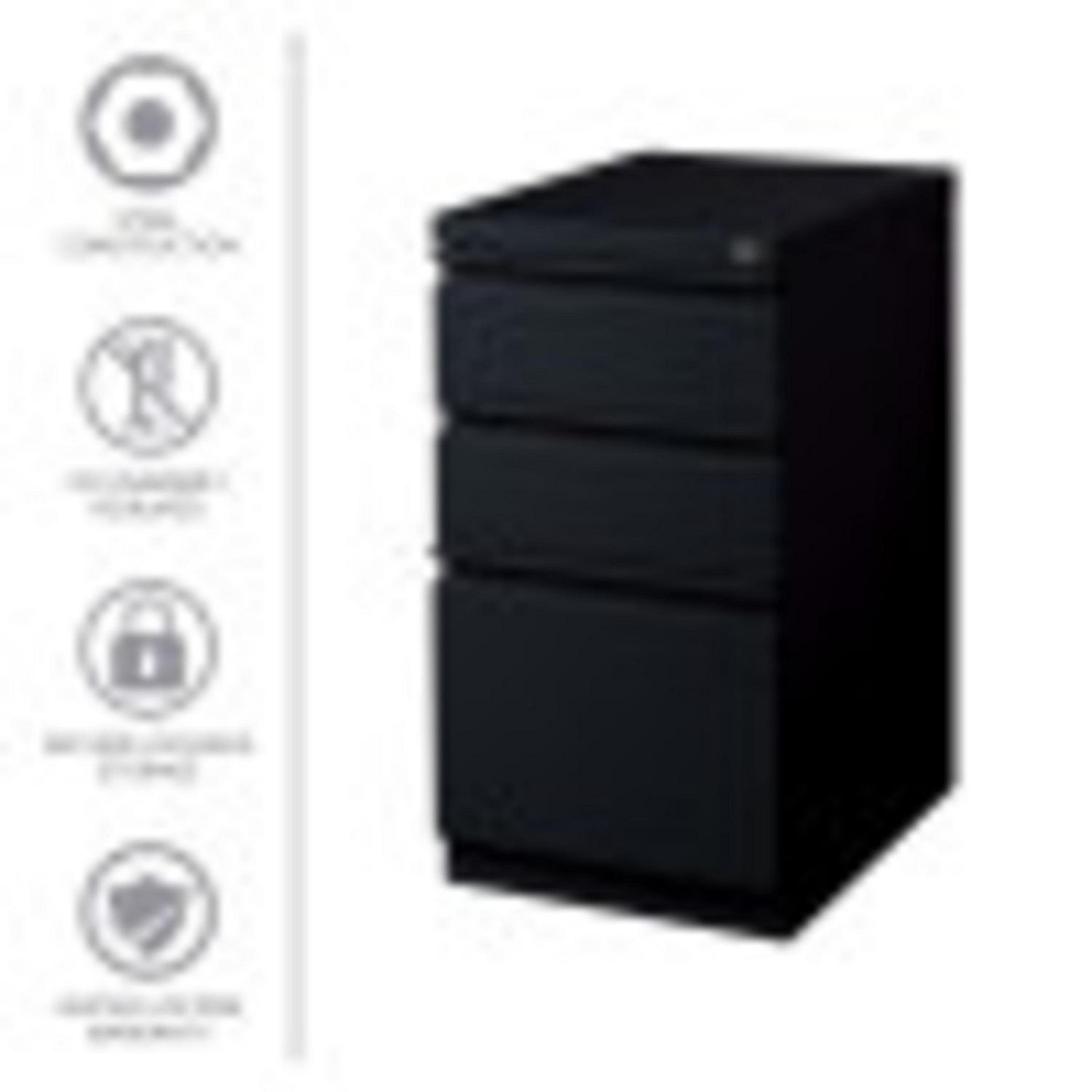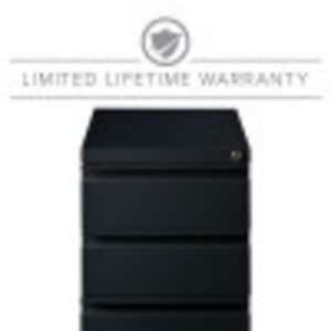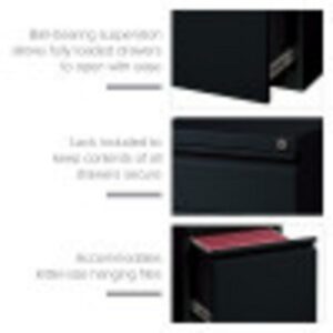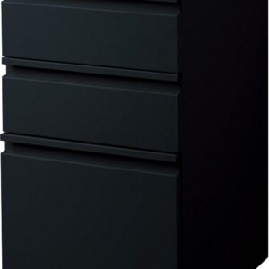 20-inch deep Mobile Pedestal File Cabinet with a three-drawer box-box-file drawer configuration is designed to provide storage solutions for your home or professional office. It features durable, fully assembled steel construction with a non-porous surface that is easy to clean. These commercial grade mobile pedestals come standard with factory installed hidden casters, full extension drawers, counterweights, and a core-removable file cabinet lock for security. The file drawer accommodates letter-size hanging files. The commercial grade ball-bearing drawer slide suspension ensures a smooth and quiet drawer performance. Extended fronts with full-width drawer pulls provide a sleek and contemporary design. These metal file cabinets are available in multiple colors to enrich your workspace. It’s 27.75″ height allows these units to roll under most work surfaces and office desks. Limited Lifetime Warranty. Unit meets or exceeds ANSI-BIFMA industry standards. Greenguard Gold Certified. Color: Black