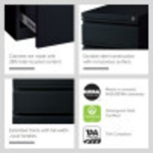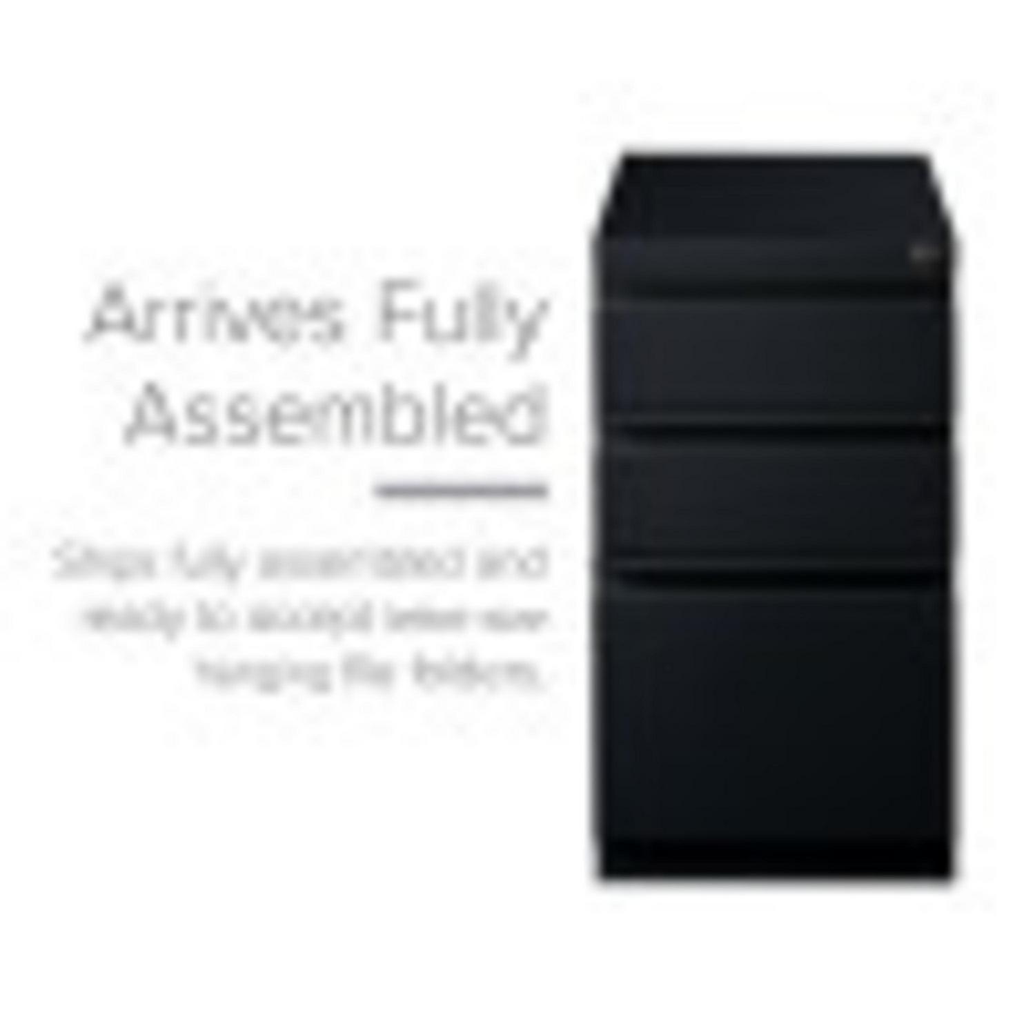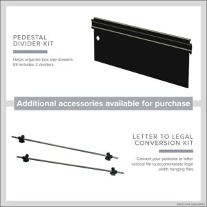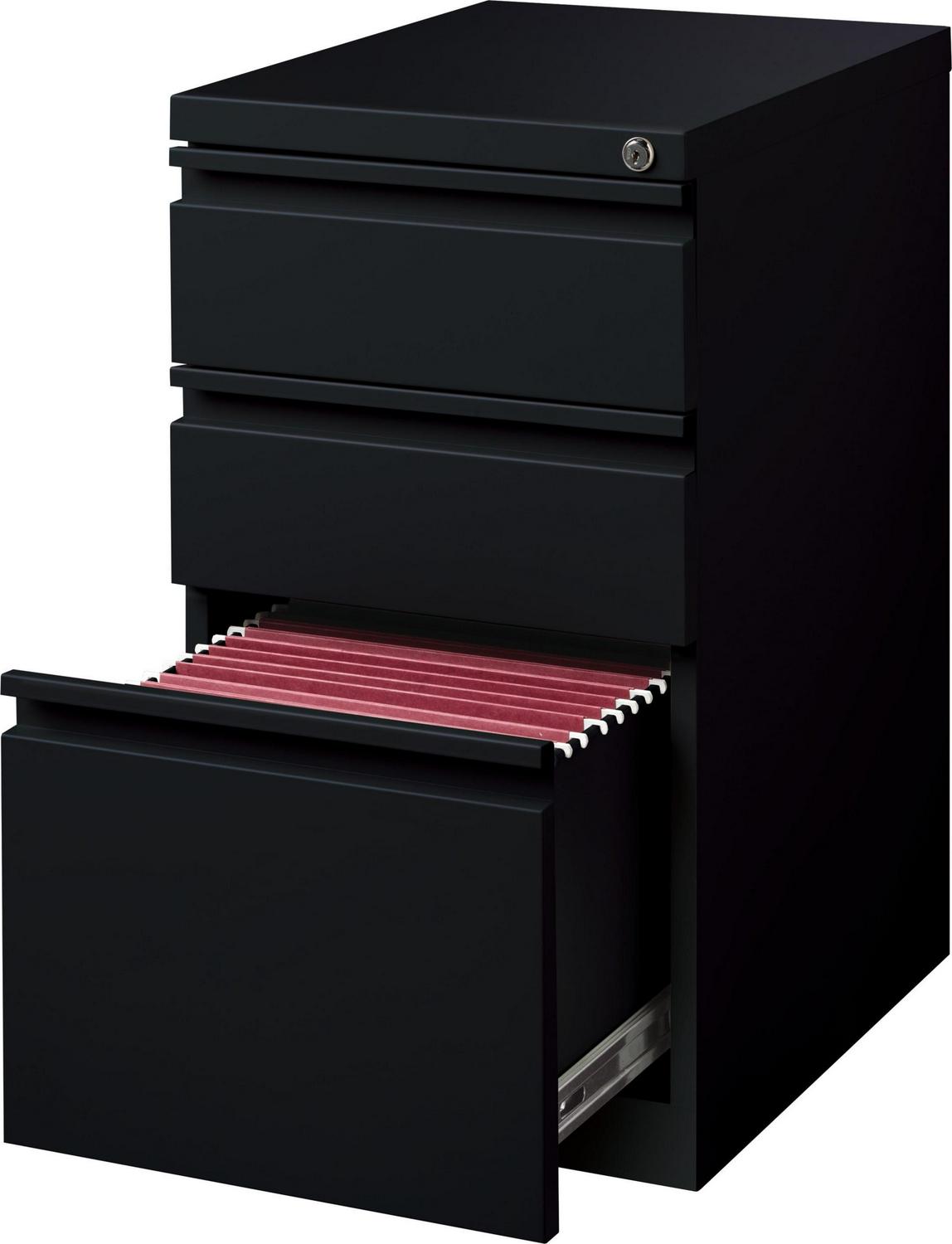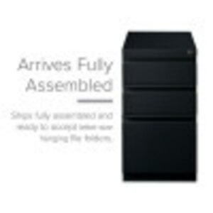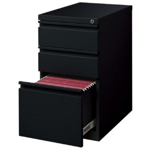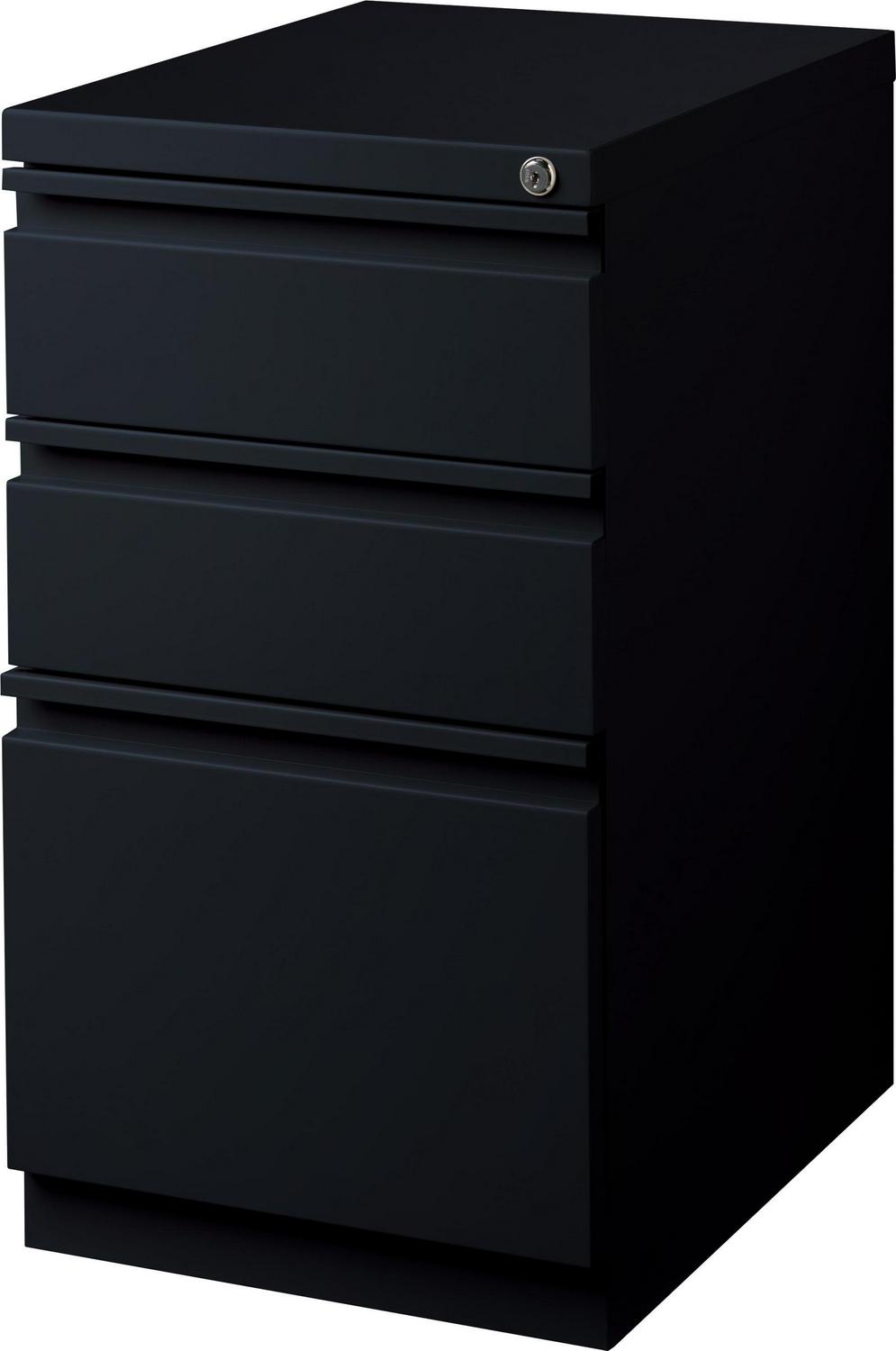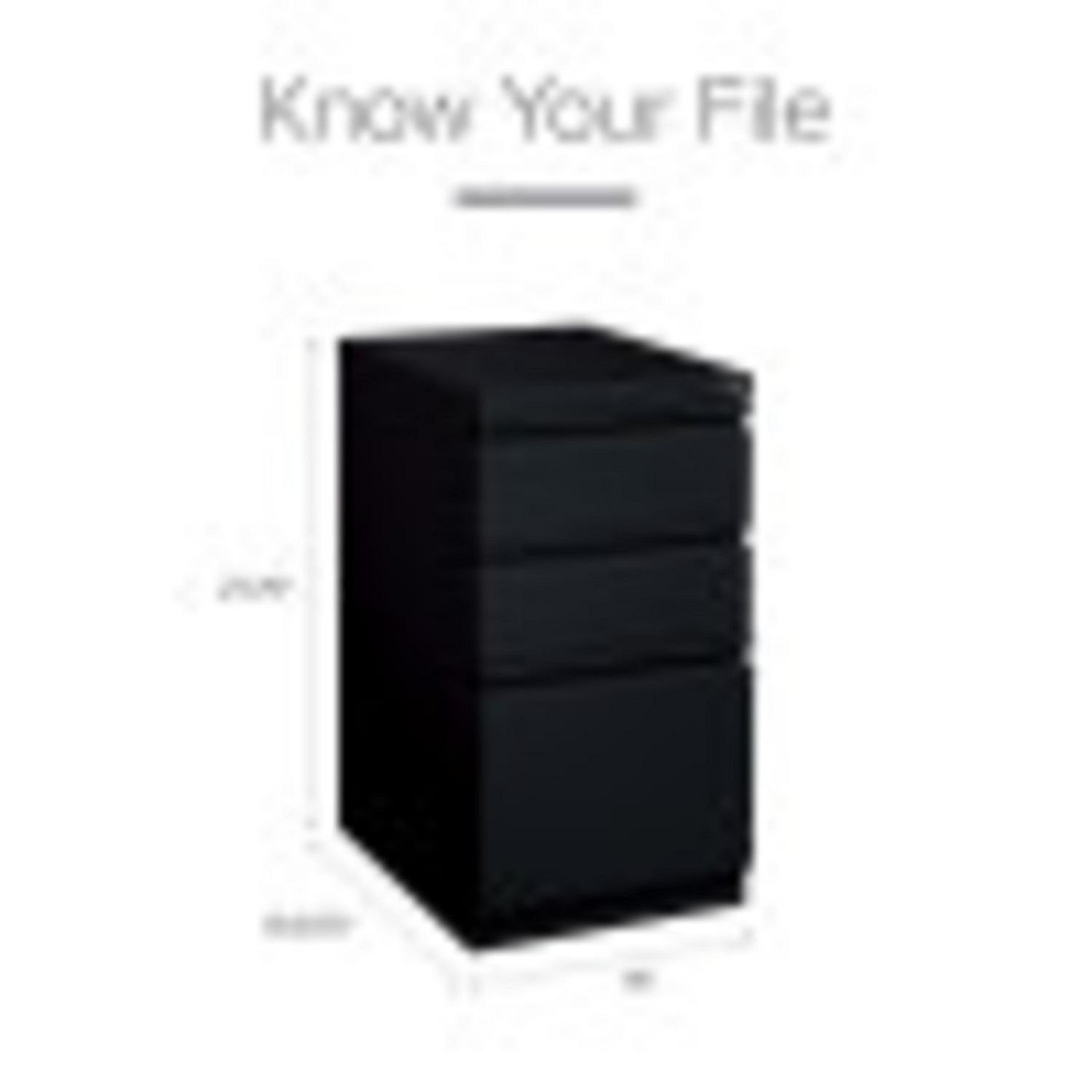 20-inch deep Mobile Pedestal File Cabinet with a three-drawer box-box-file drawer configuration is designed to provide storage solutions for your home or professional office. It features durable, fully assembled steel construction with a non-porous surface that is easy to clean. These commercial grade mobile pedestals come standard with factory installed hidden casters, full extension drawers, counterweights, and a core-removable file cabinet lock for security. The file drawer accommodates letter-size hanging files. The commercial grade ball-bearing drawer slide suspension ensures a smooth and quiet drawer performance. Extended fronts with full-width drawer pulls provide a sleek and contemporary design. These metal file cabinets are available in multiple colors to enrich your workspace. It’s 27.75″ height allows these units to roll under most work surfaces and office desks. Limited Lifetime Warranty. Unit meets or exceeds ANSI-BIFMA industry standards. Greenguard Gold Certified. Color: Black