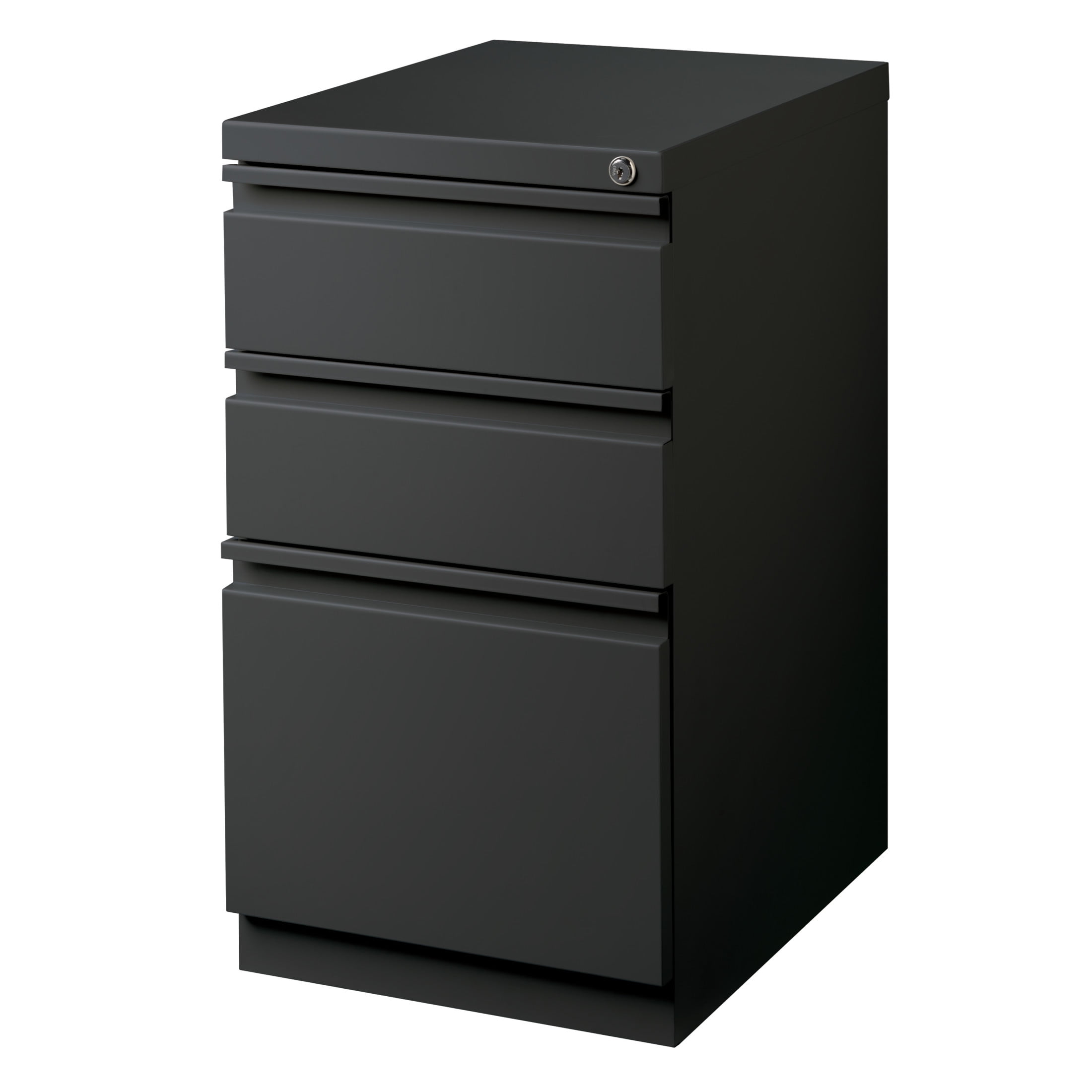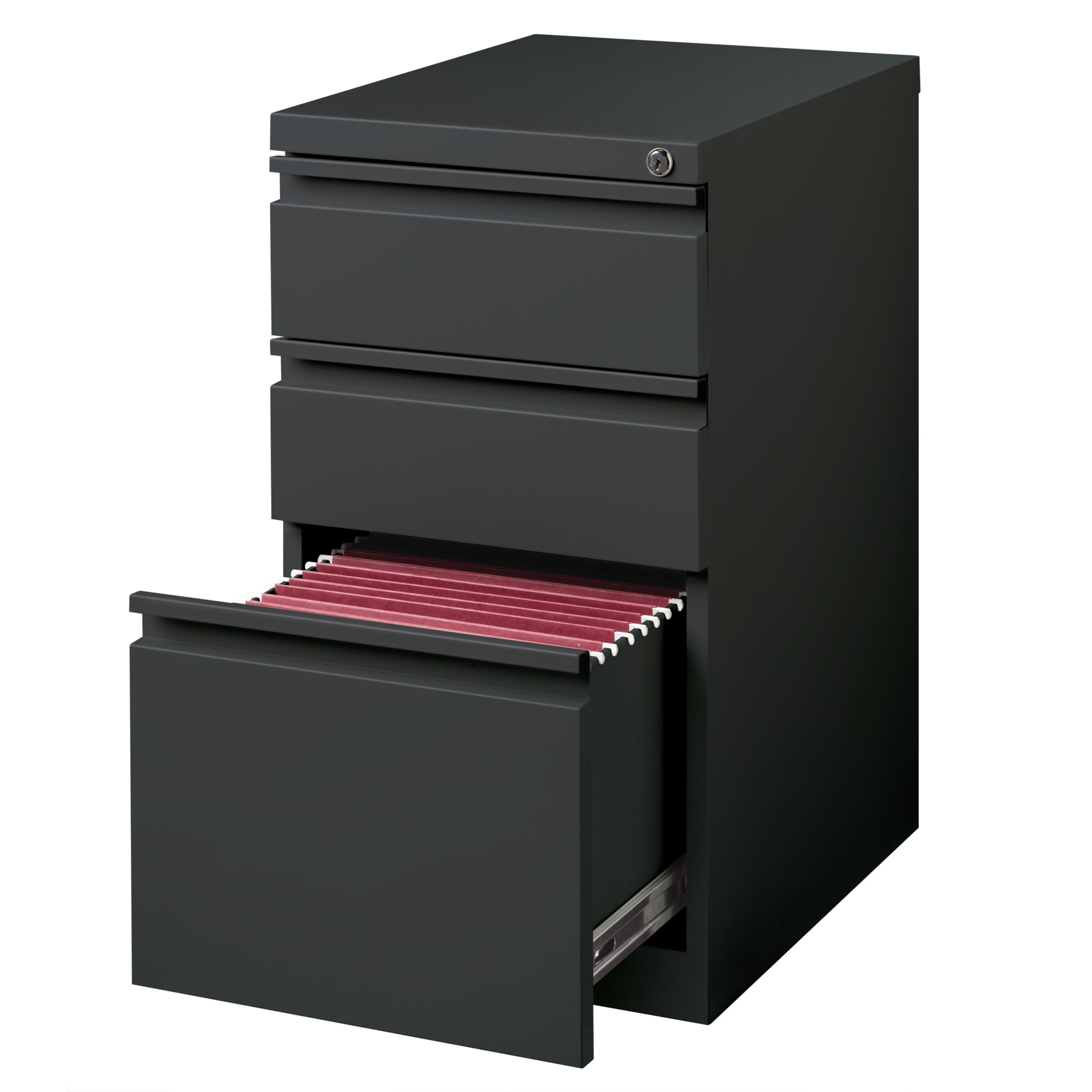 20-inch deep Mobile Pedestal File Cabinet with a three-drawer box-box-file drawer configuration is designed to provide storage solutions for your home or professional office. It features durable, fully assembled steel construction with a non-porous surface that is easy to clean. These commercial grade mobile pedestals come standard with factory installed hidden casters, full extension drawers, counterweights, and a core-removable file cabinet lock for security. The file drawer accommodates letter-size hanging files. The commercial grade ball-bearing drawer slide suspension ensures a smooth and quiet drawer performance. Extended fronts with full-width drawer pulls provide a sleek and contemporary design. These metal file cabinets are available in multiple colors to enrich your workspace. It’s 27.75″ height allows these units to roll under most work surfaces and office desks. Limited Lifetime Warranty. Unit meets or exceeds ANSI-BIFMA industry standards. Greenguard Gold Certified. Color: Charcoal