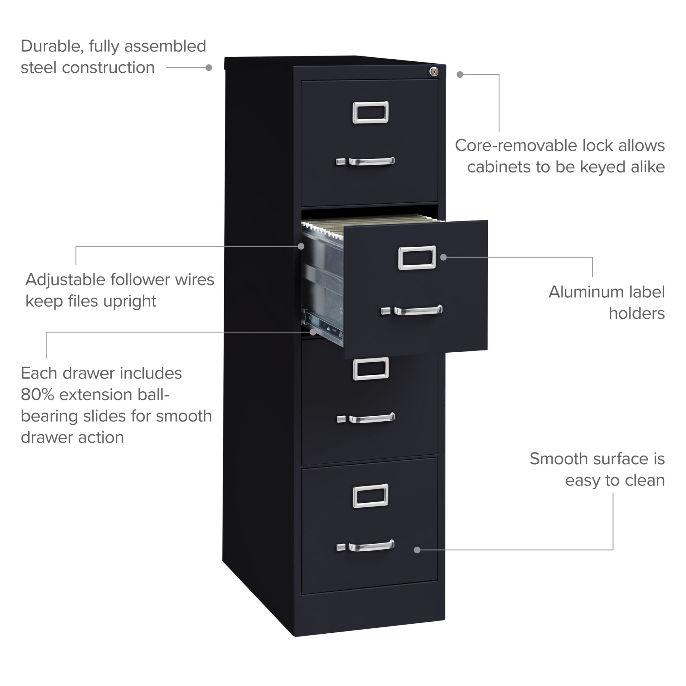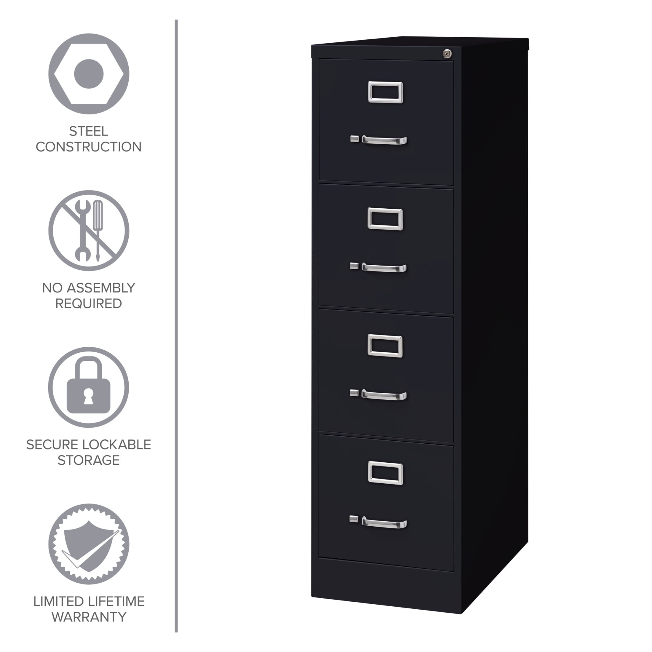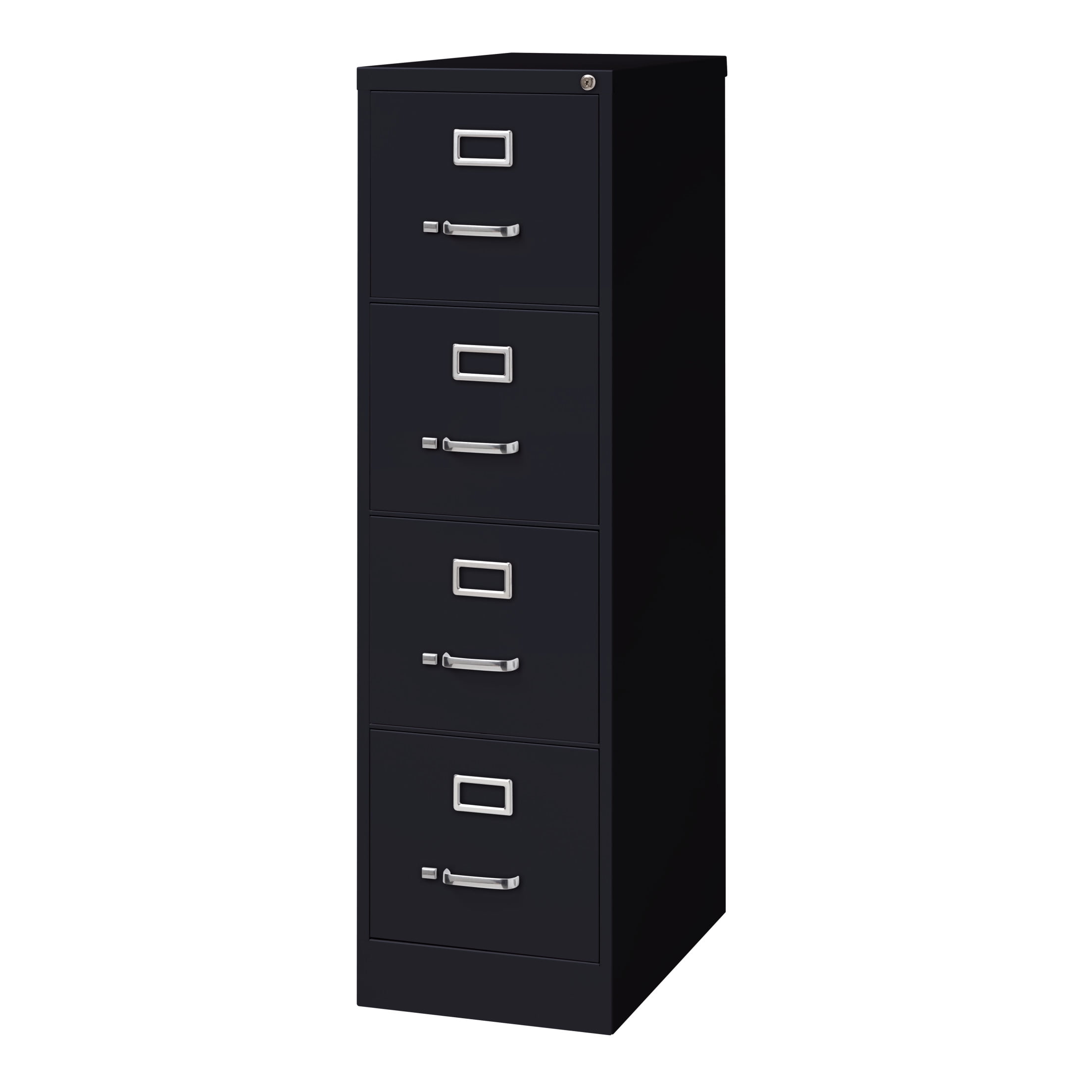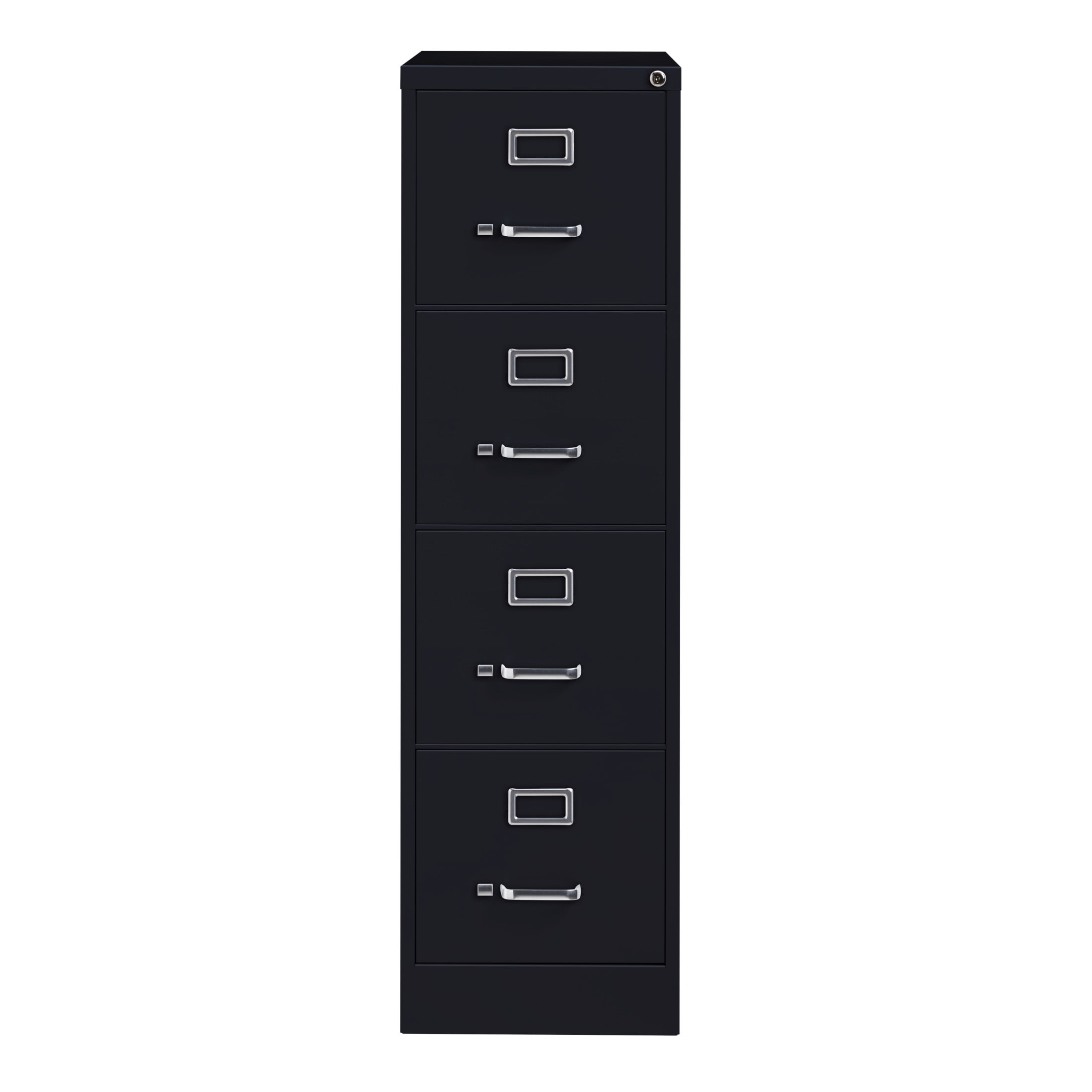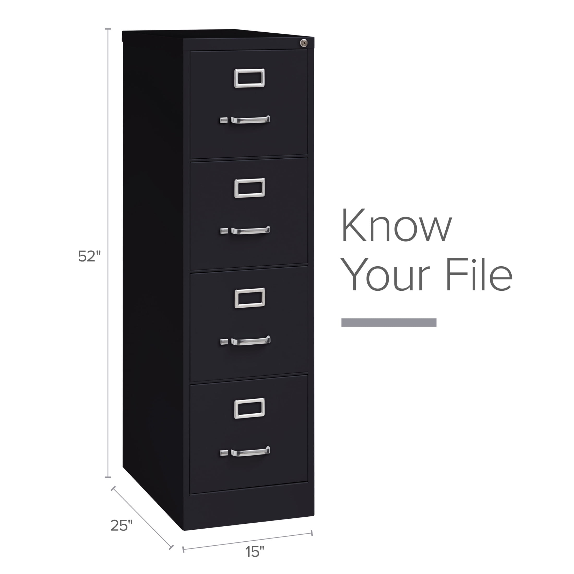 25-inch deep metal four-drawer, letter width, commercial grade vertical file cabinets in black are perfect for business, educational, or personal offices. These cabinets feature a classic design and are constructed with high quality durable materials that are suitable for heavy-duty use. Ships fully assembled and is ready to accept letter width hanging file folders. Non-porous surface is easy to clean. Each drawer includes full extension ball-bearing slides for smooth drawer action. Even fully loaded, these drawers open with ease. Adjustable follower blocks keep files upright. The aluminum handles and label holder are durable and functional making it easy to access and label drawer contents. The included core-removable lock allows cabinets to be keyed alike. Designed to meet or exceed ANSI/BIFMA industry standards for performance and workmanship. Made with 28% total recycled content. Backed by a Limited Lifetime Warranty. TAA Compliant. Greenguard Gold certified for indoor air quality. Features: [Suspension]: Commercial grade ball-bearing suspension allows fully loaded drawers to open with ease [Security]: Core-removable lock, follower blocks, aluminum handles and label holders included [Lock]: Lock included to keep contents of all drawers secure [Warranty]: Limited Lifetime Warranty [Standards]: Meets or exceeds ANSI/BIFMA standards [Certification]: Greenguard Gold Certified Specifications: Product Dimensions: 52.00″ H X 15.00″ W X 25.00″ D Product Weight: 67 Assembly Required: No Assembly details: To ensure the key for this product does not get loose, slide the thumb latch on left side of handle to the right, at the same time, pull the drawer open. Keys are hanging inside the cabinet by the locking mechanism.