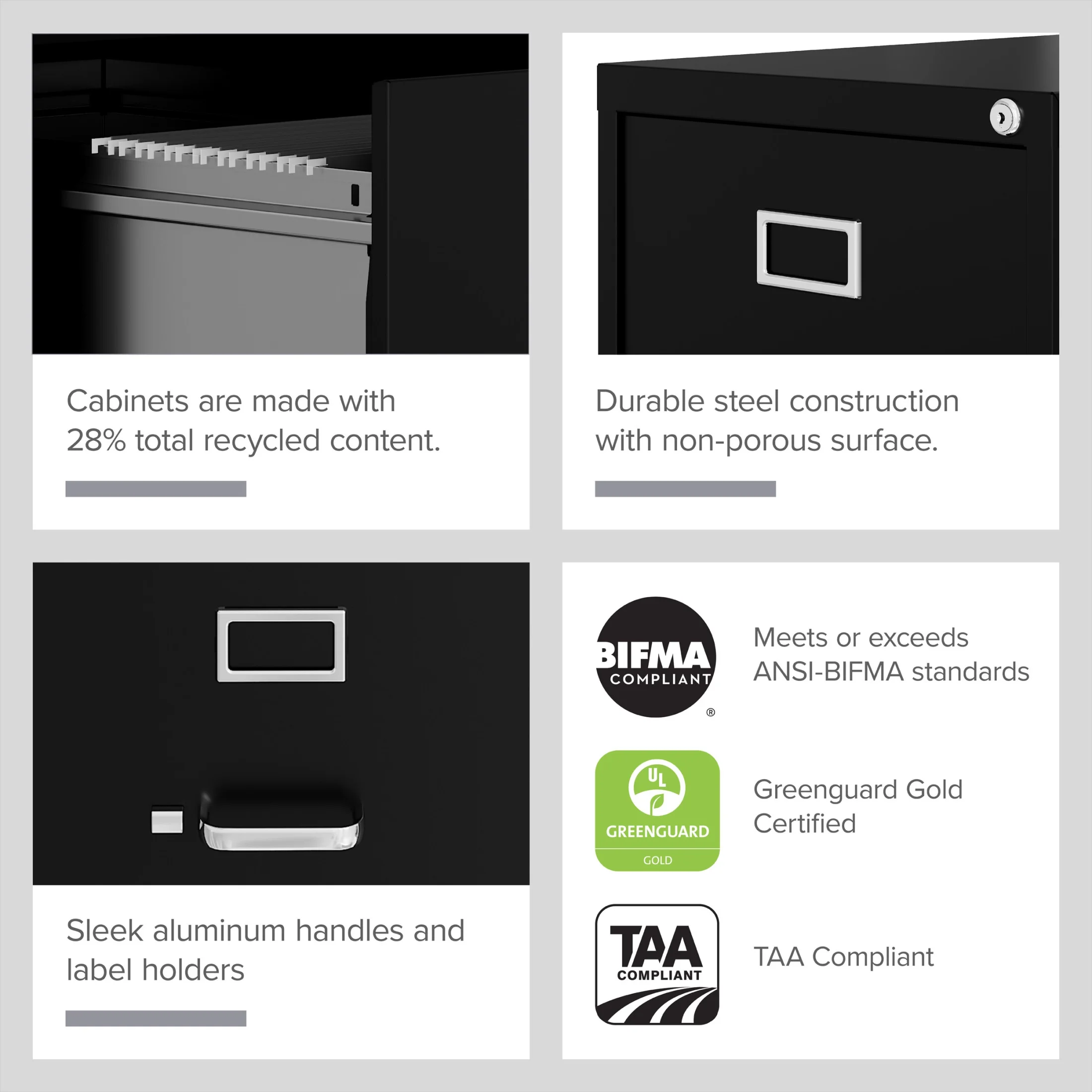Commercial grade ball-bearing suspension allows fully loaded drawers to open with ease Durable, fully assembled steel construction with non-porous surface is easy to clean Follower wires keep files upright and organized Lock included to keep contents of all drawers secure Aluminum handles and label holders Accommodates letter-size hanging files Limited Lifetime Warranty Meets or exceeds ANSI-BIFMA standards Greenguard Gold Certified TAA Compliant Hirsh 25″ Deep 4 Drawer Letter Width Metal Vertical File Cabinet, Commercial Grade, Black