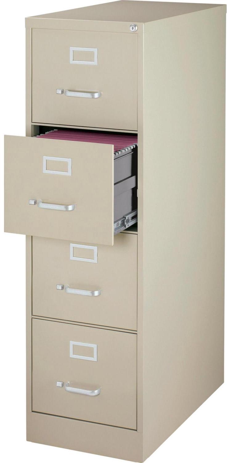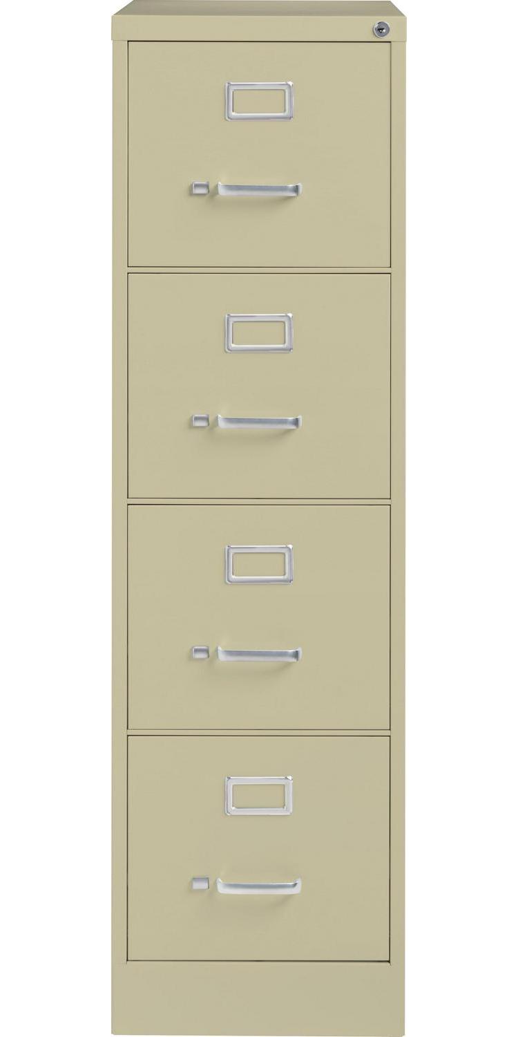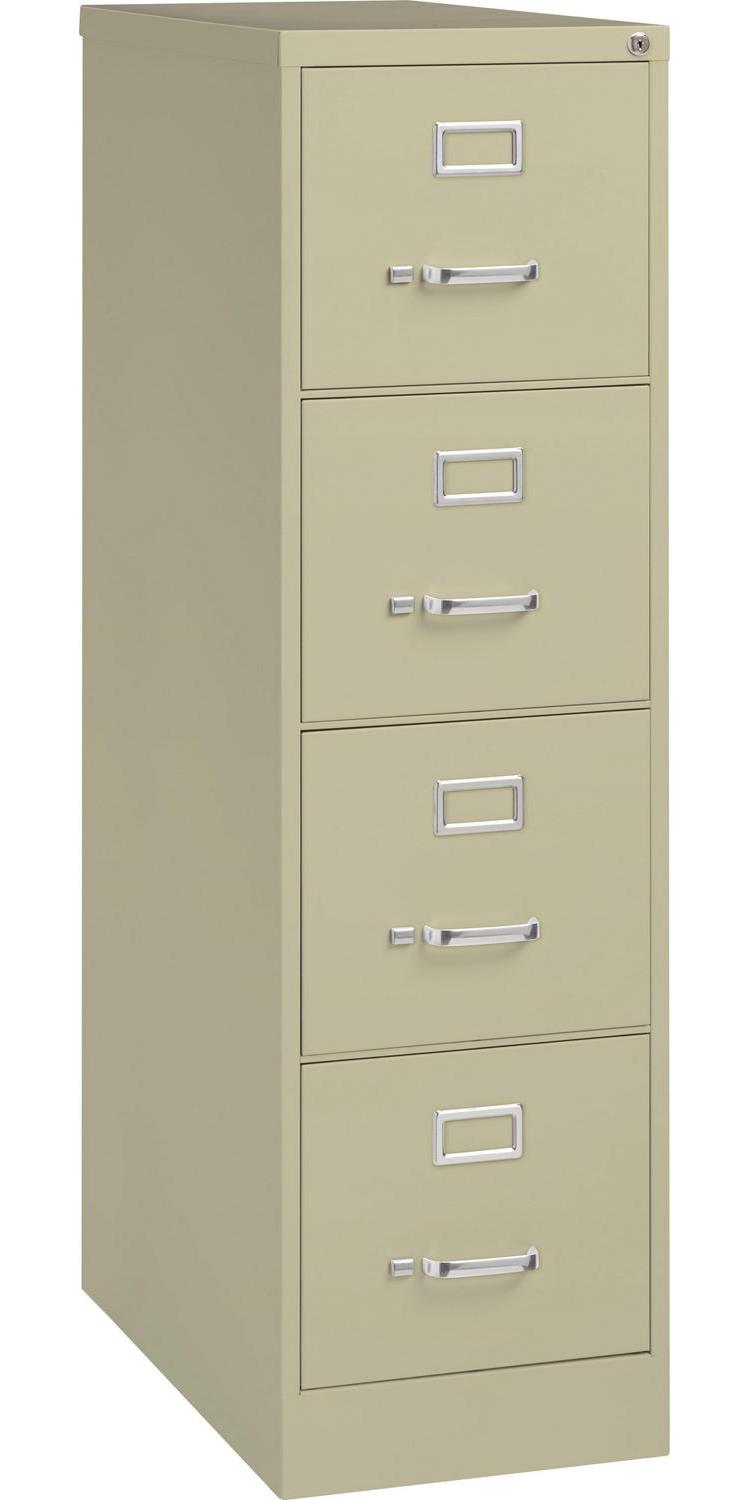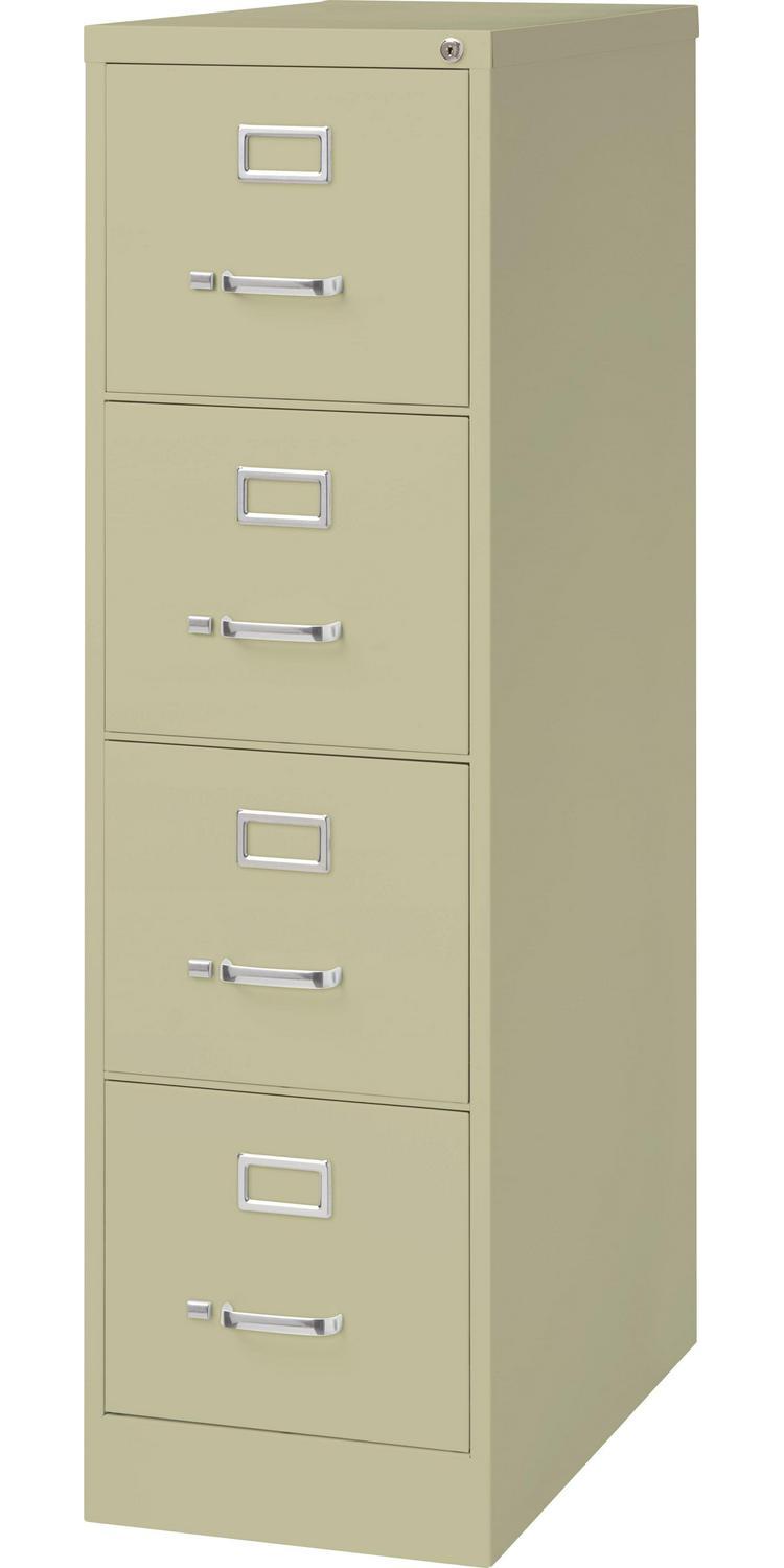 26.5″ deep metal, 4 drawer, letter width, commercial grade vertical file cabinets are perfect for business, educational, or personal offices. These cabinets feature a classic design and are constructed with high quality durable materials that are suitable for heavy-duty use. Ships fully assembled and is ready to accept letter width hanging file folders. Smooth surface is easy to clean. Each drawer includes full extension ball-bearing slides for smooth drawer action. Even fully loaded, these drawers open with ease. Adjustable follower blocks keep files upright. The included core-removable lock allows cabinets to be keyed alike. Designed to meet or exceed ANSI-BIFMA industry standards for performance and workmanship. Made with 28% total recycled content. Backed by a Limited Lifetime Warranty. Color: Putty