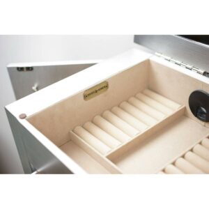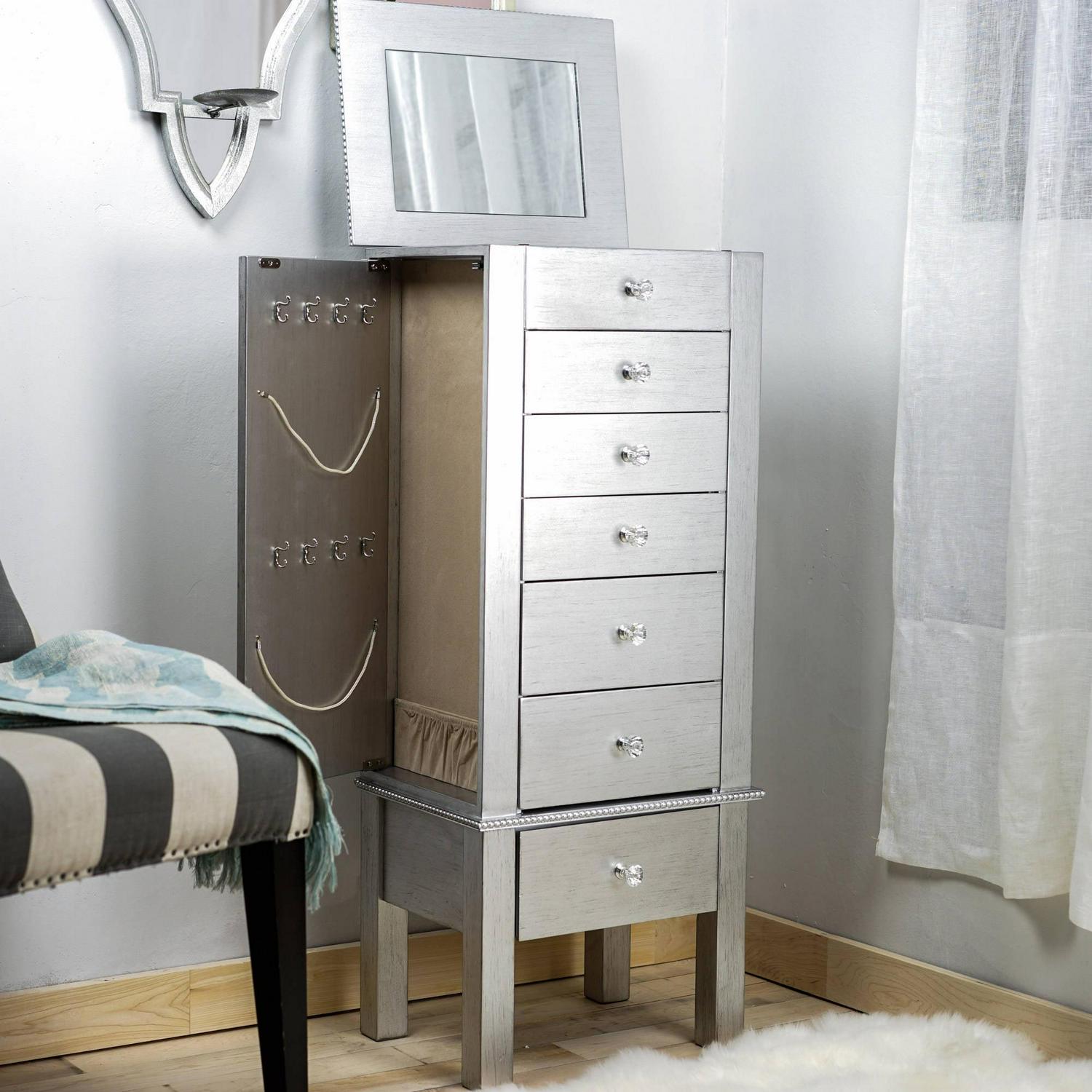 The Crystal Jewelry Armoire is more than just a jewelry chest. It’s a true statement piece. With its stunning, silver metallic finish, sleek design, jewel-like faceted drawer pulls, and French-style beaded trim, this piece is the perfect piece for the girl who appreciates a little glitz and glamour. With 6 spacious drawers featuring both divided compartments and open storage space, there is sure to be a place for each item in your extensive jewelry collection. Open the hidden side doors, and you’ll find jewelry hooks that keep your necklaces tucked away and tangle-free. A lift of the top lid reveals ring rolls, divided compartments, and a vanity mirror that allows you to check your accessorizing before your night out. With anti-tarnish felt lining the entire jewelry armoire, your pieces will be protected from scratching, tarnish, and damage, ensuring that they remain in pristine condition.