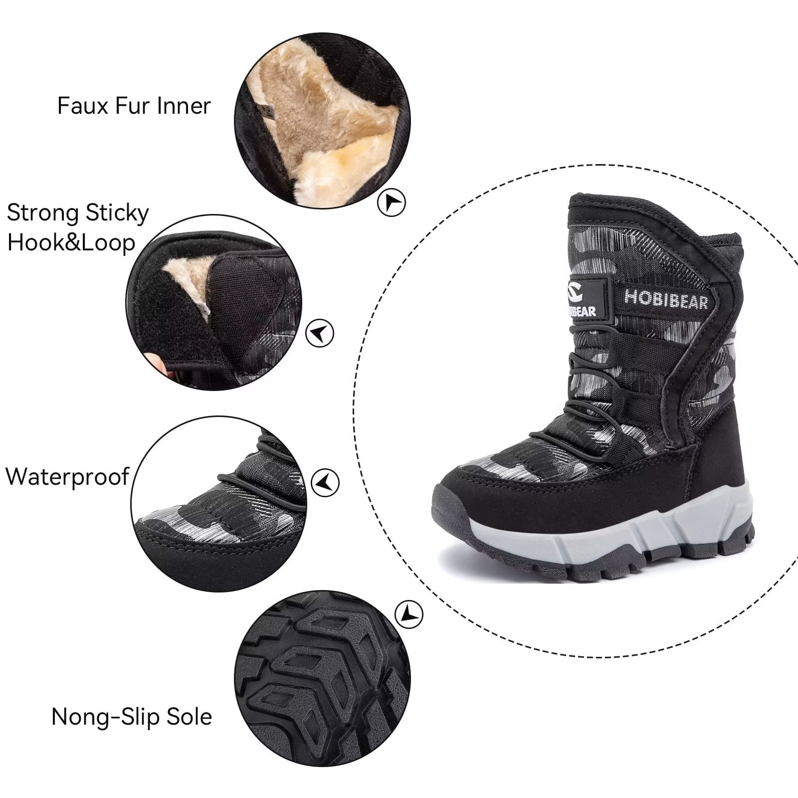 Upper Material: Waterproof Fabric Sole Material: Synthetic EVA Water-Resistant Upper: Boys girls snow boot features durable textile upper for waterproof and synthetic toe cap for anti-collision. Stay Warm And Dry: Soft plush faux fur lining keeps feet toasty warm and comfortable all day long. Durable Non-Slip Sole: Sturdy antiskid flexible outsole offers superior traction and a lightweight fit, great for kids’ everyday wear. Easy To Put On And Take Off: Hook & loop side opening makes these snow boots so much easier for kids to put them on by themselves. And provides kids with a snug and secure fit. Use Occasion: It’s very suitable for cold weather winter days, great for activities like camping hiking running playing sledding ski trips and it’s a good choice for birthday and holiday gifts. Thank you for your trust in HOBIBEAR, and wish you a happy shopping!!!