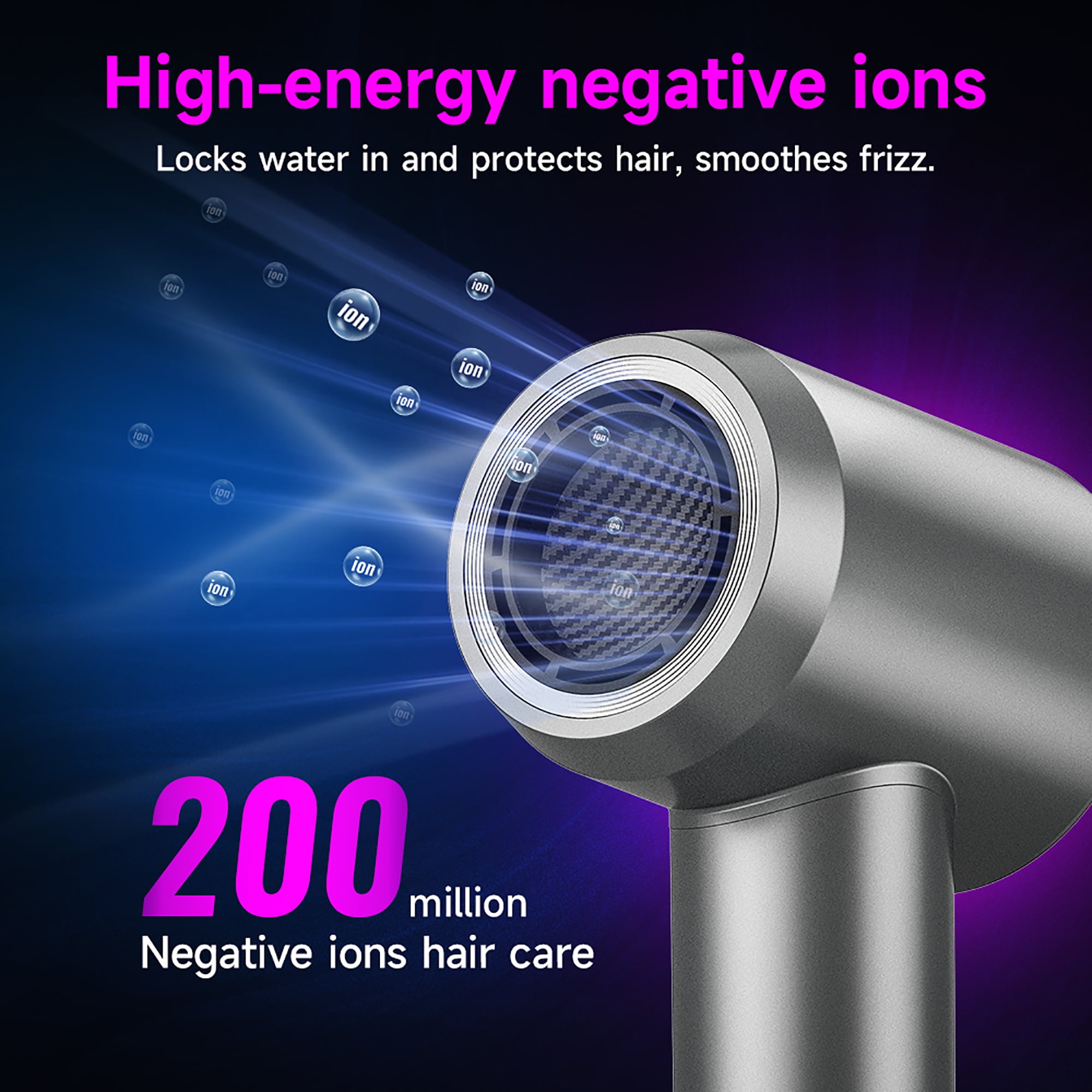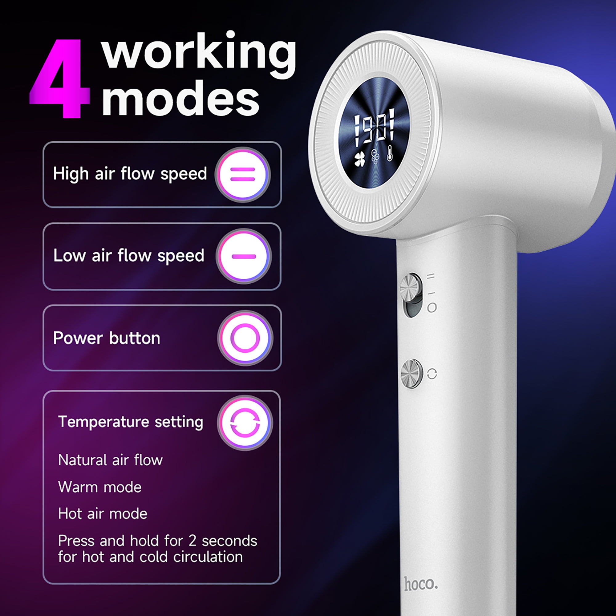 HOCO High-speed Negative Ion Hair Dryer, suitable for all hair types, 4 working modes with 200 million negative ions hair care,locks water in and protects hair. With LED HD Display for easy control,and with Magnetic suction nozzle,suitable for all hair types.