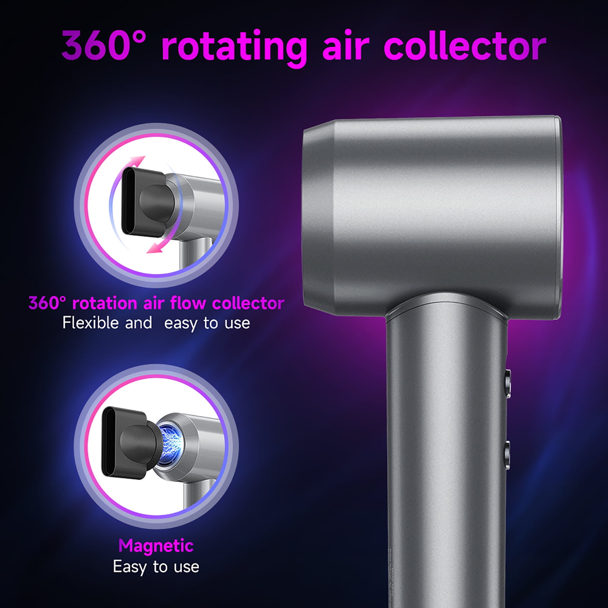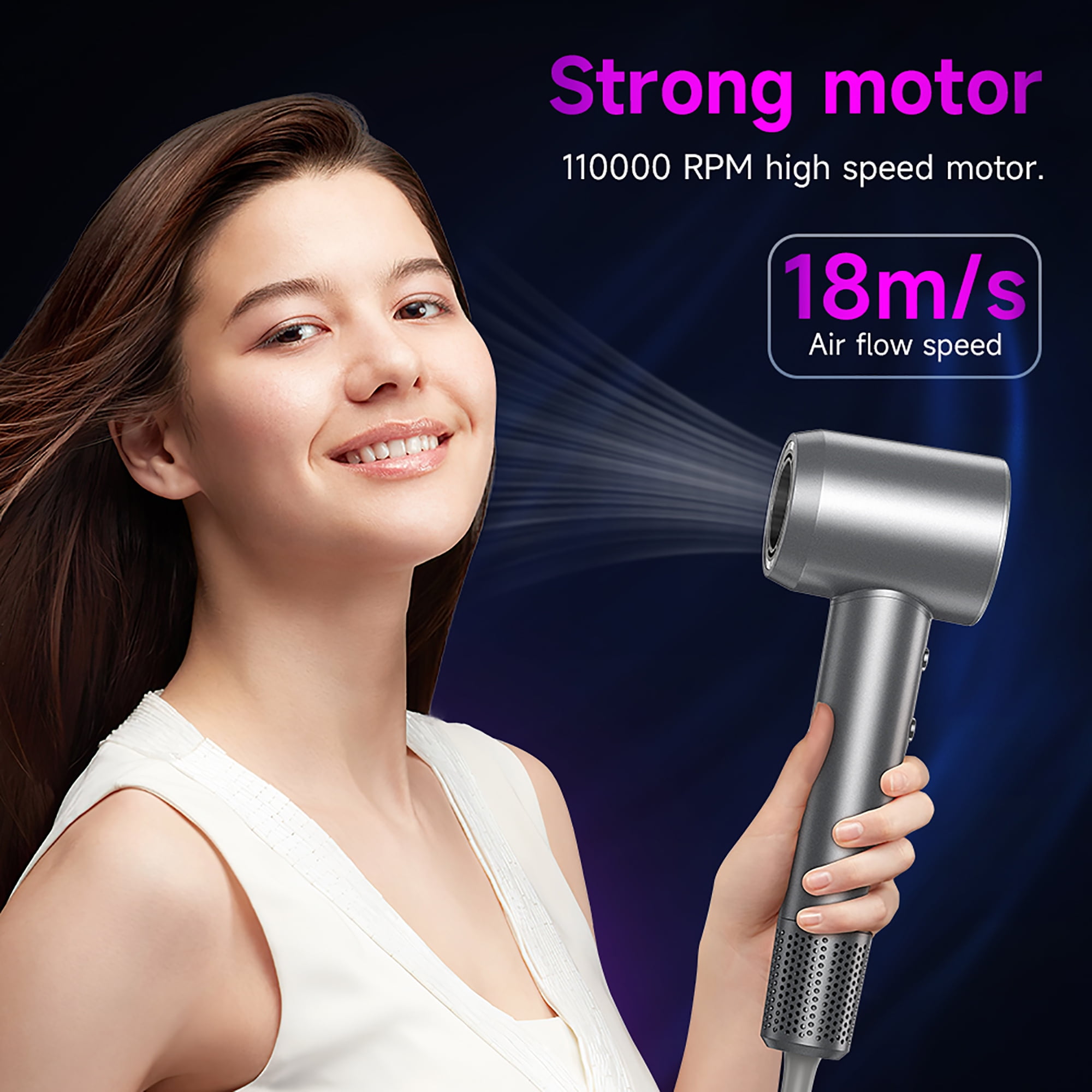 【LED HD Display】 The hairdryer features an HD LED display for easy control. Switch between 2 speed settings (low/fast) and 4 temperature settings with the touch of a button.Providing a personalized drying experience. 【High-speed hair dryer】 200 million negative ions hair care 1600w Power 4 working modes with Magnetic suction nozzle 【High-energy negative ions】 Locks water in and protects hair, smoothes frizz. 200million Negative ions hair care 【Strong motor】 110000 RPM high speed motor, 18m/s Air flow speed 【Suitable for all hair types】 Short hair Average length Long hair 【4 working modes】 High air flow speed Low air flow speed Power button Temperature setting Natural air flow Warm mode Hot air mode Press and hold for 2 seconds for hot and cold circulation 【360° rotation air flow collector】 Flexible and easy to use Magnetic suction nozzle Easy to use Specifications: 1. Material; PC 2. Size: 25.5*9*7cm; Weight: 490g; Cable length: 1.8m European plug 3. Motor speed: 110000RPM/ min 4. Power: 1600W 5. Air flow speed/temperature: 2 speeds /4 temperatures (cold, warm, hot, circulating wind temperature) 620 million negative ion hair care 7. Accessories: smooth air nozzle Size: Packing size:37*17.2*8.9cm Product size:25.5*9*7cm